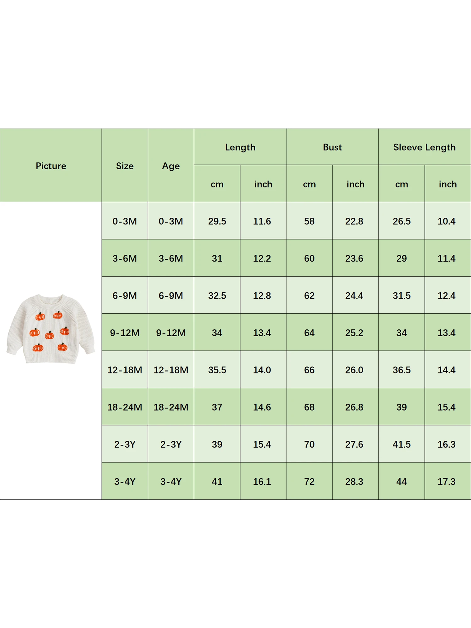 Suéter de Halloween para bebé, suéter informal con bordado de calabaza, cuello redondo, jersey infantil, prendas de punto para niños pequeños, ropa cálidaCaracterísticasRopa de bebé de Halloween con bordado de calabaza, manga larga, cuello redondo; Jersey para niño pequeño, unisex, sencillo y moderno, perfecto para mantener a tus hijos abrigados y cómodos en el clima frío.Adecuado para uso diario casual, hogar, reuniones familiares, Navidad, fiestas, iglesia, vacaciones, interior, exterior, vacaciones, fotografía.Tamaño (cm)0-3M Longitud: 29,5 Busto: 58 Manga: 26,5 Edad recomendada: 0-3 meses3-6M Longitud: 31 Busto: 60 Manga: 29 Edad recomendada: 3-6 meses6-9M Longitud: 32,5 Busto: 62 Manga: 31,5 Edad recomendada: 6-9 meses9-12M Longitud: 34 Busto: 64 Manga: 34 Edad recomendada: 9-12 meses12-18M Longitud: 35,5 Busto: 66 Manga: 36,5 Edad recomendada: 12-18 meses18-24M Longitud: 37 Busto: 68 Manga: 39 Edad recomendada: 18-24 meses2-3Y Longitud: 39 Busto: 70 Manga: 41,5 Edad recomendada: 2-3 años3-4Y Longitud: 41 Busto: 72 Manga: 44 Edad recomendada: 3-4 añosTamaño (pulgadas)0-3M Longitud: 11,61 Busto: 22,83 Manga: 10,43 Edad recomendada: 0-3 meses3-6M Longitud: 12,2 Busto: 23,62 Manga: 11,42 Edad recomendada: 3-6 meses6-9M Longitud: 12,8 Busto: 24,41 Manga: 12,4 Edad recomendada: 6-9 meses9-12M Longitud: 13,39 Busto: 25,2 Manga: 13,39 Edad recomendada: 9-12 meses12-18M Longitud: 13,98 Busto: 25,98 Manga: 14,37 Edad recomendada: 12-18 meses18-24M Longitud: 14,57 Busto: 26,77 Manga: 15,35 Edad recomendada: 18-24 meses2-3 años Longitud: 15,35 Busto: 27,56 Manga: 16.34 Edad recomendada: 2-3 años3-4Y Longitud: 16.14 Busto: 28,35 Manga: 17.32 Edad recomendada: 3-4 añosEspecificaciones:Condición: 100% nuevoMaterial: 95% algodón 5% poliésterTemporada: Otoño Primavera InviernoGénero: UnisexOcasión: DiarioEstilo: ModaPatrón: bordado de calabazaCuidado de la ropa: Se recomienda lavar a mano o a máquina a baja temperatura, no usar lejía, colgar ni secar al aire.Contenido del paquete:1 * suéterNota:Puede haber una desviación de 1 a 2 cm en diferentes tamaños, ubicaciones y estiramiento de las telas.La tabla de tallas es solo como referencia; Puede haber una pequeña diferencia con lo que obtienes.El color puede ser más claro o más oscuro debido a las diferentes pantallas de PC.