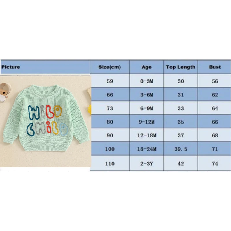 Suéter de punto de otoño para niñas y niños, jersey de punto con bordado de letras y cuello redondo de manga largaTamaño (cm)0-3M Longitud: 30 Busto: 56 Edad recomendada: 0-3 meses3-6M Longitud: 31 Busto: 62 Edad recomendada: 3-6 meses6-9M Longitud: 33 Busto: 64 Edad recomendada: 6-9 meses9-12M Longitud: 35 Busto: 66 Edad recomendada: 9-12 meses12-18M Longitud: 37 Busto: 68 Edad recomendada: 12-18 meses18-24M Longitud: 39,5 Busto: 71 Edad recomendada: 18-24 meses2-3 años Longitud: 42 Busto: 74 Edad recomendada: 2-3 añosTamaño (pulgadas)0-3M Longitud: 11,81 Busto: 22,05 Edad recomendada: 0-3 meses3-6M Longitud: 12,2 Busto: 24,41 Edad recomendada: 3-6 meses6-9M Longitud: 12,99 Busto: 25,2 Edad recomendada: 6-9 meses9-12M Longitud: 13,78 Busto: 25,98 Edad recomendada: 9-12 meses12-18M Longitud: 14,57 Busto: 26,77 Edad recomendada: 12-18 meses18-24M Longitud: 15,55 Busto: 27,95 Edad recomendada: 18-24 meses2-3 años Longitud: 16,54 Busto: 29.13 Edad recomendada: 2-3 añosEspecificación:Material: 95% algodón, 5% poliésterLongitud de la manga: largaTipo de patrón: Bordado de letrasGénero: Niña/NiñoTipo de artículo: TopsPaquete incluido:1 suéter.Consejos amigables:1.Por favor permita una diferencia del 2-3% según la medición manual.2.Consulte cuidadosamente la tabla de medidas antes de comprar el artículo.(1 pulgada=2,54 cm)3.Tenga en cuenta que debe aceptarse una ligera diferencia de color debido a la luz y la pantalla.Gracias.Promesa:Si el producto tiene algún problema de calidad, háganoslo saber, lo ayudaremos a resolver el problema lo más rápido posible.