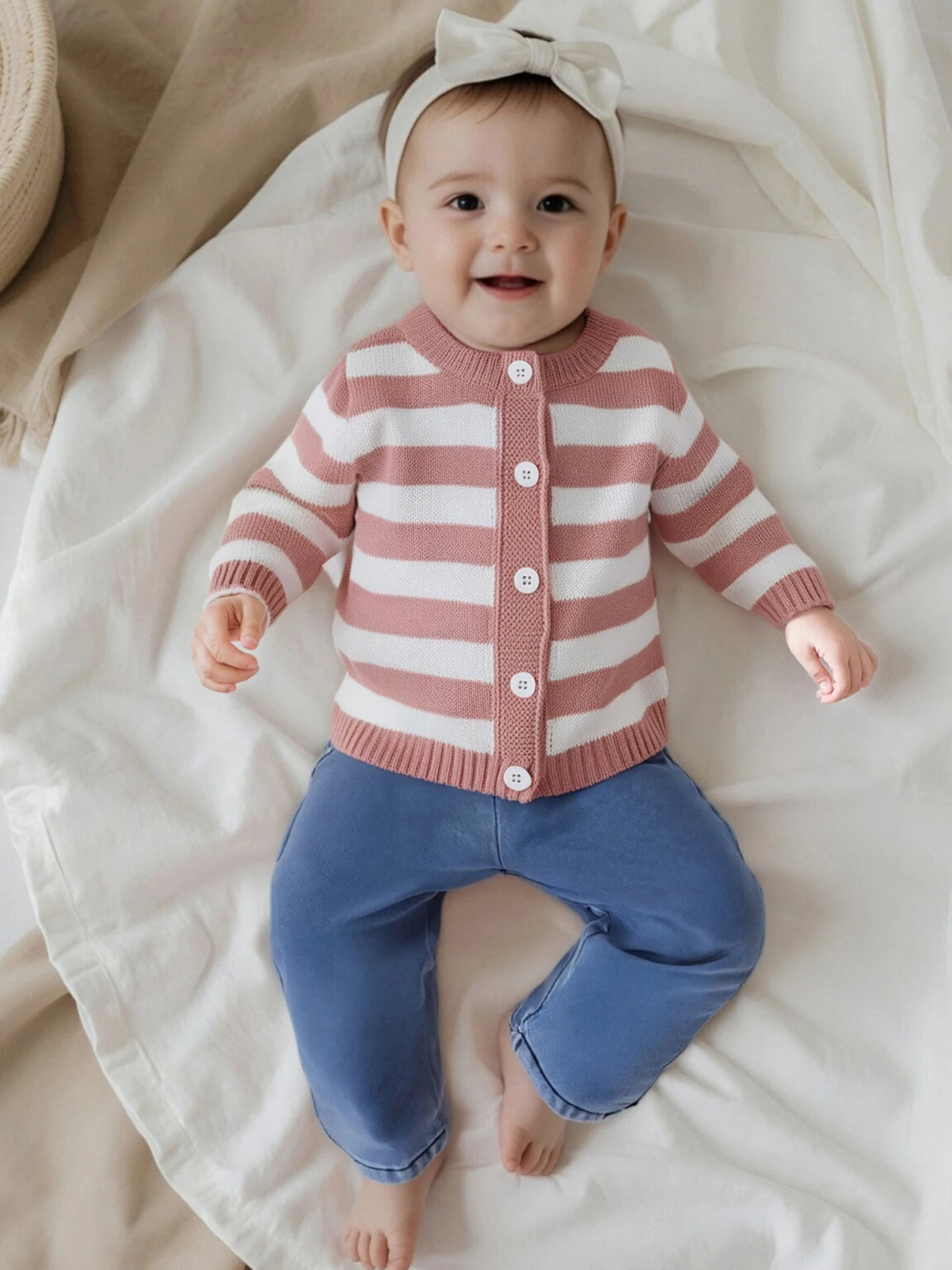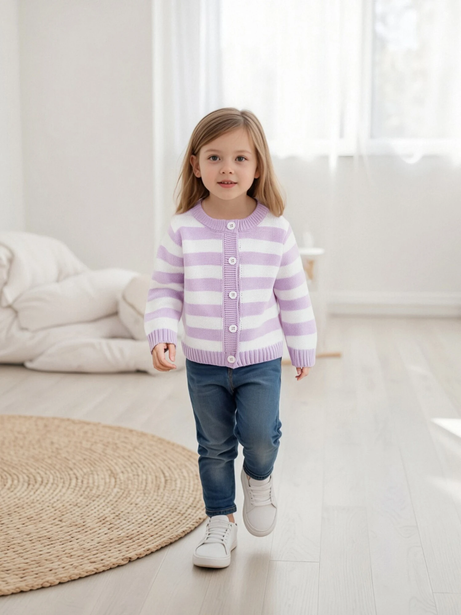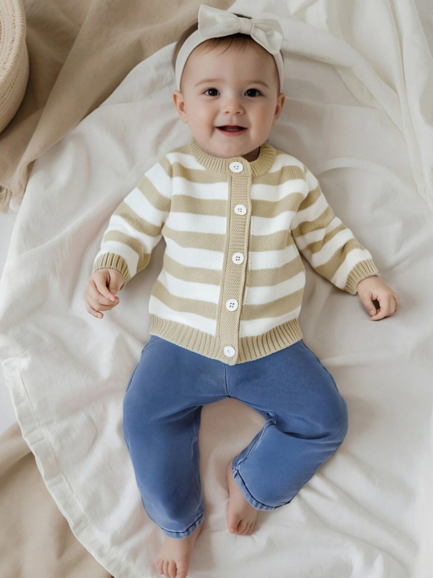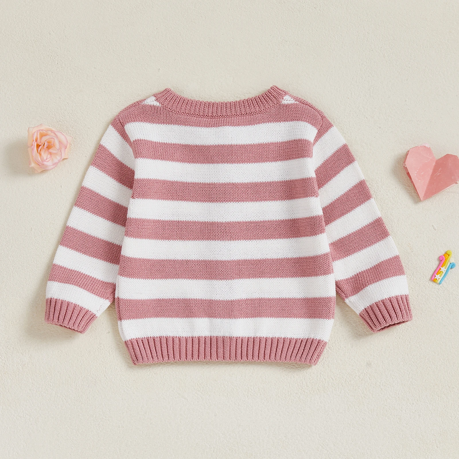 Comprar Suéter de punto de otoño para niñas, cárdigan de manga larga con cuello redondo y botones, prendas de punto a rayas