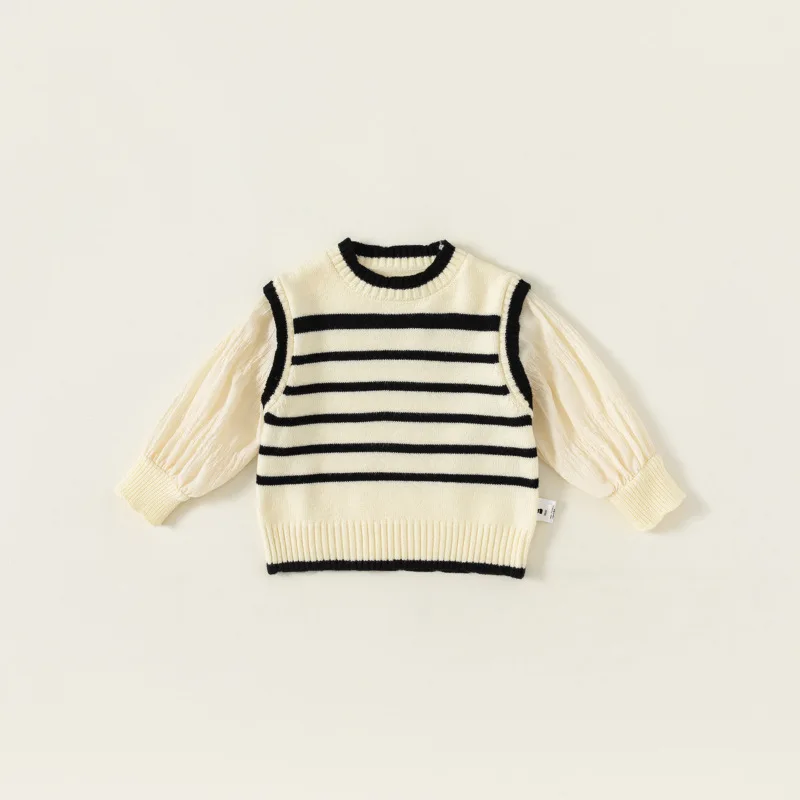 Suéter a rayas de dos piezas de imitación de otoño para niña con mangas abullonadas dulces, Top de punto elegante, informal y versátil, suave y acogedor