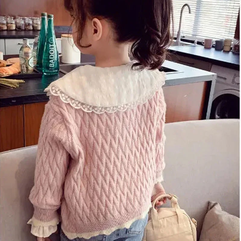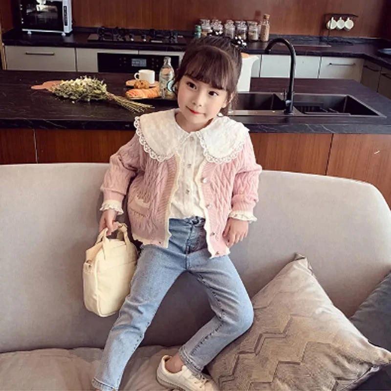 Comprar Suéter rosa blanco para niños, cárdigans de estilo europeo para niñas, punto de cuello redondo, primavera y otoño, Top informal de manga larga para bebé