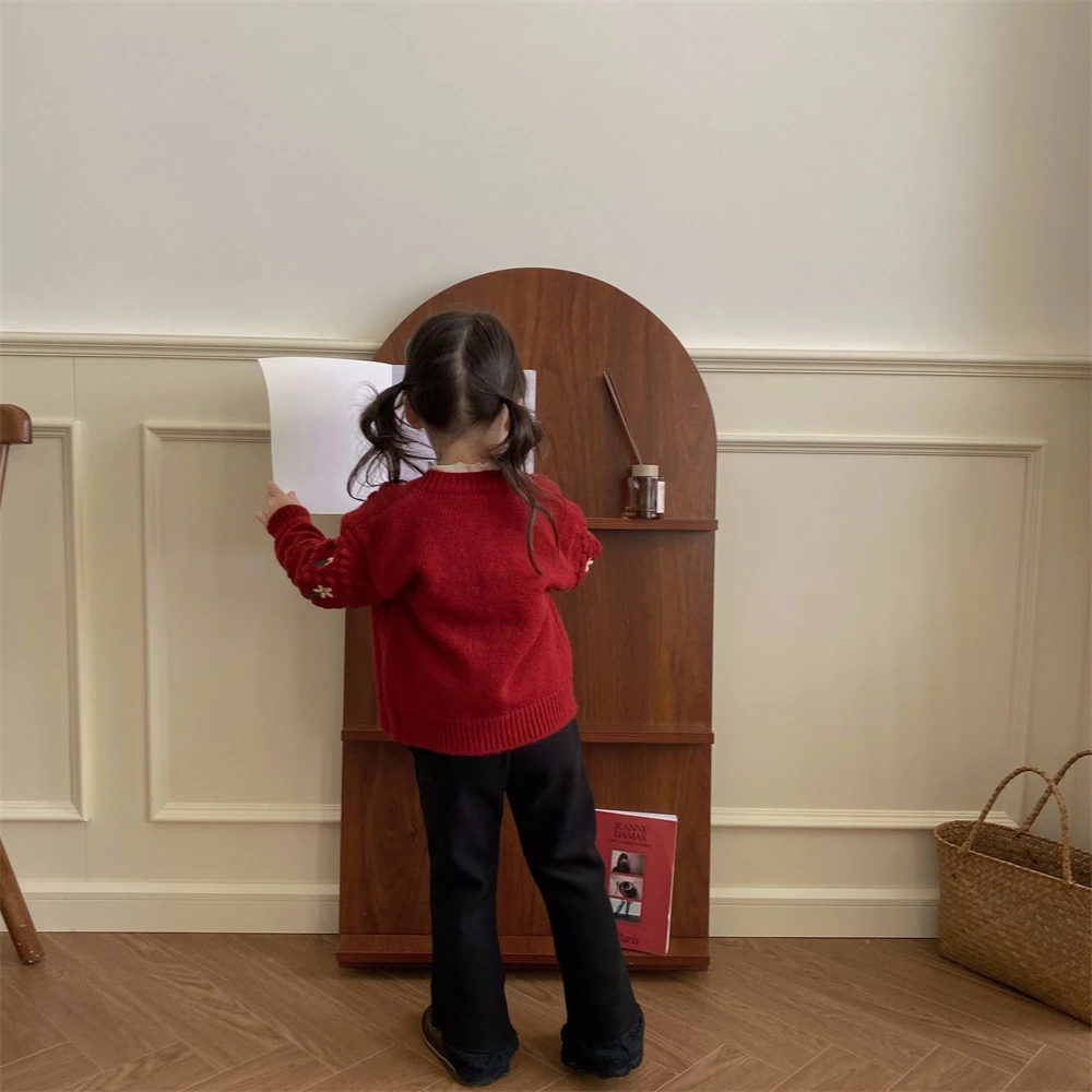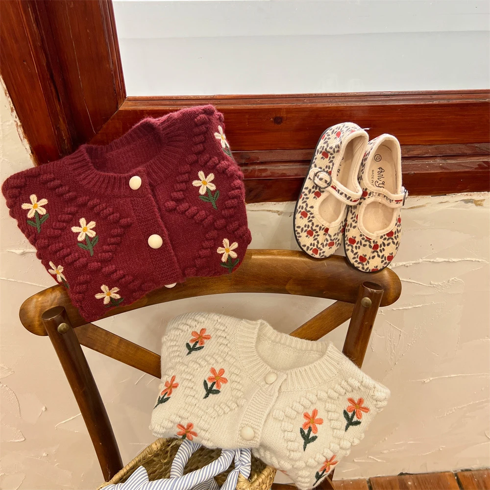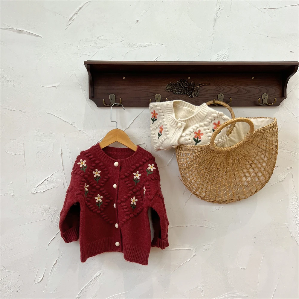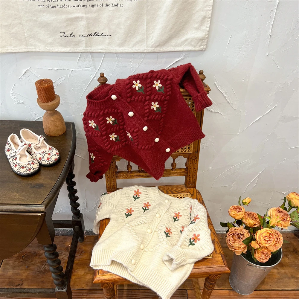 Suéteres rojos navideños para niños, abrigos, Otoño Invierno 2022, cárdigan tejido con bordado Floral para niñas, prendas de vestir exteriores gruesas y cálidas