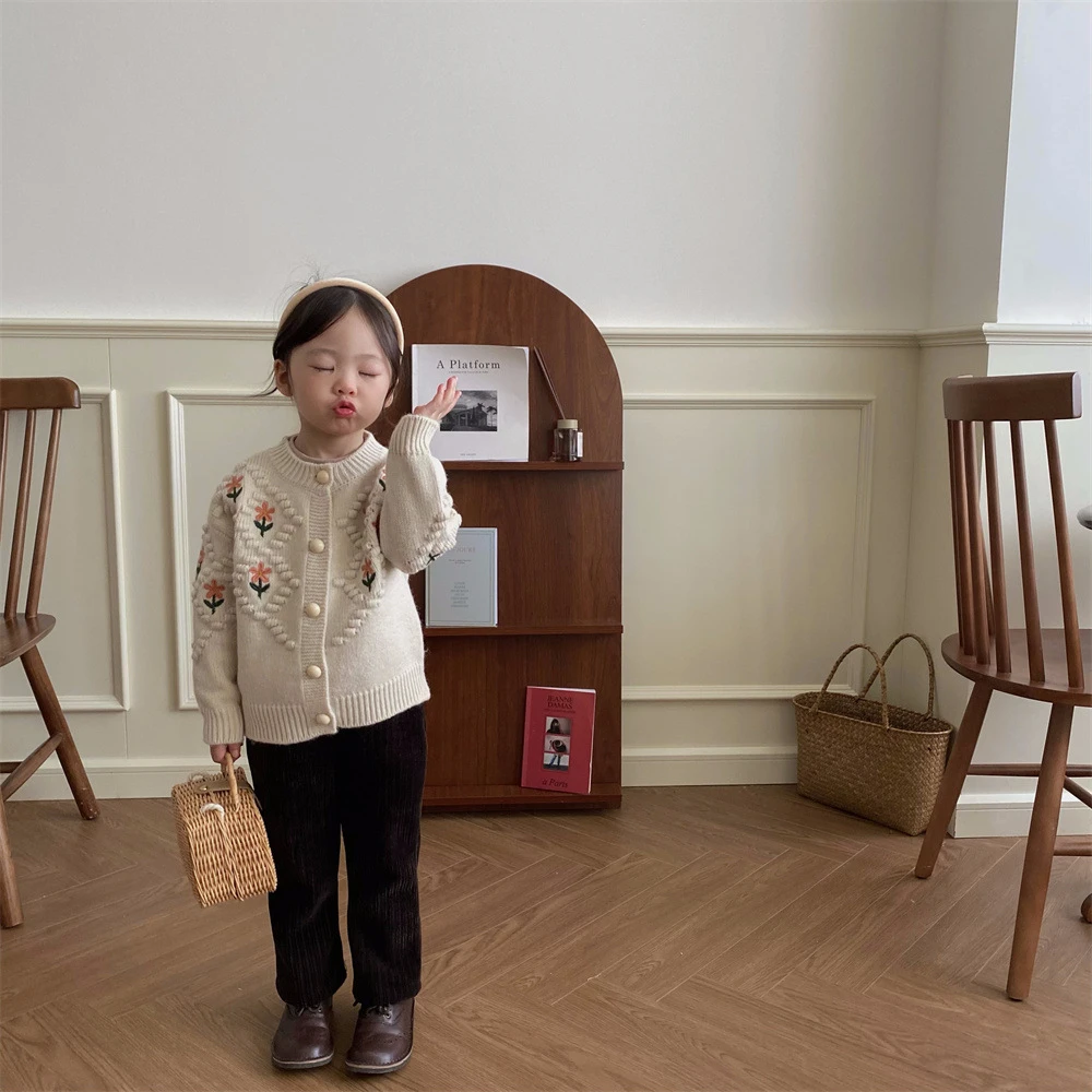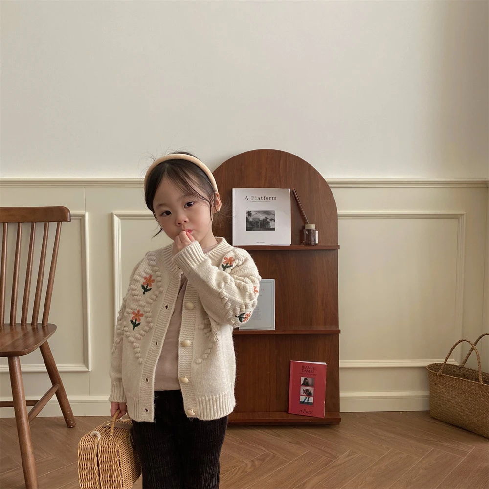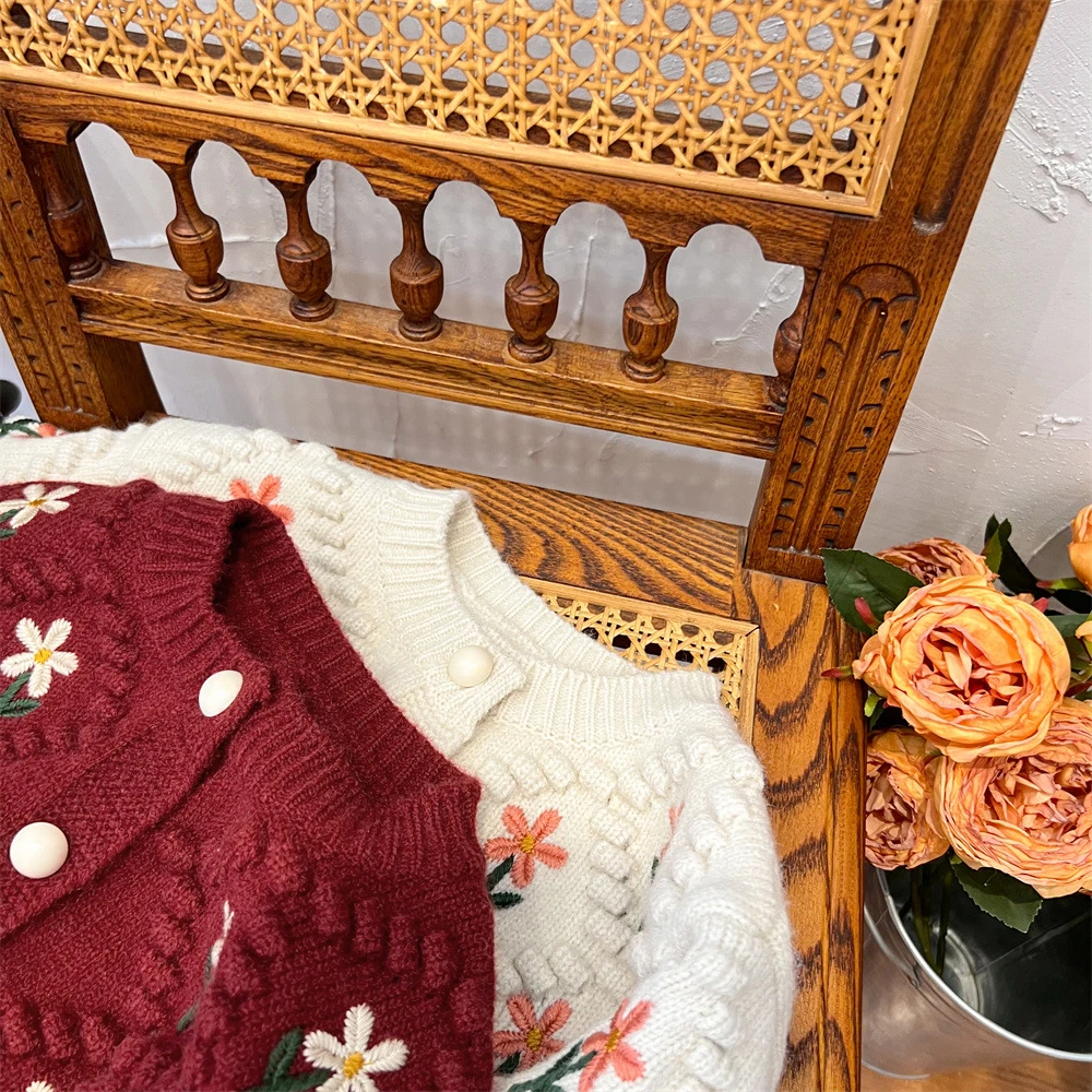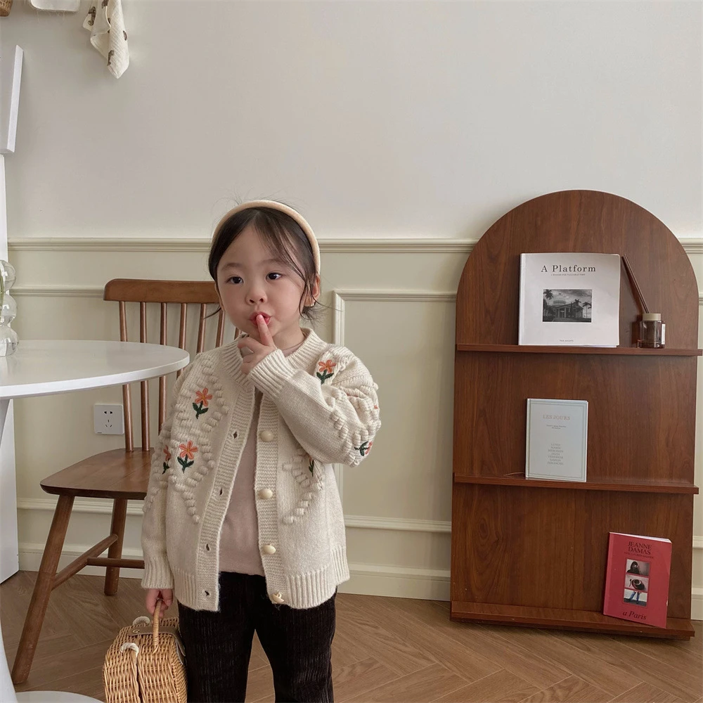 Suéteres rojos navideños para niños, abrigos, Otoño Invierno 2022, cárdigan tejido con bordado Floral para niñas, prendas de vestir exteriores gruesas y cálidas