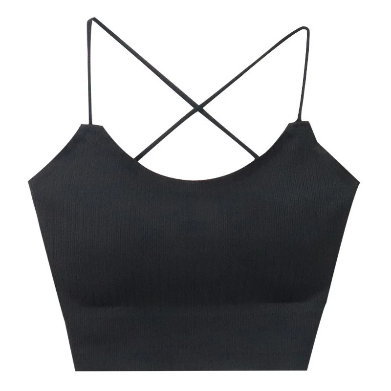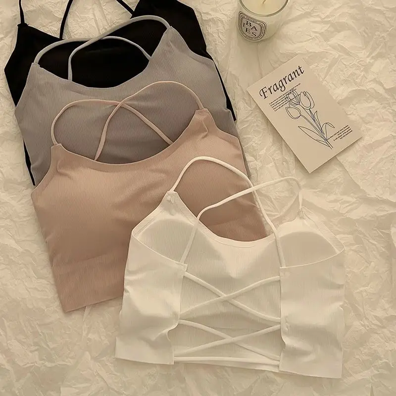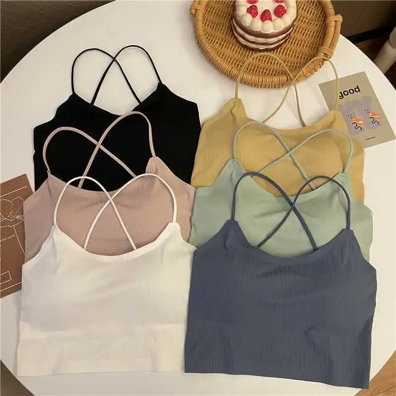 Comprar Sujetador de tubo cruzado de seda de hielo sin costuras para niña, camisola acolchada informal de Color sólido, camiseta interior con tiras antideslizantes, elementos esenciales en capas