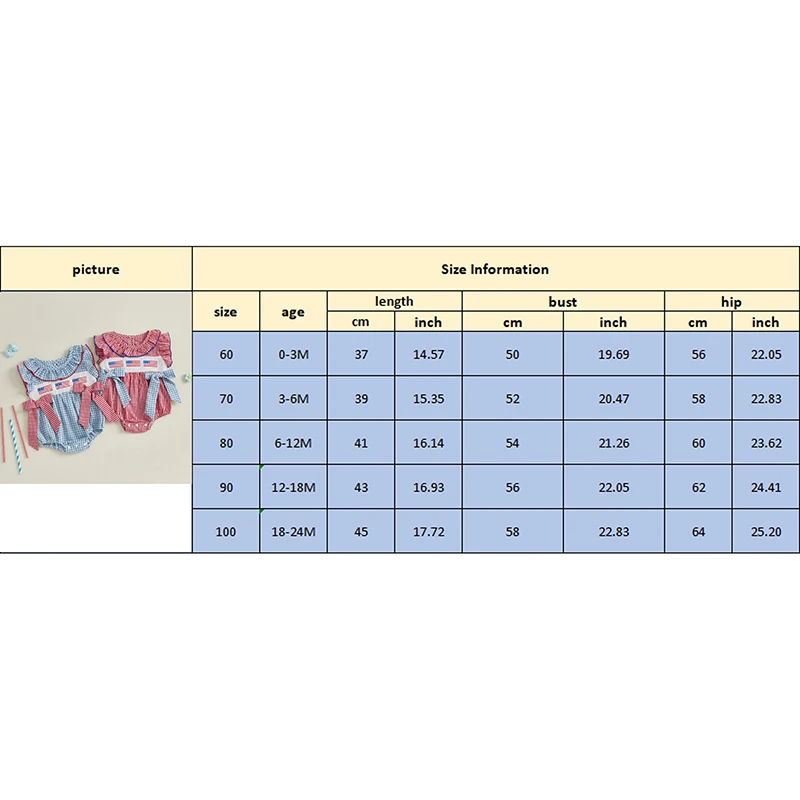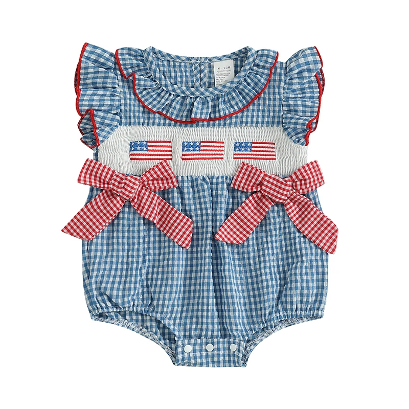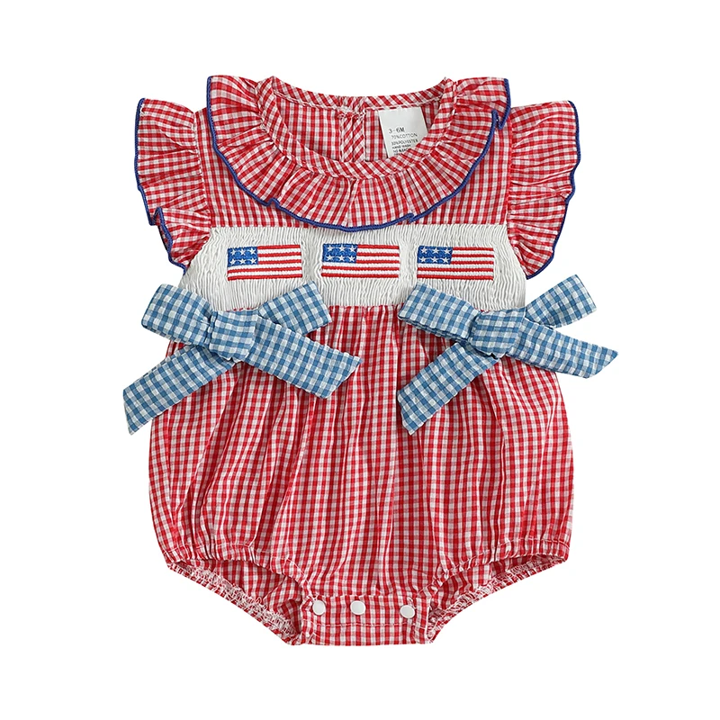 Especificaciones: Material: 95% algodón y 5% poliéster Color: rojo, azul Tamaño: 00-3 meses/3-6 meses/6-12 meses/12-18 meses/18-24 meses Patrón: bordado de bandera estadounidense, cuadros. Manga: Manga voladora Cuello: cuello redondo Género: niña