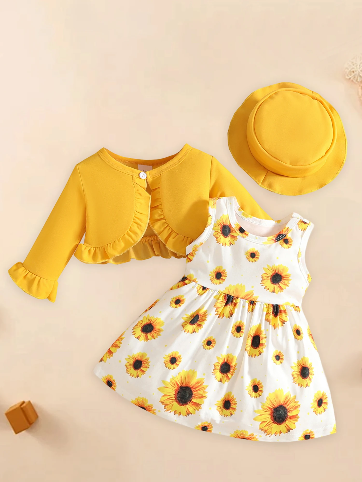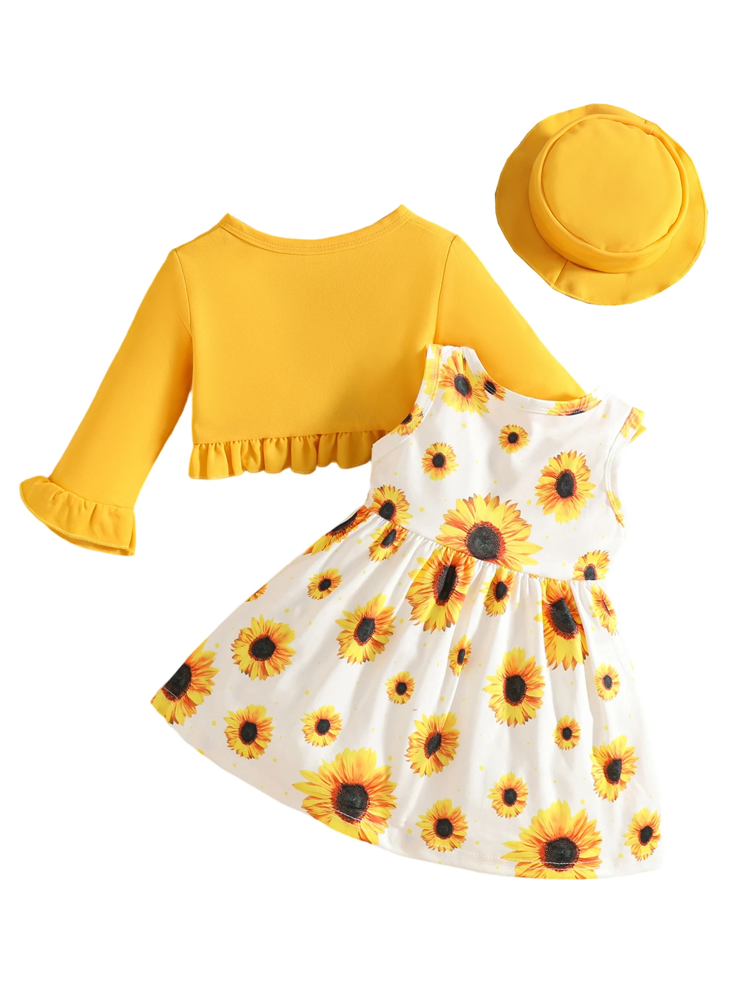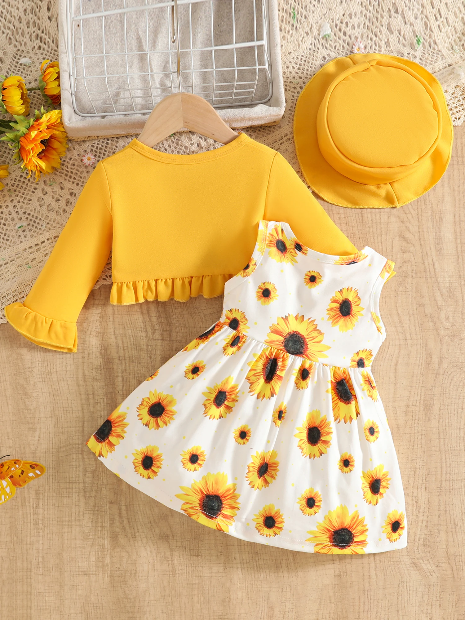 Conjunto de 2 piezas de ropa de otoño para niña, vestido sin mangas con estampado de girasoles + cárdigan de manga larga + sombrero, ropa para niños pequeños