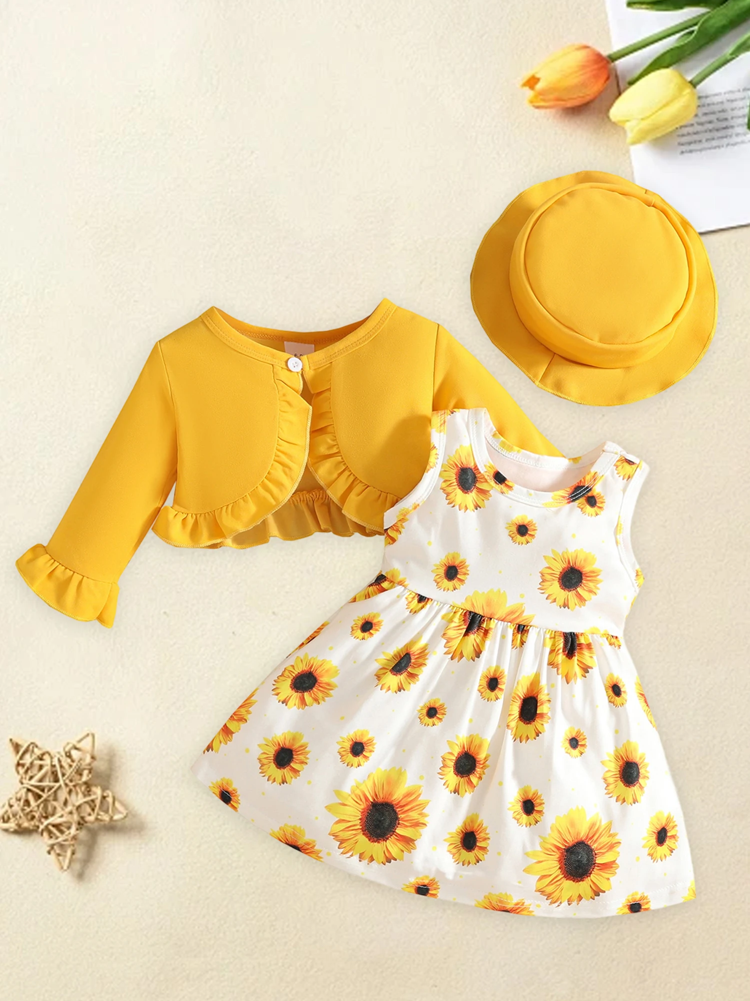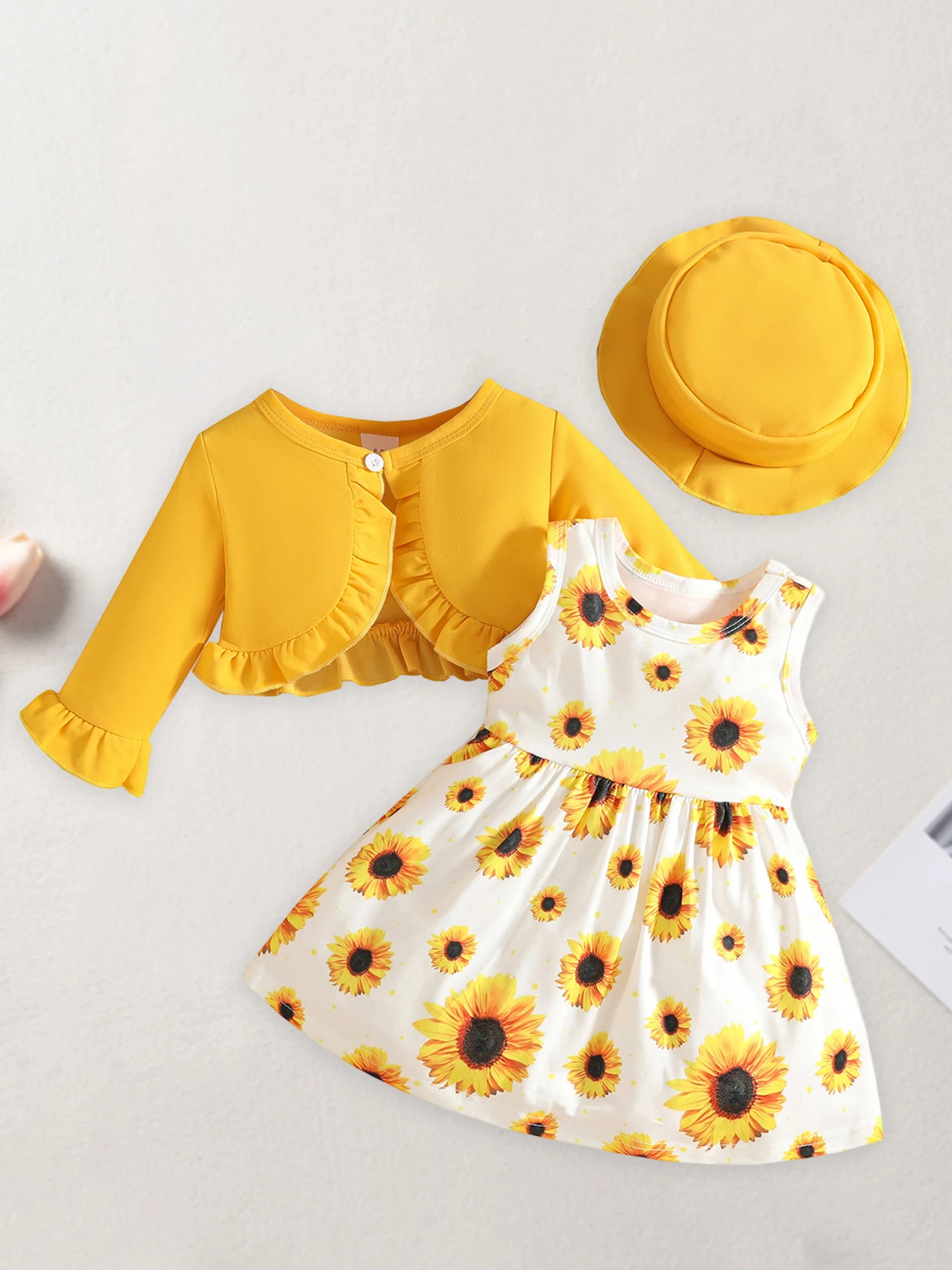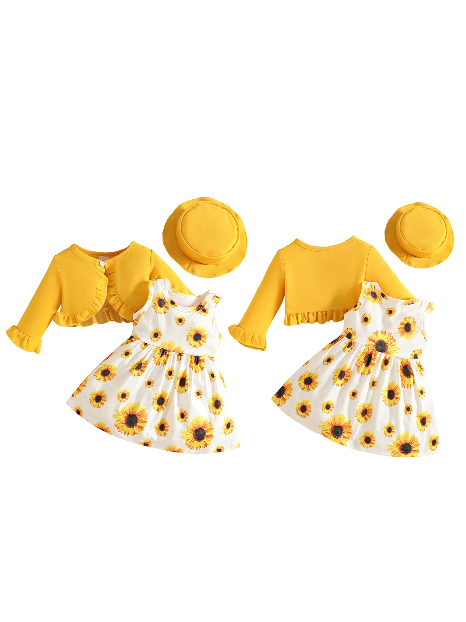 SUNSIOM 0-3 años bebé niña 2 piezas trajes de otoño vestido sin mangas con estampado de girasol + cárdigan de manga larga + conjunto de sombrero ropa para niños pequeños