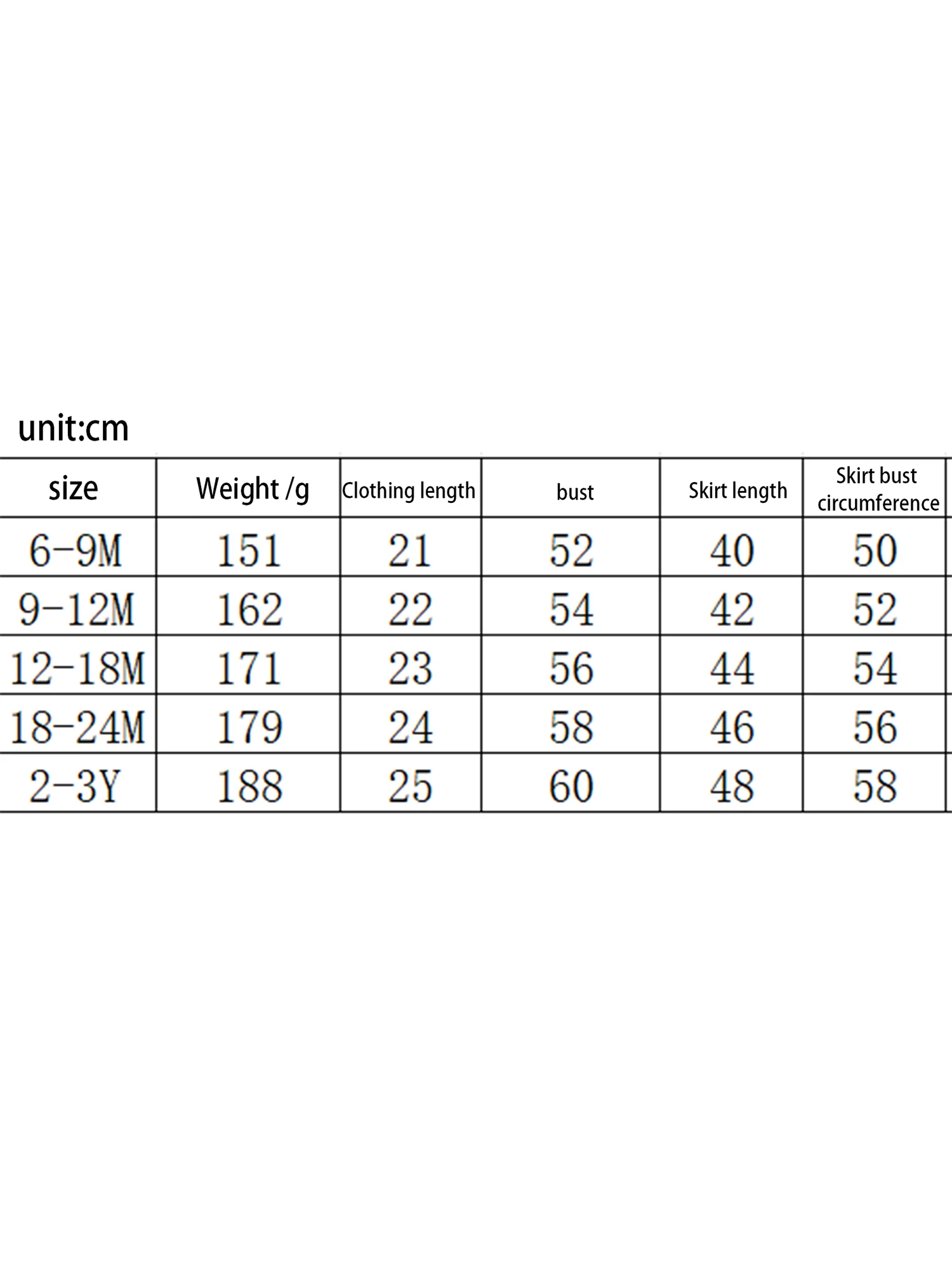 Tamaño (cm) 6-9M Longitud de la blusa: 21 Busto: 52 Longitud del vestido: 40 Busto del vestido: 50 Manga: 23 Hombro: 21 Edad recomendada: 6-9 meses 9-12M Longitud de la camiseta: 22 Busto: 54 Longitud del vestido: 42 Busto del vestido: 52 Manga: 25 Hombro: 22 Edad recomendada: 9-12 meses 12-18M Longitud de la camiseta: 23 Busto: 56 Longitud del vestido: 44 Busto del vestido: 54 Manga: 27 Hombro: 23 Edad recomendada: 12-18 meses 18-24M Longitud de la camiseta: 24 Busto: 58 Longitud del vestido: 46 Busto del vestido: 56 Manga: 29 Hombro: 24 Edad recomendada: 18-24 meses 2-3Y Longitud de la blusa: 25 Busto: 60 Longitud del vestido: 48 Busto del vestido: 58 Manga: 31 Hombro: 25 Edad recomendada: 2-3 años