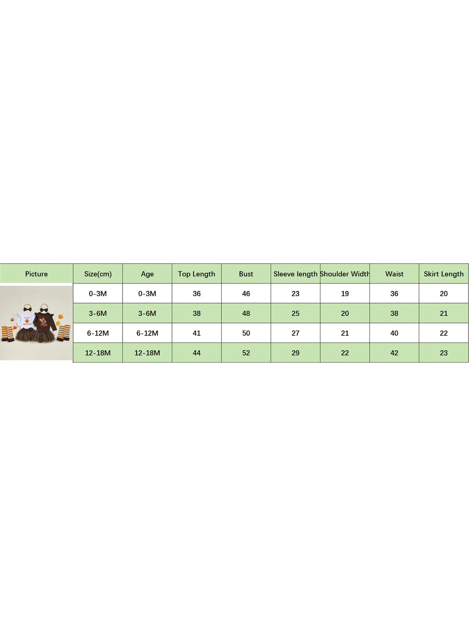 Conjunto de mameluco de manga larga para niña de Acción de Gracias + falda de tul + diadema + calentadores de piernas conjunto de ropa infantilCaracterísticas:-- La tela suave y cómoda le brinda a su hijo el cuidado más suave.-- Se recomienda lavar a mano por separado, colgar para secar y no usar lejía.-- Consulta la tabla de tallas a continuación para seleccionar.Tamaño (cm)0-3M Longitud del mameluco: 36 Busto: 46 Manga: 23 Hombro: 19 Longitud de la falda: 20 Cintura: 36 Edad recomendada: 0-3 meses3-6M Longitud del mameluco: 38 Busto: 48 Manga: 25 Hombro: 20 Longitud de la falda: 21 Cintura: 38 Edad recomendada: 3-6 meses6-12M Longitud del mameluco: 41 Busto: 50 Manga: 27 Hombro: 21 Longitud de la falda: 22 Cintura: 40 Edad recomendada: 6-12 meses12-18M Longitud del mameluco: 44 Busto: 52 Manga: 29 Hombro: 22 Longitud de la falda: 23 Cintura: 42 Edad recomendada: 12-18 mesesTamaño (pulgadas)0-3M Longitud del mameluco: 14,17 Busto: 18,11 Manga: 9,06 Hombro: 7,48 Longitud de la falda: 7,87 Cintura: 14,17 Edad recomendada: 0-3 meses3-6M Longitud del mameluco: 14,96 Busto: 18,90 Manga: 9,84 Hombro: 7,87 Longitud de la falda: 8,27 Cintura: 14,96 Edad recomendada: 3-6 meses6-12M Longitud del mameluco: 16.14 Busto: 19,69 Manga: 10,63 Hombro: 8,27 Longitud de la falda: 8,66 Cintura: 15,75 Edad recomendada: 6-12 meses12-18M Longitud del mameluco: 17.32 Busto: 20,47 Manga: 11.42 Hombro: 8,66 Longitud de la falda: 9,06 Cintura: 16,54 Edad recomendada: 12-18 mesesEspecificación:Material: Mameluco: 95% Algodón, 5% Elastano; Falda: 100%PoliésterColor: multicolorGénero: MujerEstilo: eleganteTemporada: invierno, otoño, primavera.Paquete incluido1 pelele.1 falda.1 diadema.1 par de calentadores de piernas.