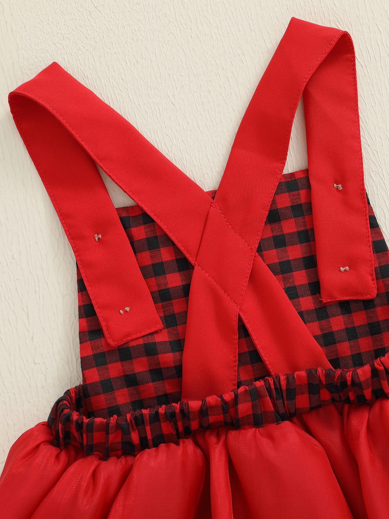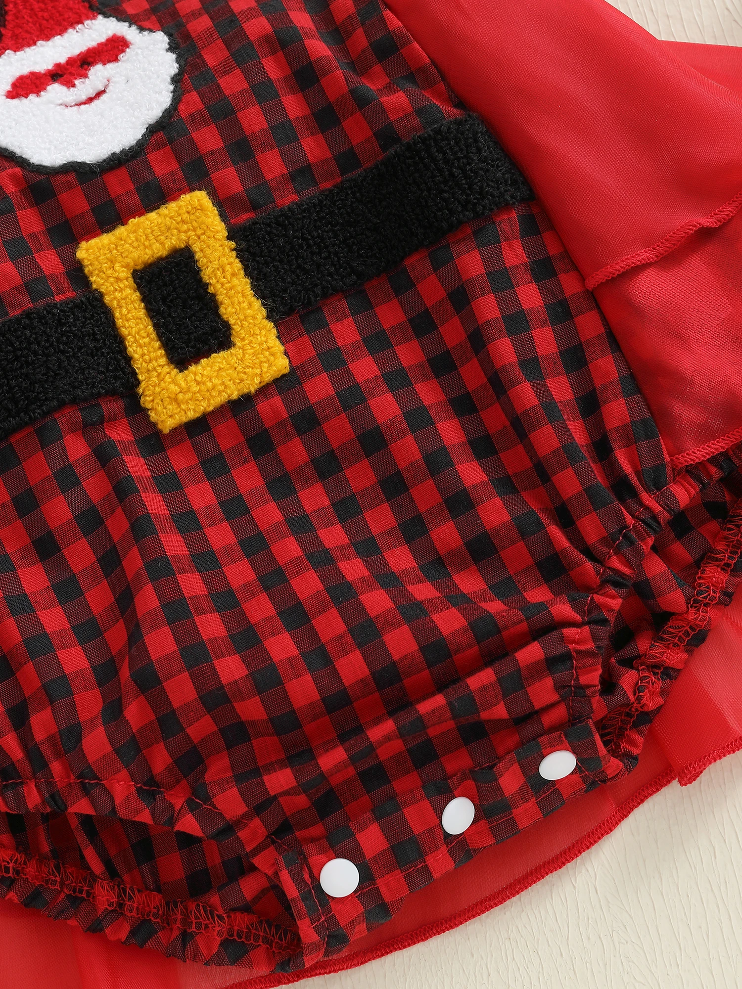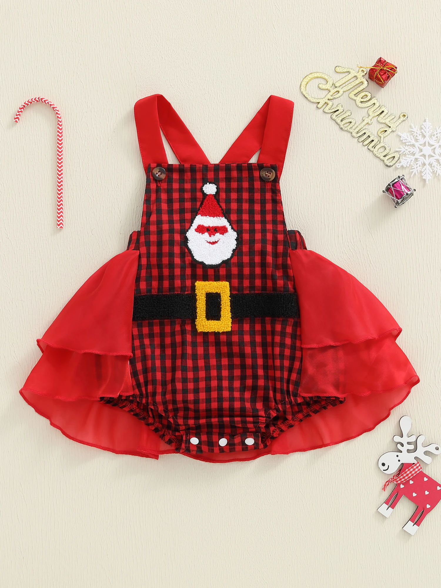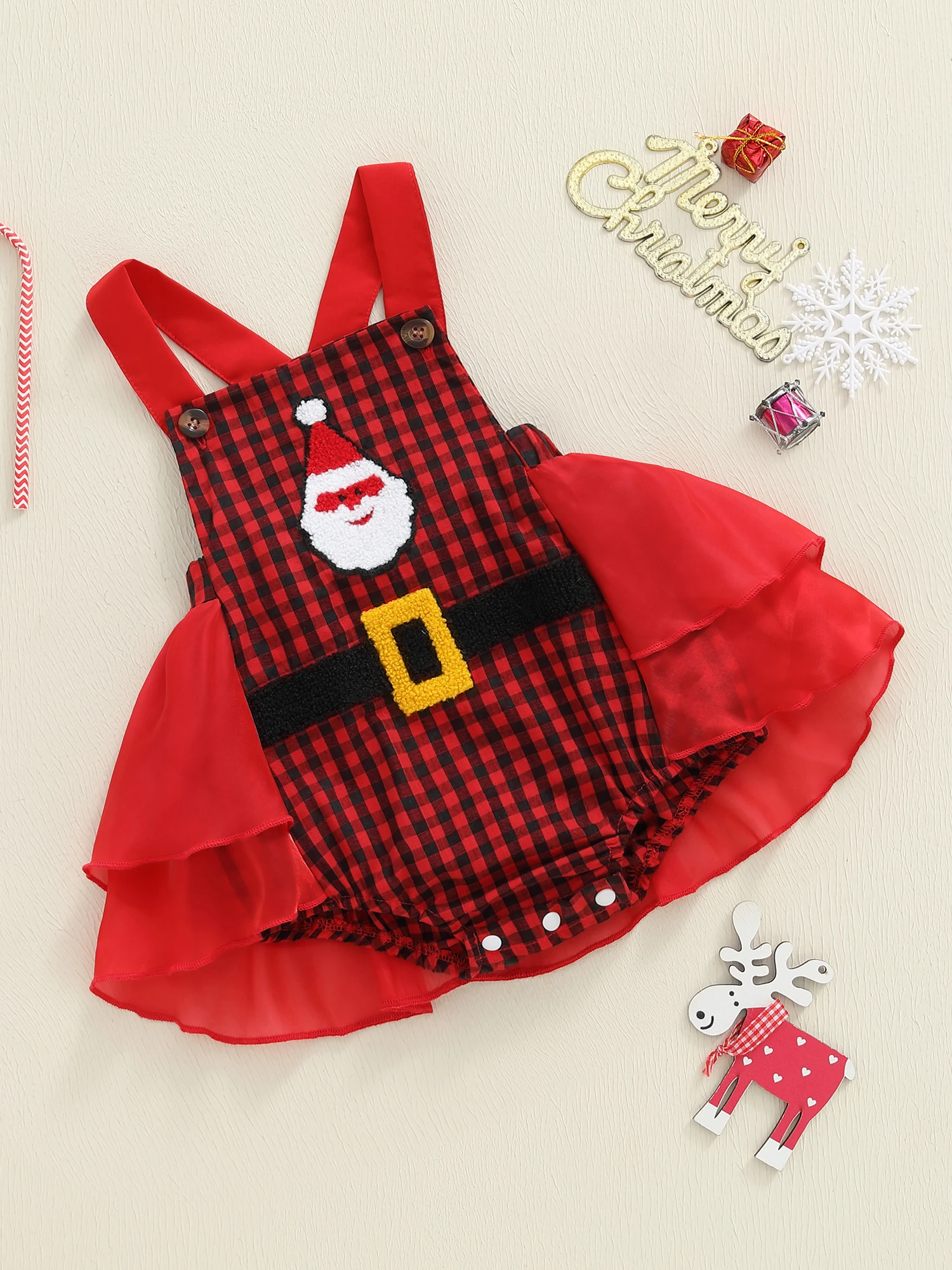 Especificación Nombre del artículo: Ropa navideña para bebé Material: 65% algodón y 35% poliéster Patrón: cinturón sombrero bordado y cuadros Cuello: cuello cuadrado Manga: sin mangas