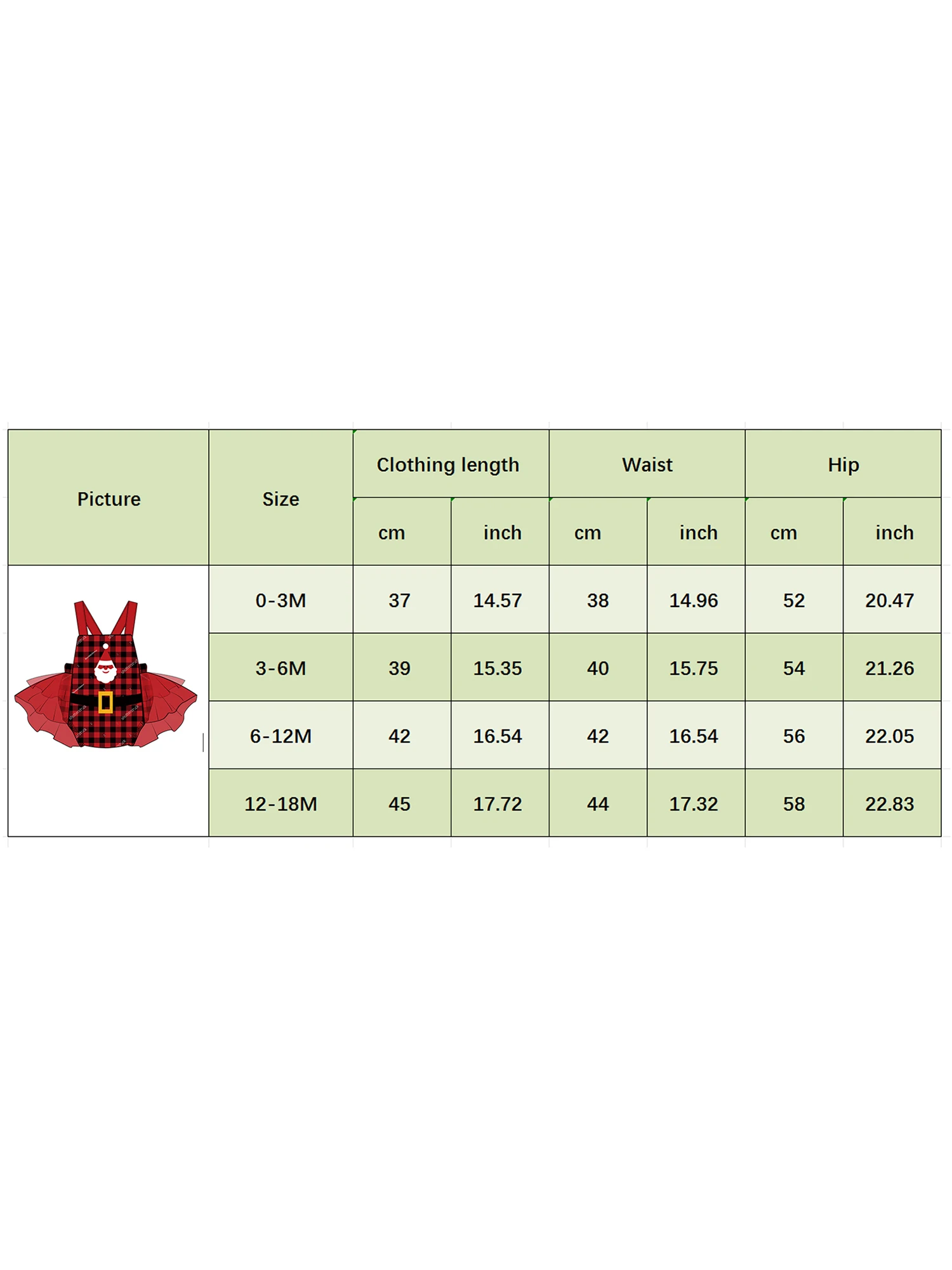 Tamaño (pulgadas): 0-3M Longitud de la ropa: 14,57 Cintura: 14,96 Cadera: 20,47 Edad recomendada: 0-3 meses 3-6M Longitud de la ropa: 15,35 Cintura: 15,75 Cadera: 21,26 Edad recomendada: 3-6 meses 6-12M Longitud de la ropa: 16,54 Cintura: 16,54 Cadera: 22.05 Edad recomendada: 6-12 meses 12-18M Longitud de la ropa: 17.72 Cintura: 17.32 Cadera: 22,83 Edad recomendada: 12-18 meses