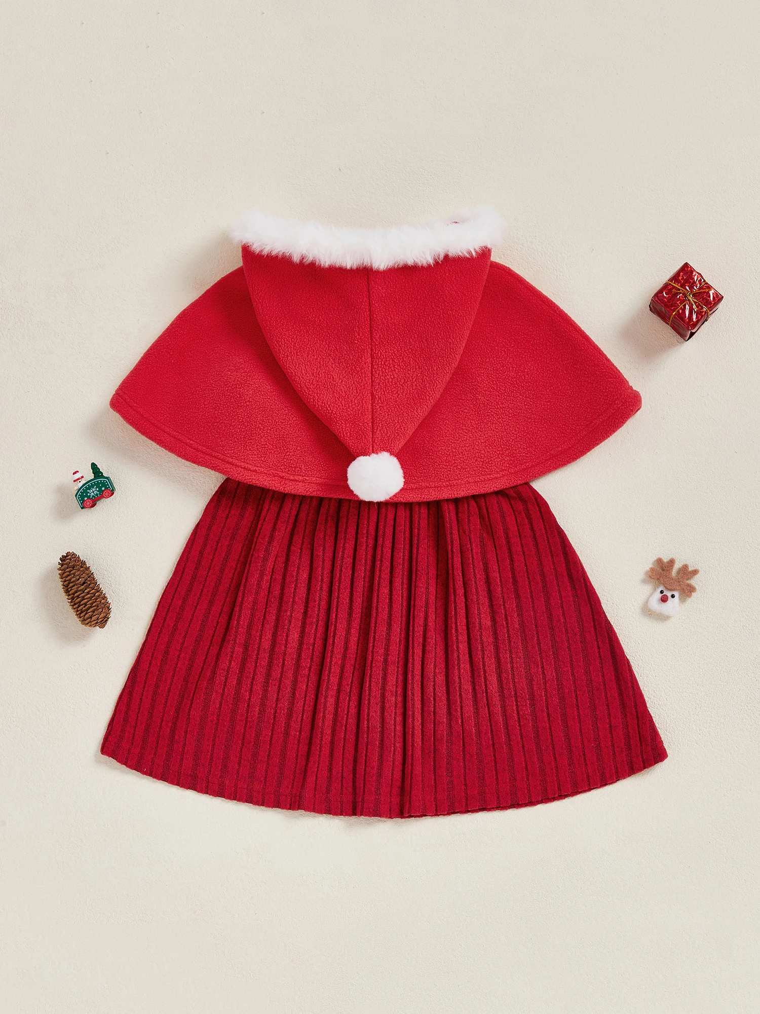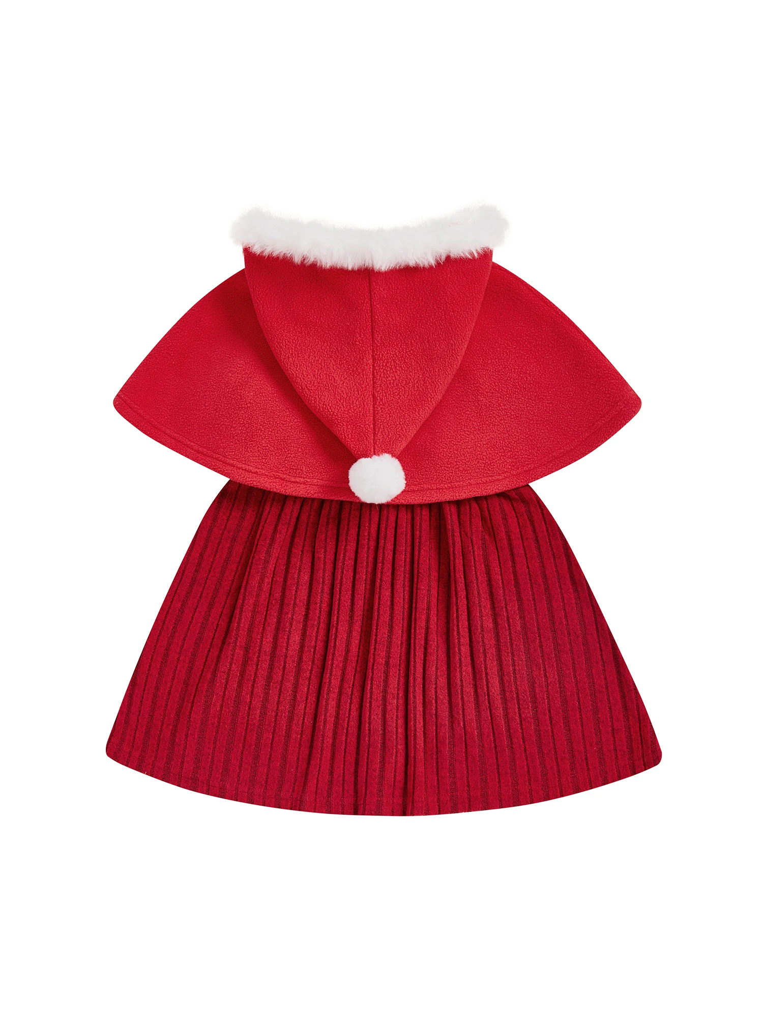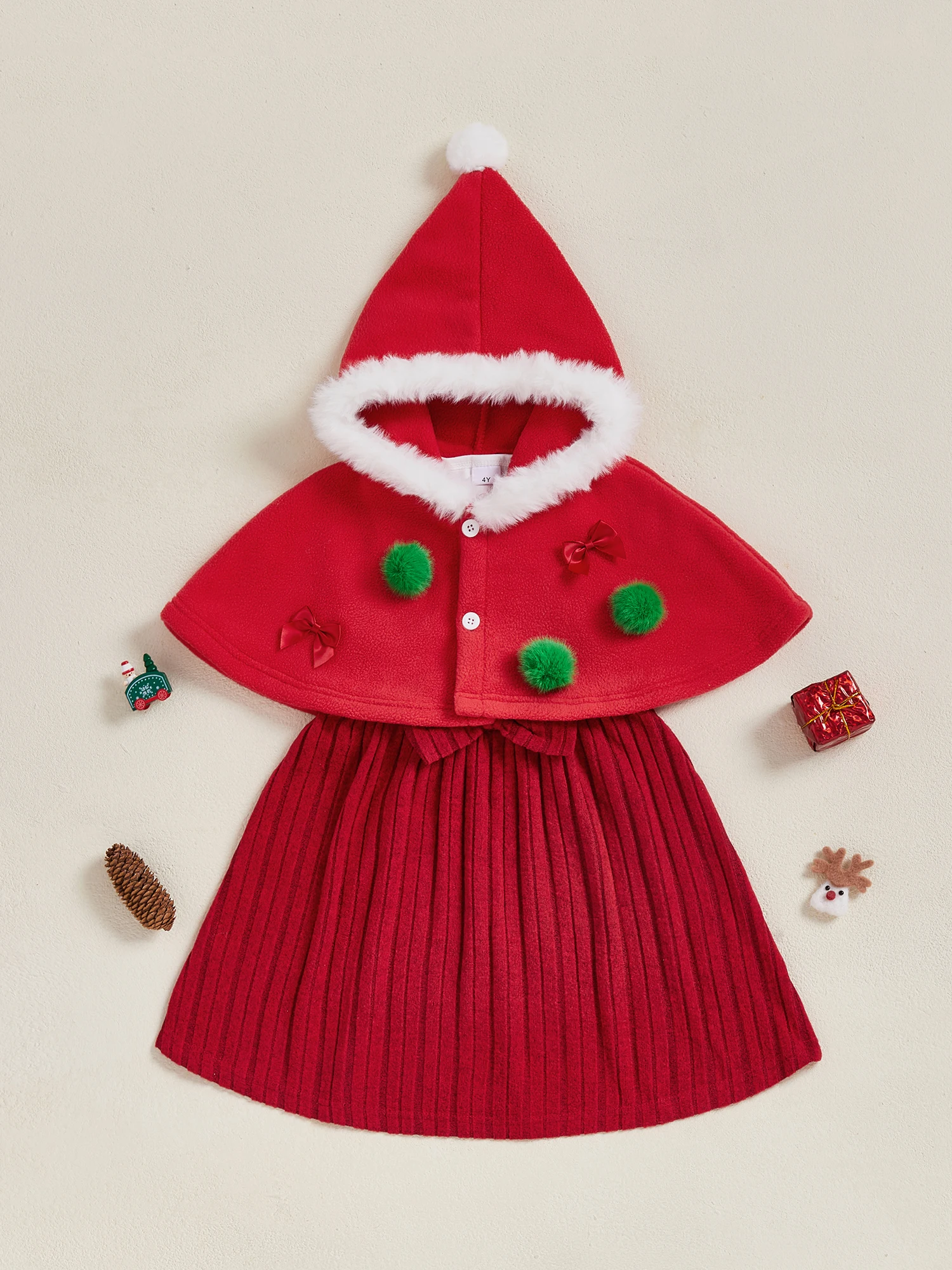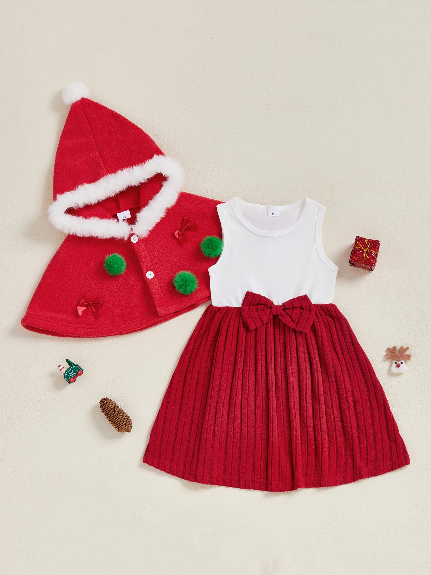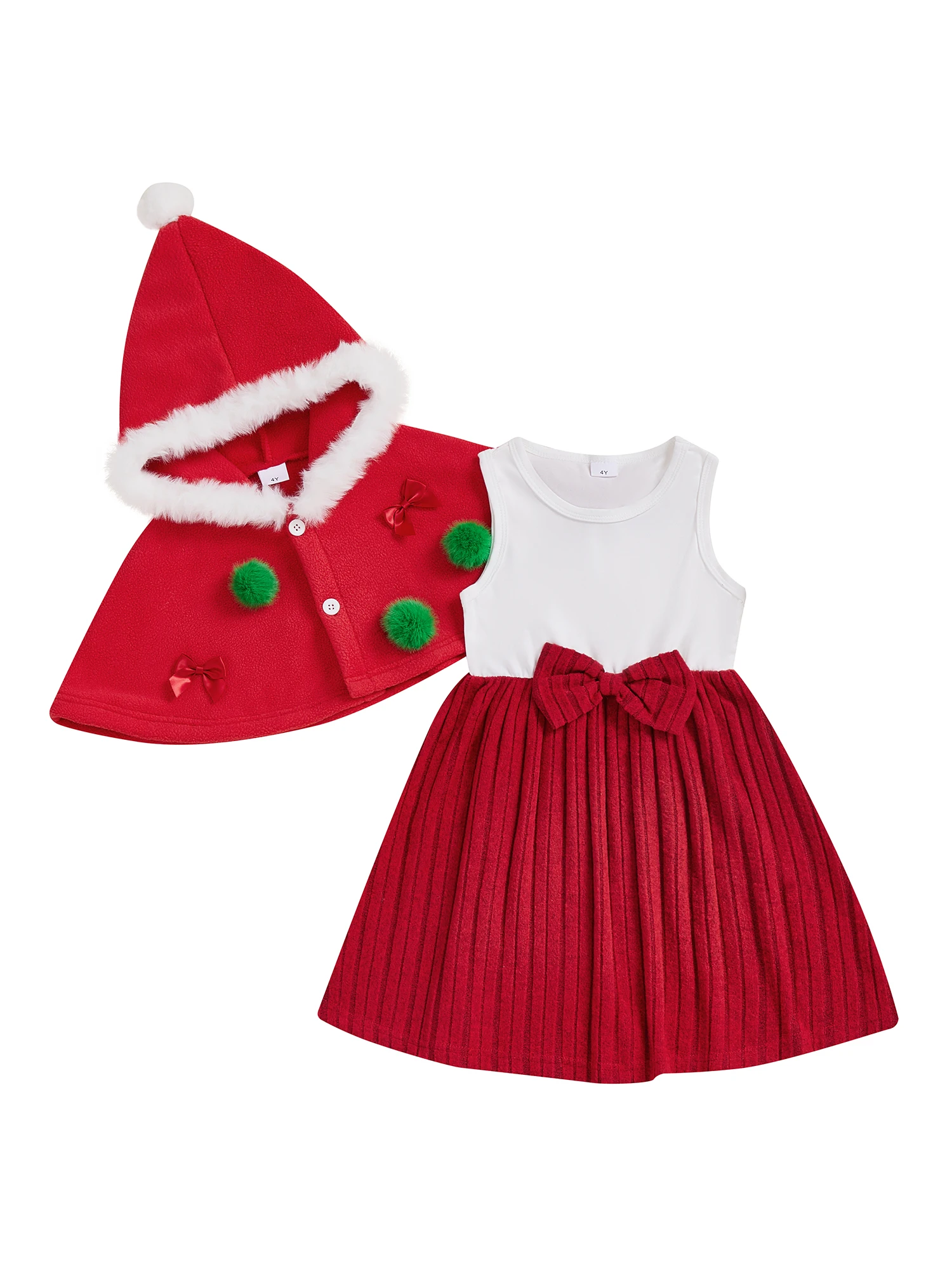 Conjunto de 2 piezas para niña pequeña de Navidad con lazo de bola de piel, capa con capucha y botones y vestido sin mangas de línea A