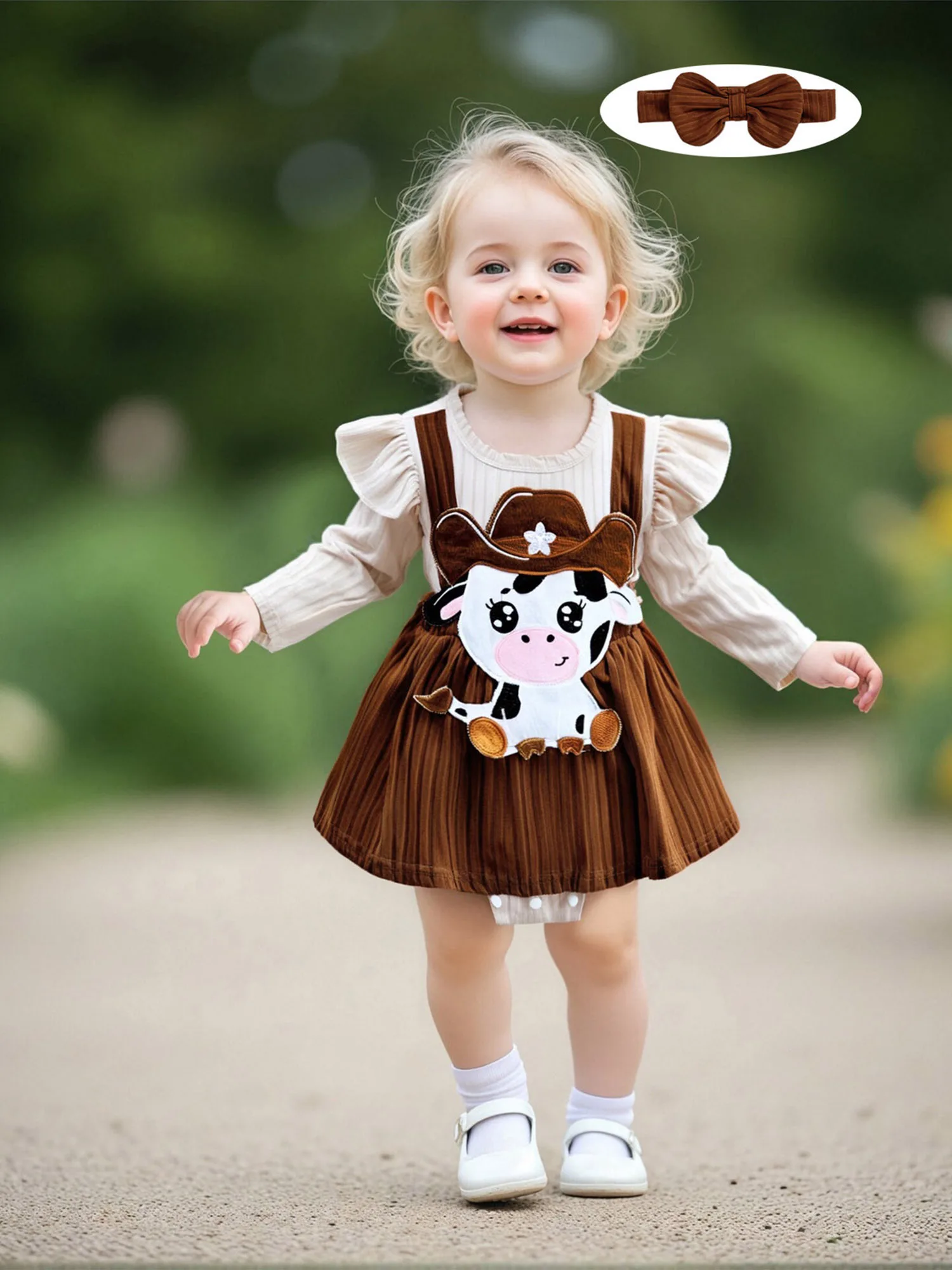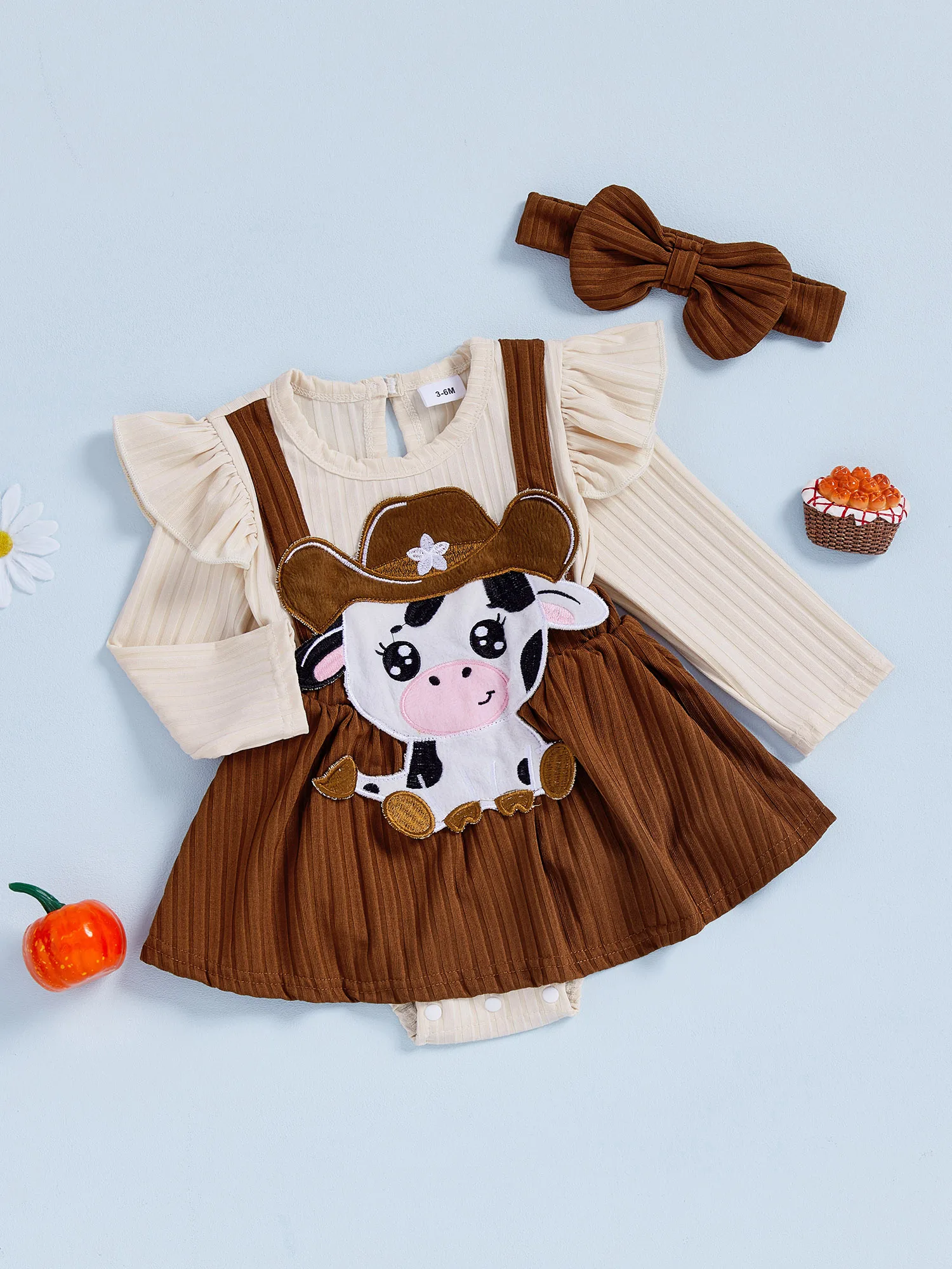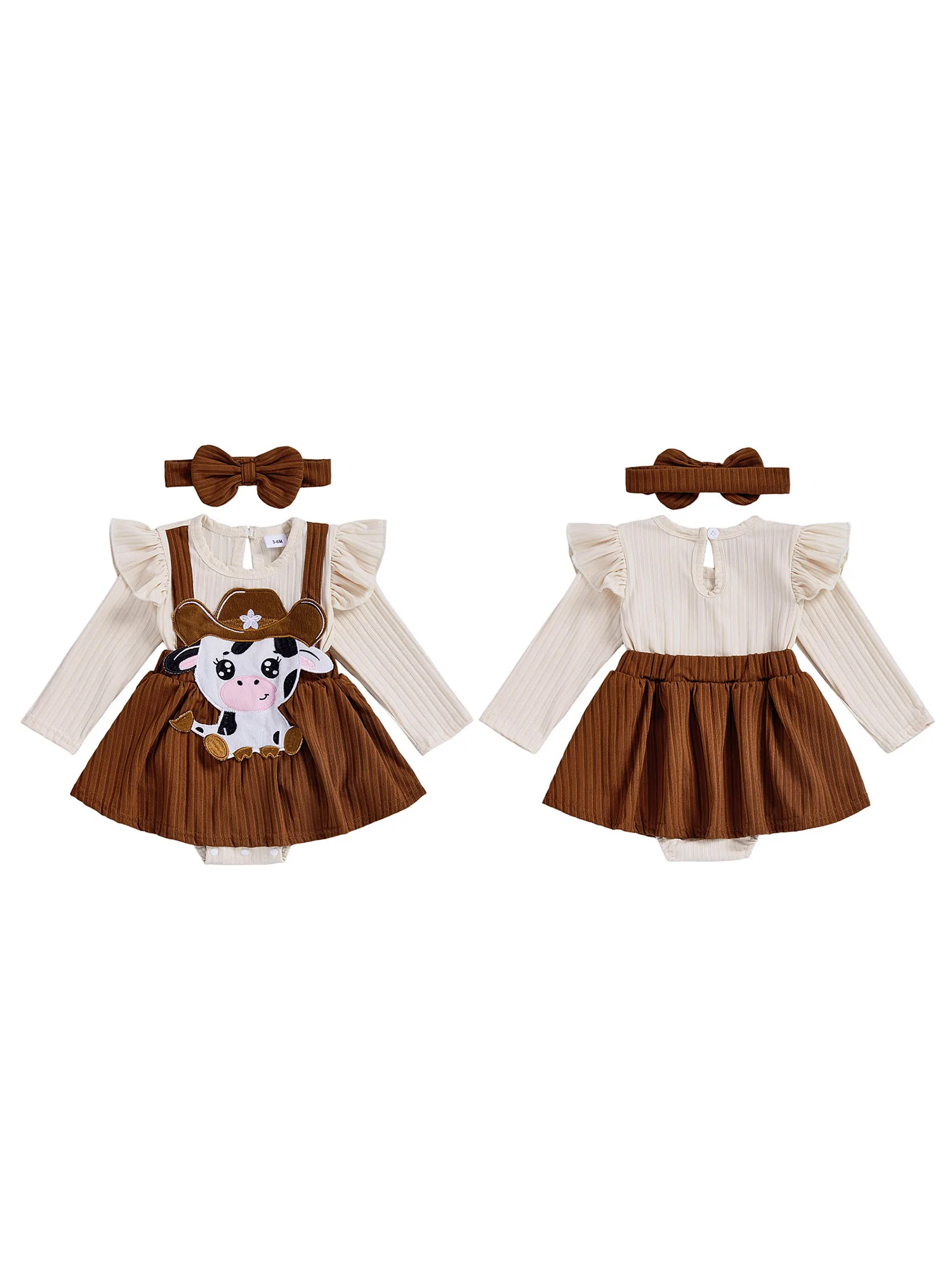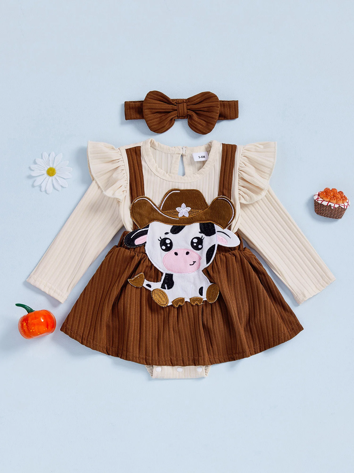 Conjunto de 2 piezas de trajes de otoño para niñas, mameluco bordado de vaca de manga larga con diadema, ropa occidental para recién nacidos