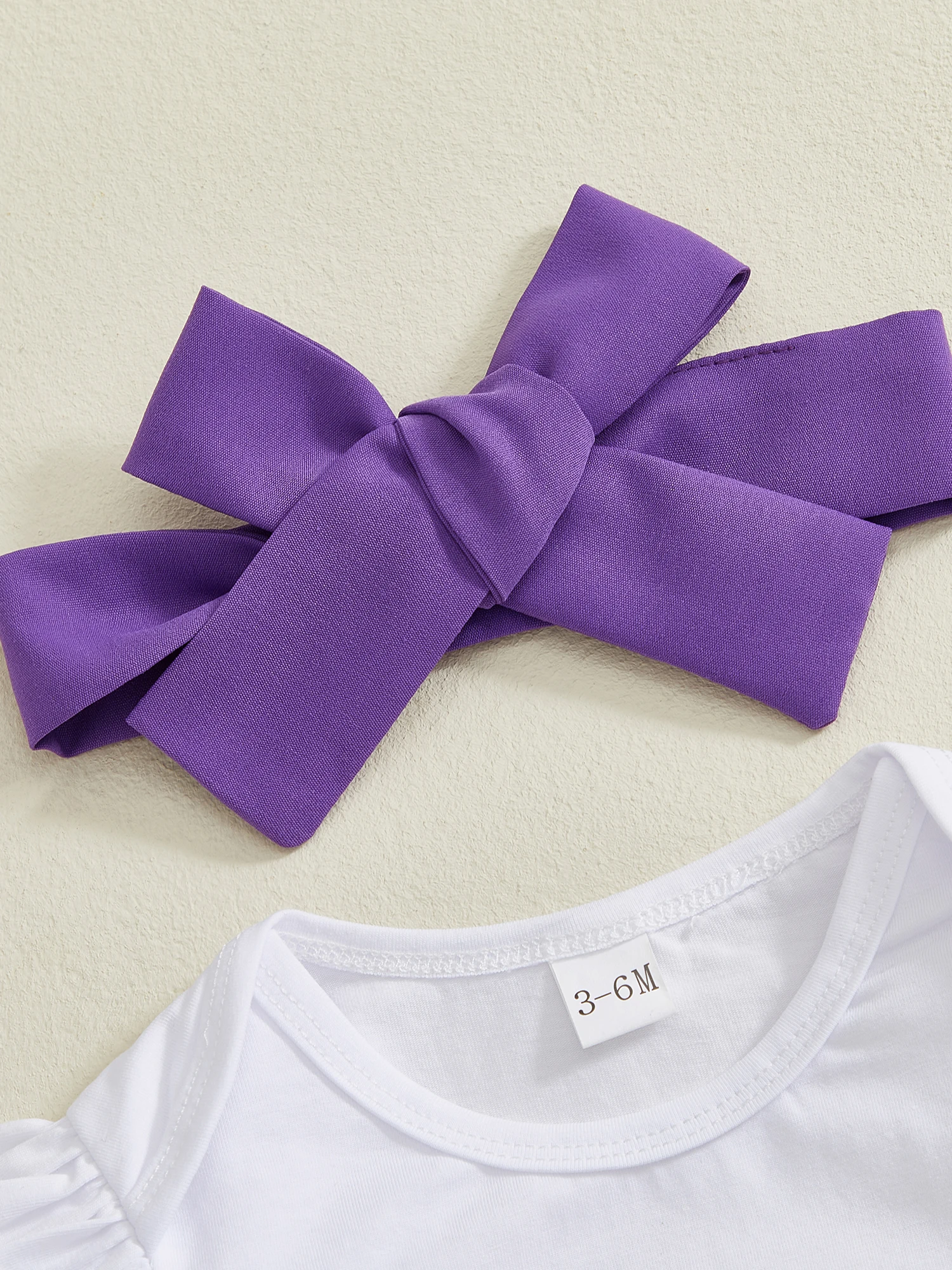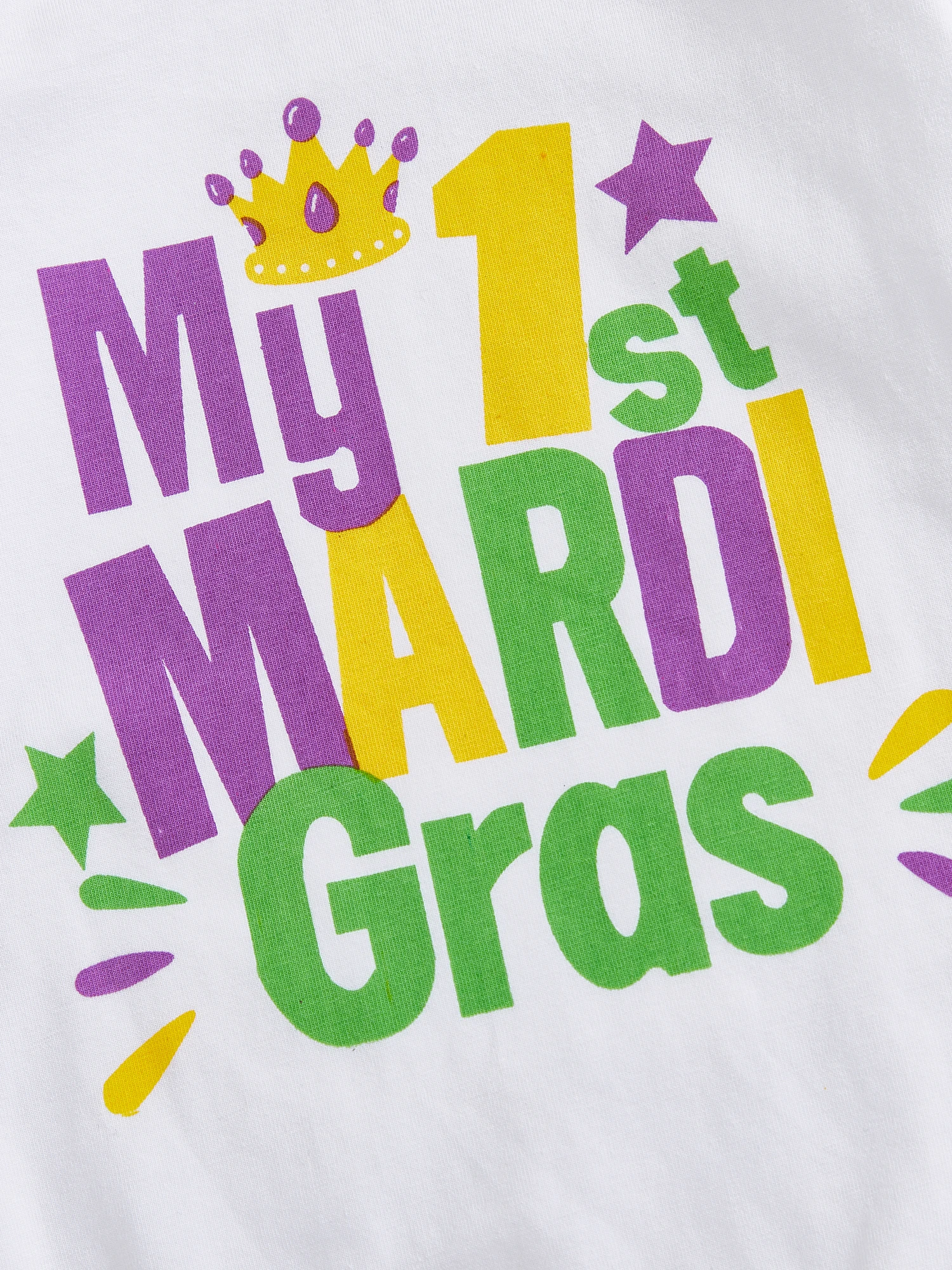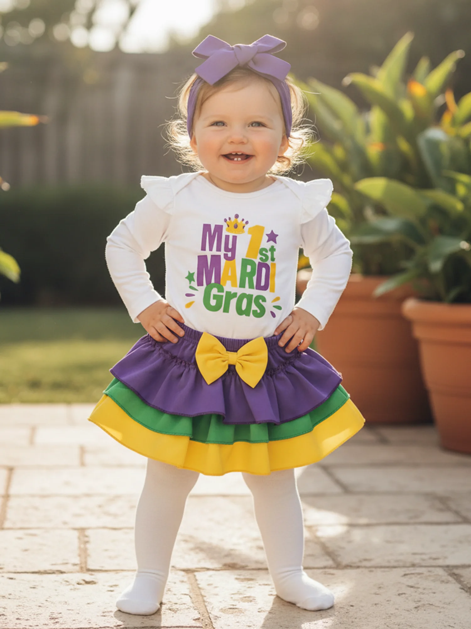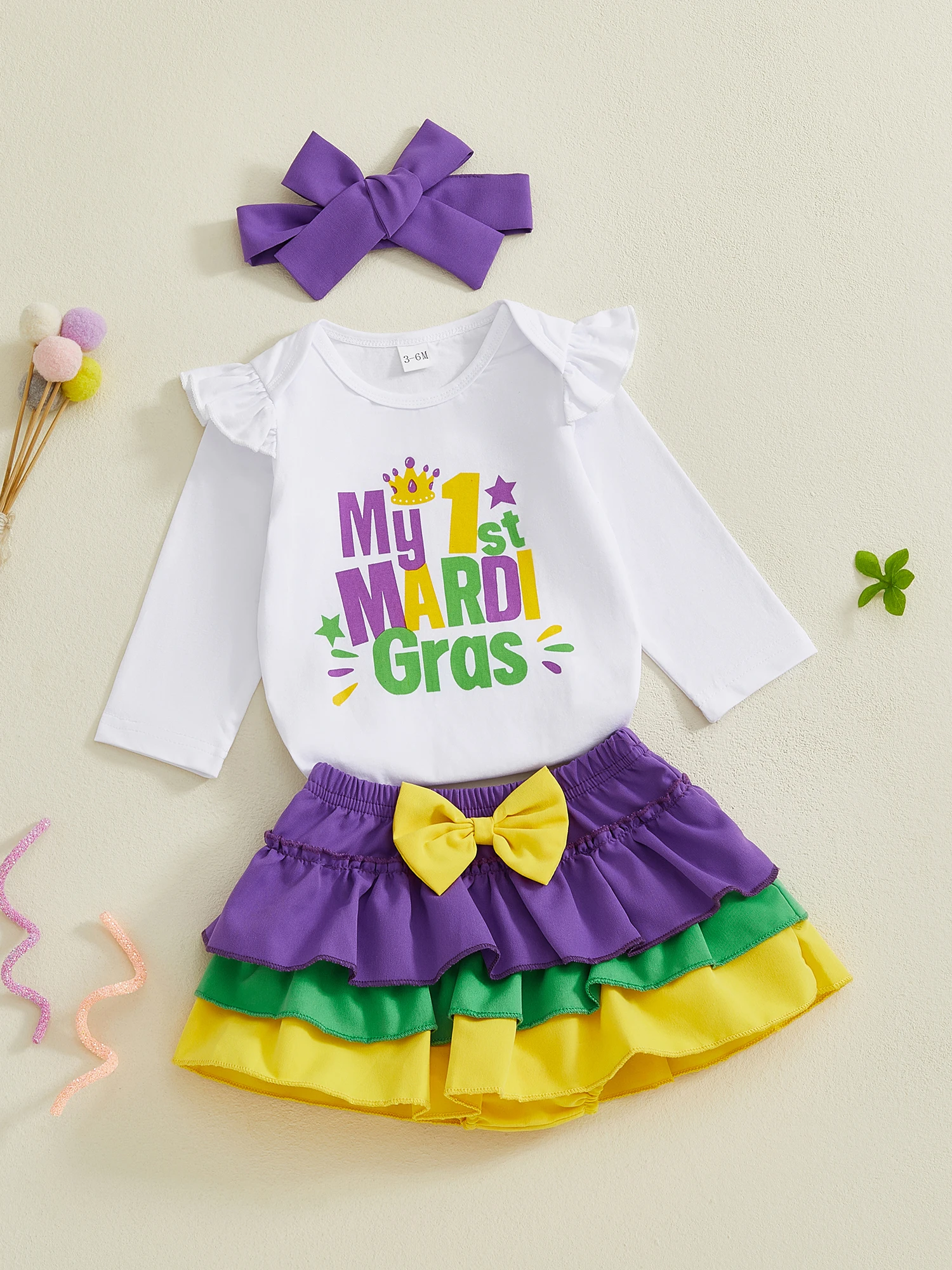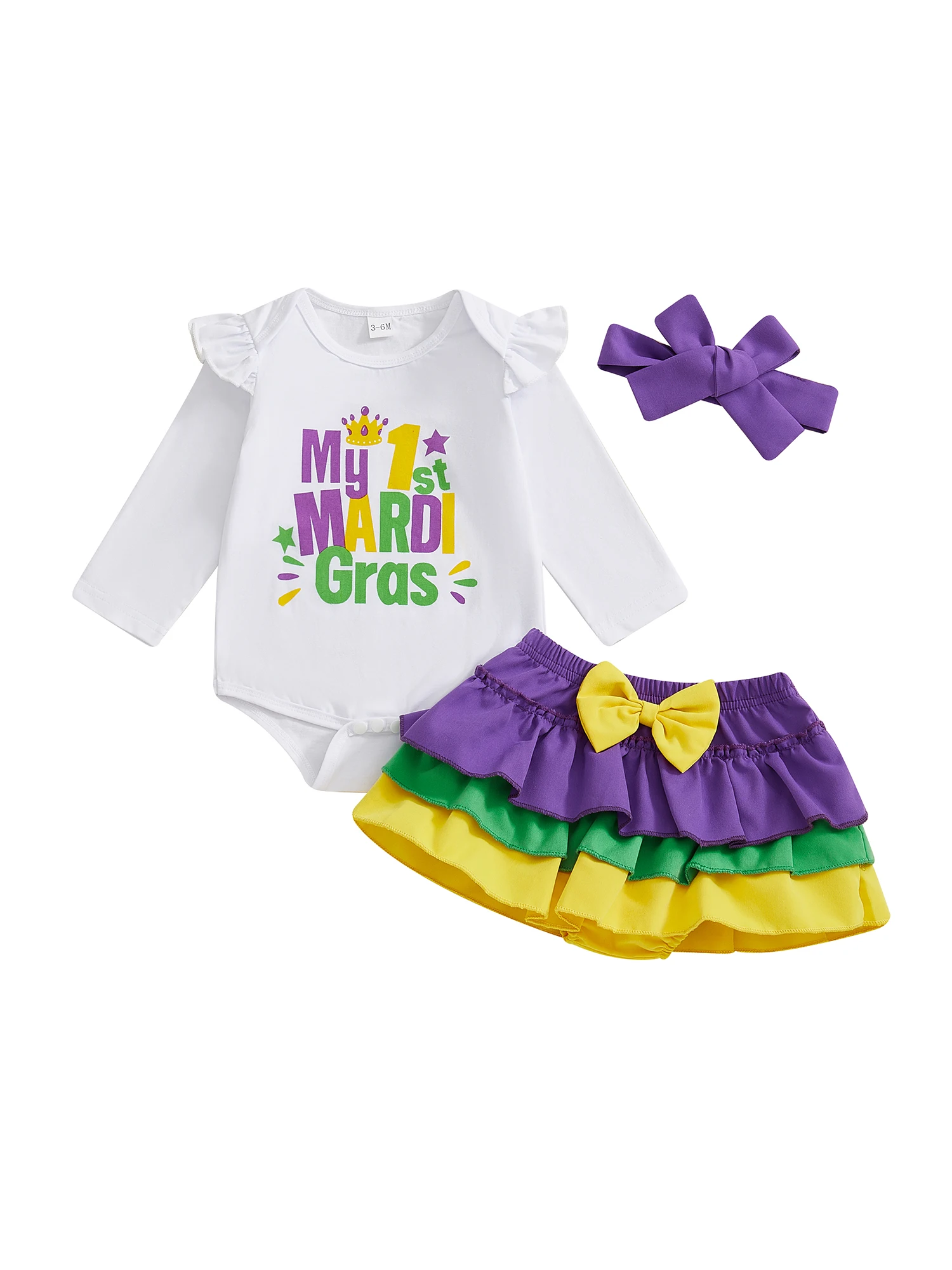 Conjunto de 3 piezas de mameluco de manga larga con letras para niña Mardi Gras y diadema con lazo
