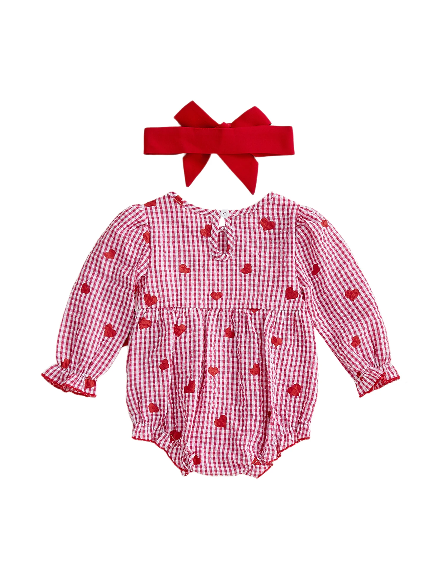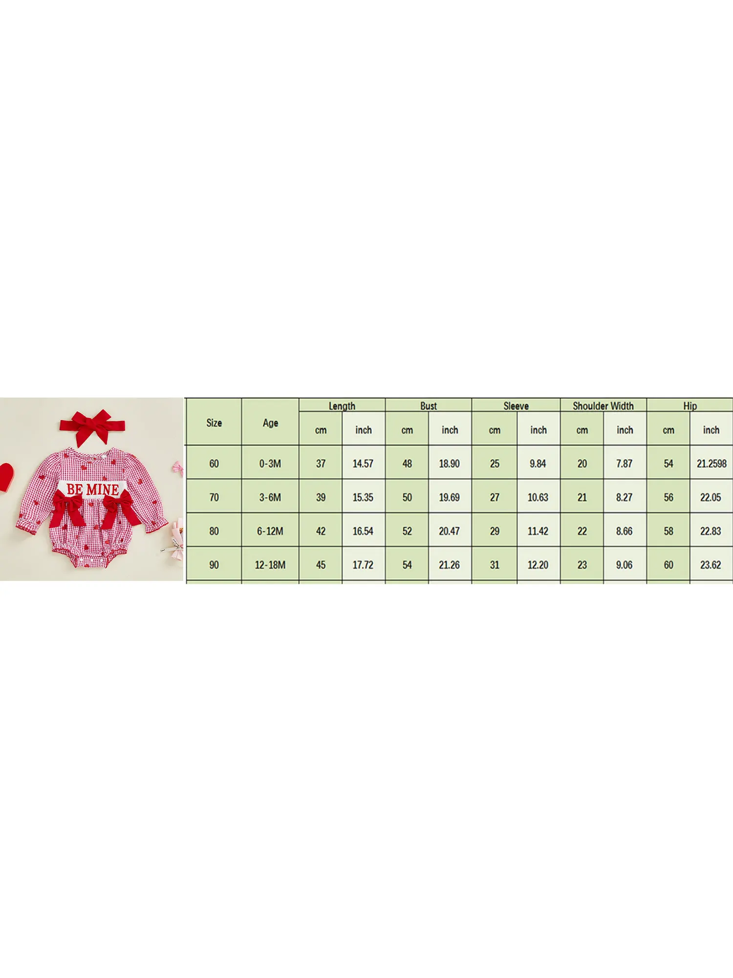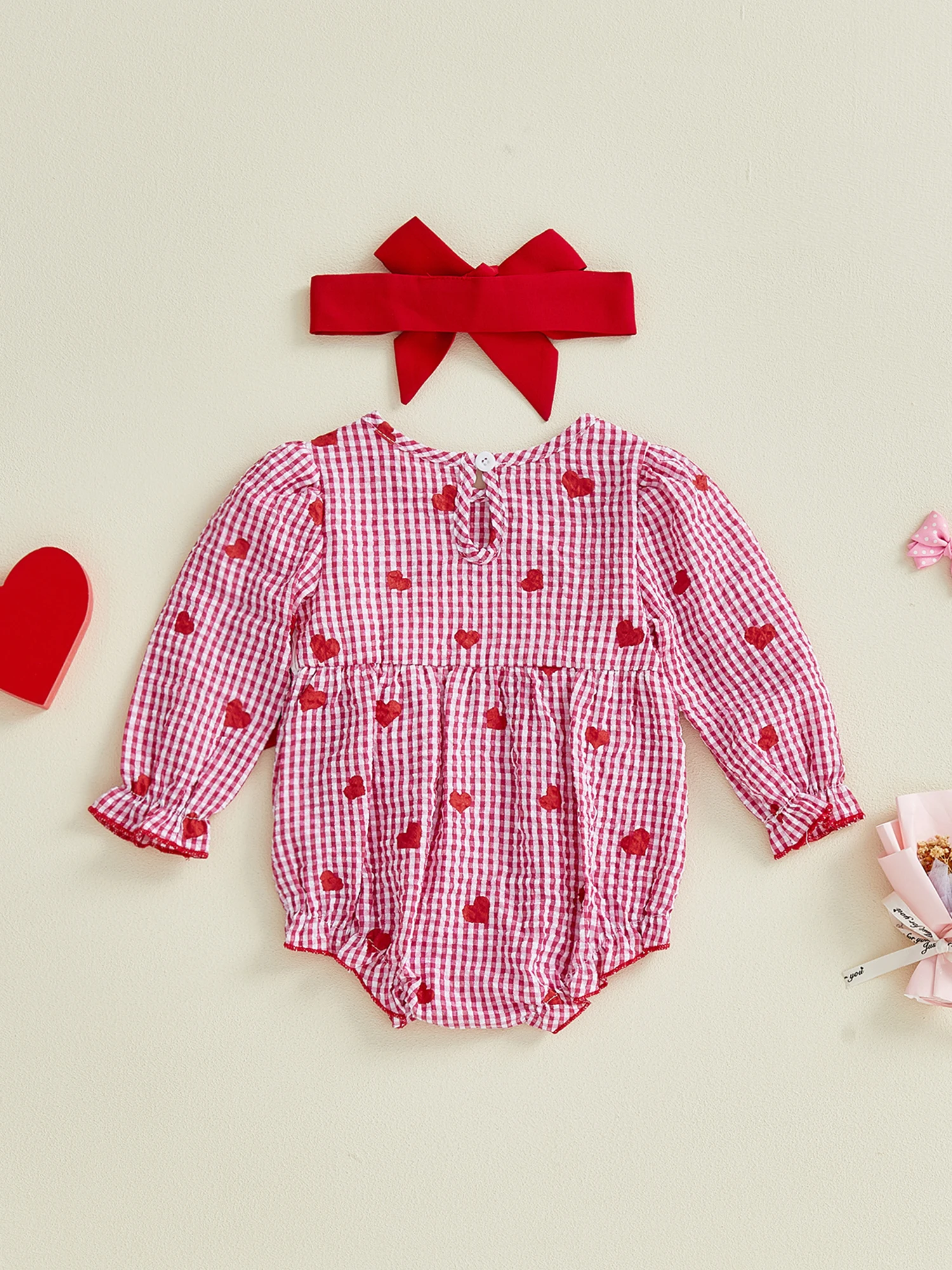 Conjunto de mameluco bordado de corazón de manga larga para el día de San Valentín para niña con diadema, ropa para recién nacido