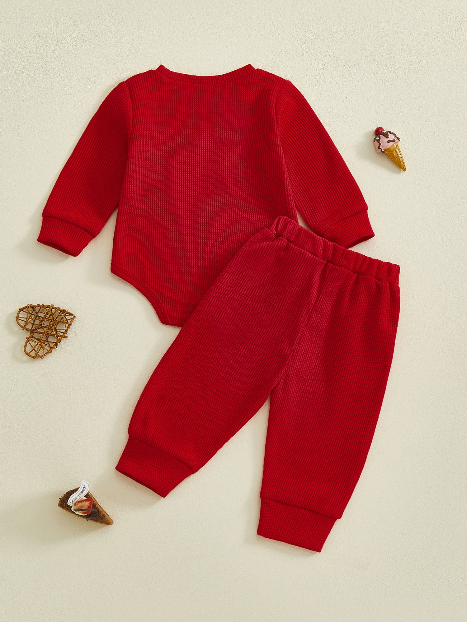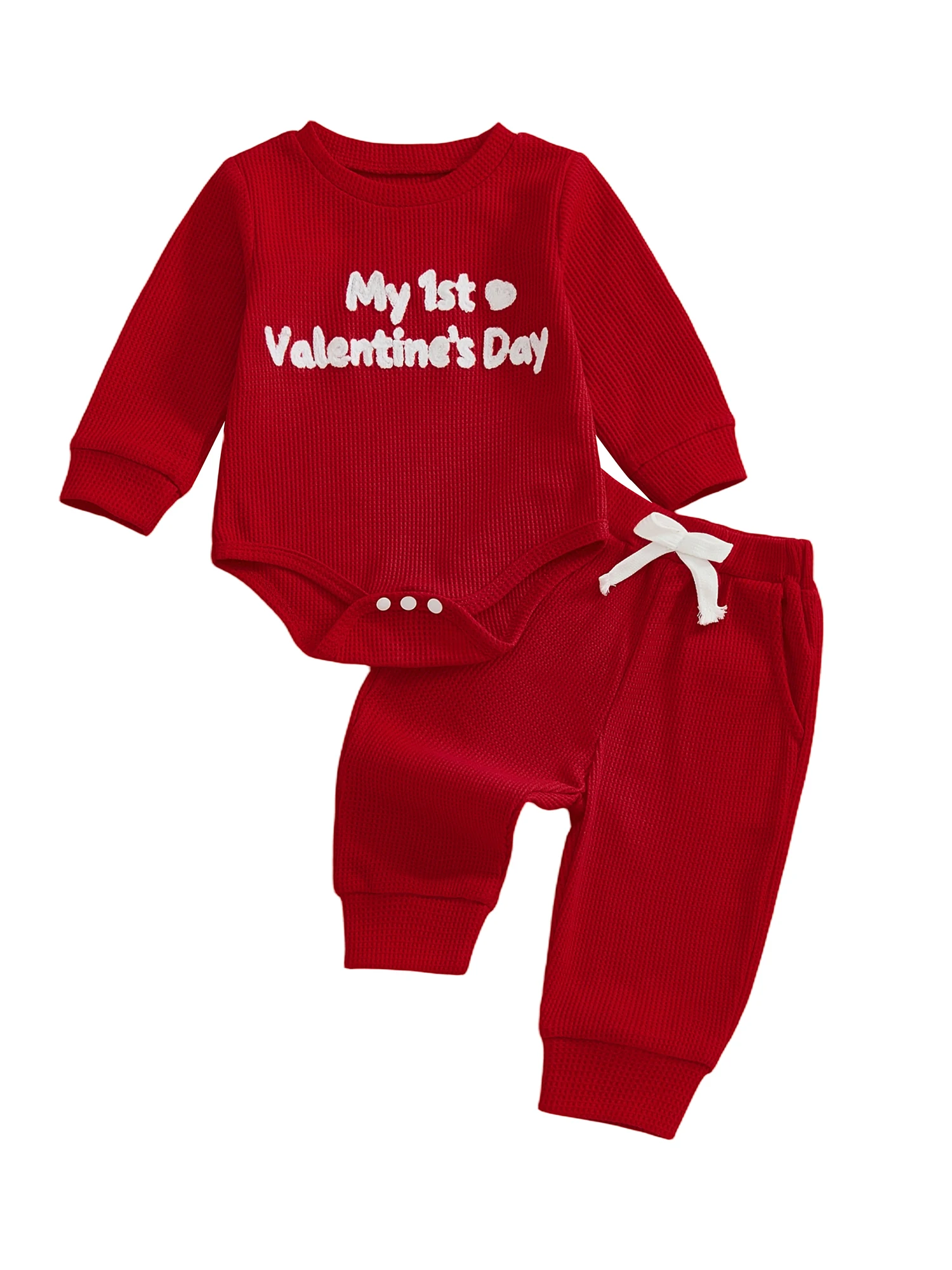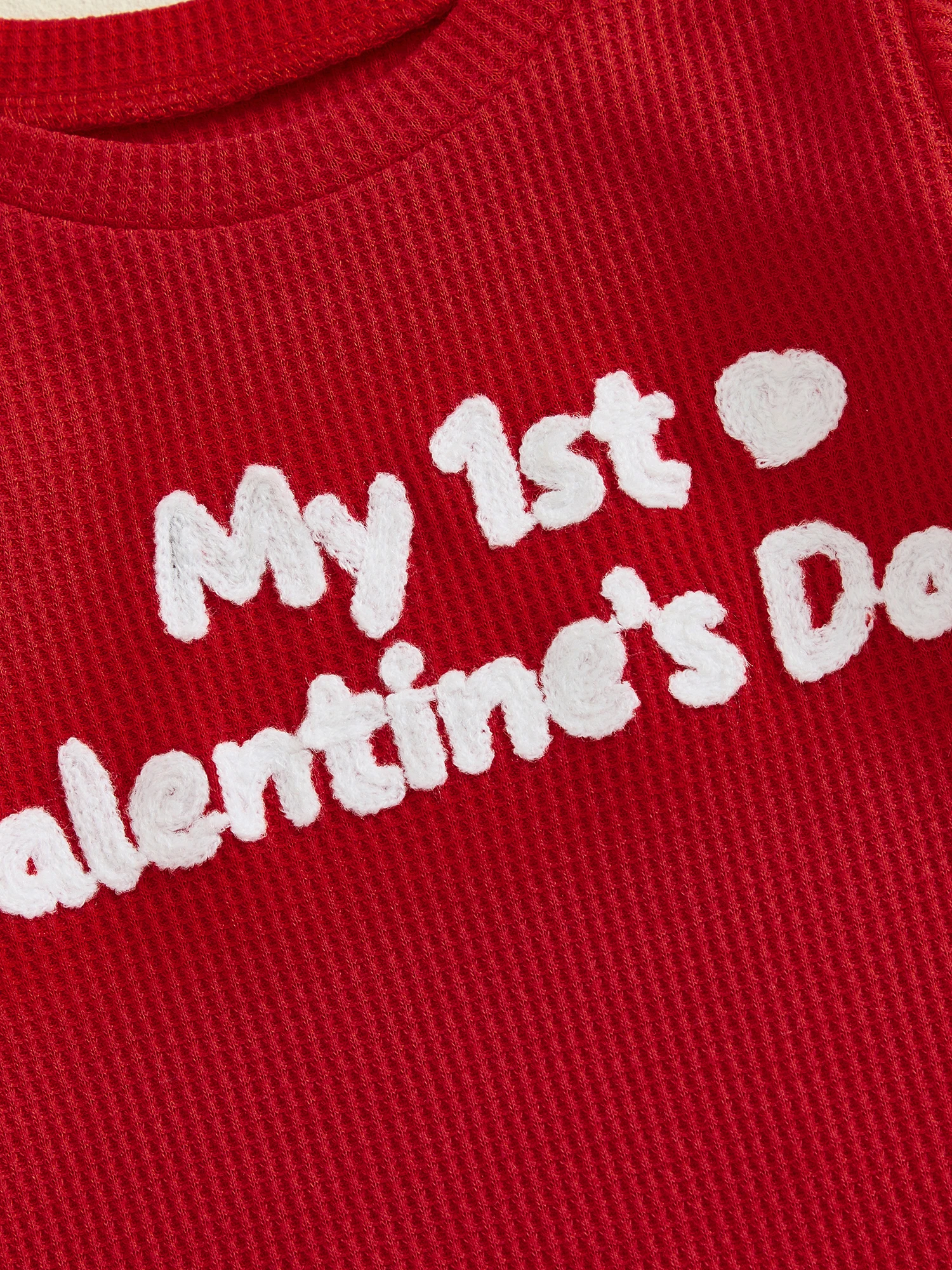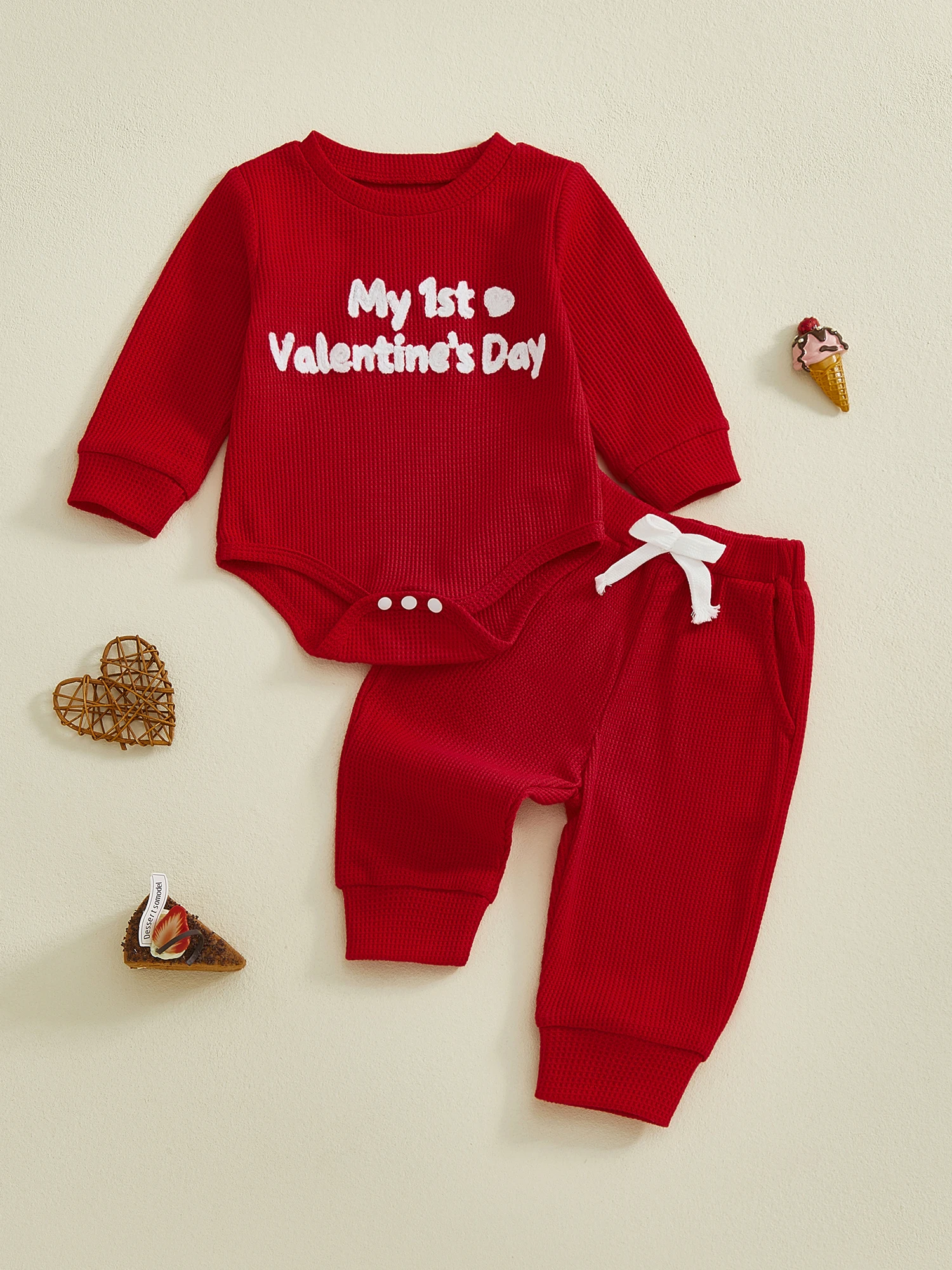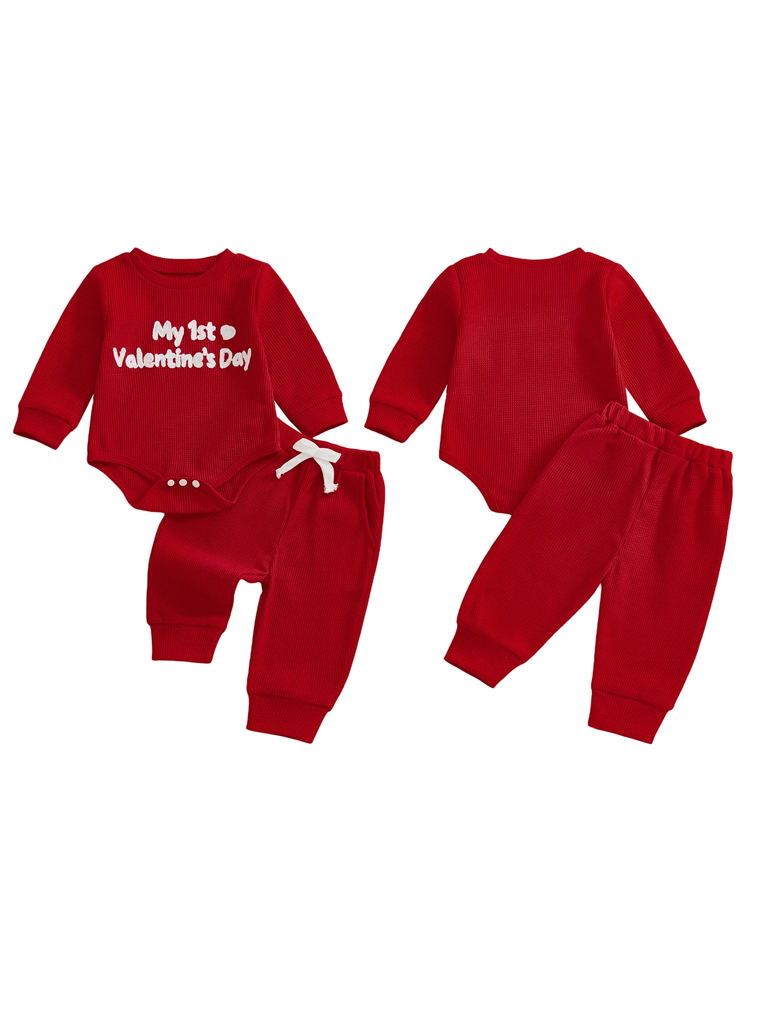 Conjunto de pantalones con cordón para mameluco bordado de letras y cuello redondo de manga larga para el día de San Valentín para bebés
