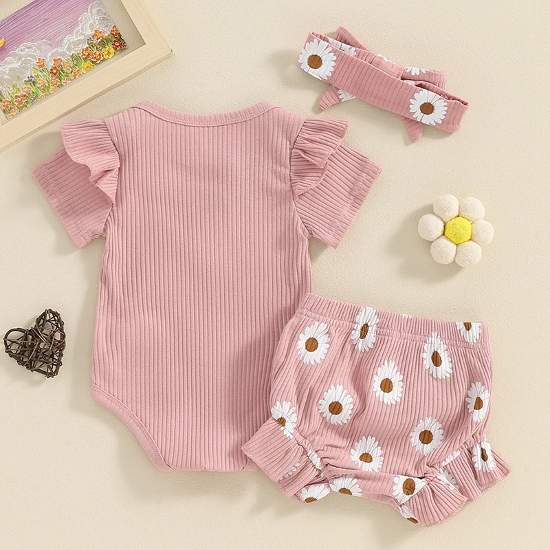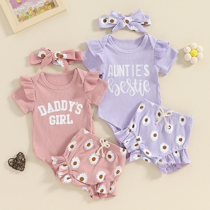 Comprar SUNSIOM-Conjunto de pantalones cortos para niña, Pelele de manga corta con estampado de letras y flores, con banda para el pelo, traje de verano