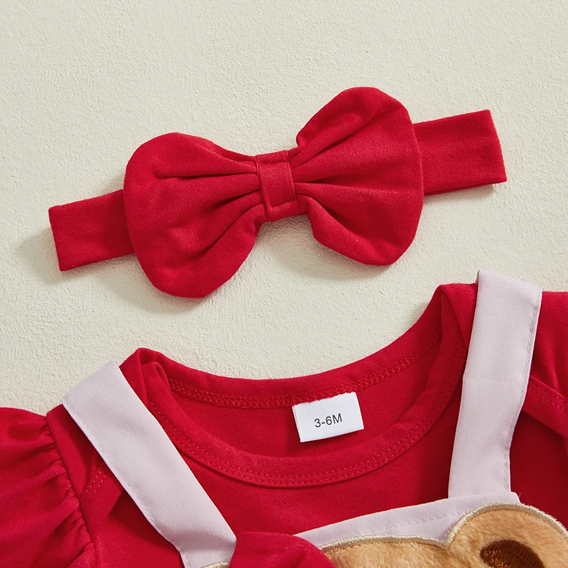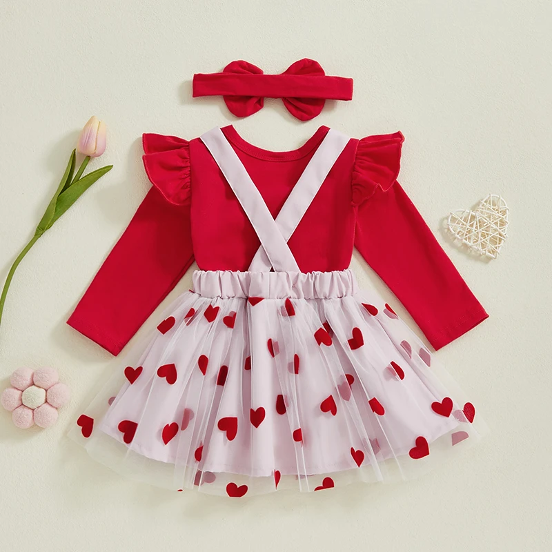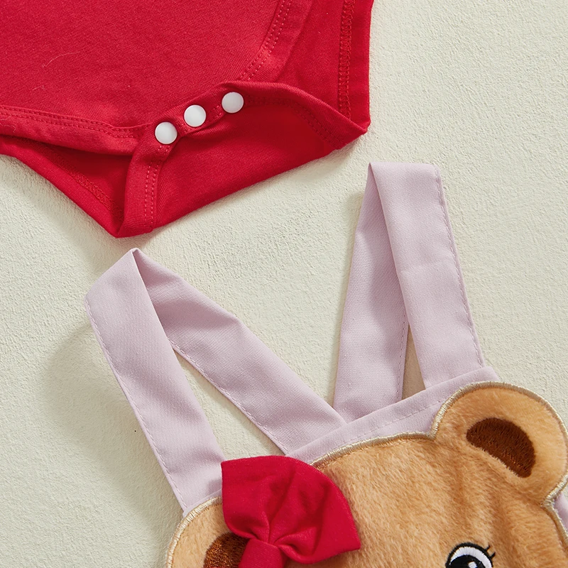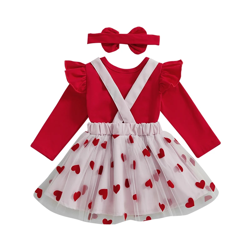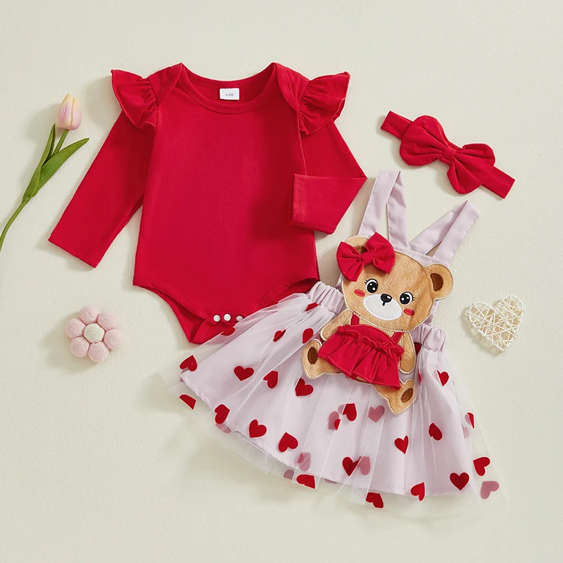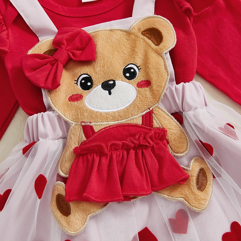 Comprar SUNSIOM Conjunto de ropa para el día de San Valentín para niña, mameluco de manga larga con oso de dibujos animados, falda con tirantes de tul, diadema