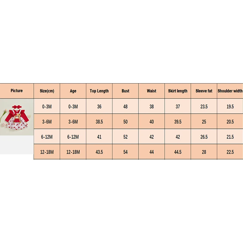 Conjunto de mameluco de manga larga para el día de San Valentín para niña + falda con tirantes de tul + conjunto de diademaCaracterísticas:-- Deja que tu pequeño disfrute de la acogedora tela todo el tiempo.-- Lavar suavemente a máquina en frío.Colgar para secar.No planchar ni blanquear.-- Consulta la tabla de tallas antes de comprar.Tamaño (cm)0-3M Longitud de la parte superior: 36 Busto: 48 Manga: 23.5 Hombro: 19.5 Longitud de los pantalones: 37 Cintura: 38 Edad recomendada: 0-3 meses3-6M Longitud de la parte superior: 38.5 Busto: 50 Manga: 25 Hombro: 20.5 Longitud de los pantalones: 39.5 Cintura: 40 Edad recomendada: 3-6 meses6-12M Longitud de la parte superior: 41 Busto: 52 Manga: 26.5 Hombro: 21.5 Longitud de los pantalones: 42 Cintura: 42 Edad recomendada: 6-12 meses12-18M Longitud de la parte superior: 43.5 Busto: 54 Manga: 28 Hombro: 22.5 Longitud de los pantalones: 44.5 Cintura: 44 Edad recomendada: 12-18 mesesTamaño (pulgadas)0-3M Longitud de la parte superior: 14.17 Busto: 18.90 Manga: 9.25 Hombro: 7.68 Longitud de los pantalones: 14.57 Cintura: 14.96 Edad recomendada: 0-3 meses3-6M Longitud de la parte superior: 15.16 Busto: 19.69 Manga: 9.84 Hombro: 8.07 Longitud de los pantalones: 15.55 Cintura: 15.75 Edad recomendada: 3-6 meses6-12M Longitud de la parte superior: 16.14 Busto: 20.47 Manga: 10.43 Hombro: 8.46 Longitud de los pantalones: 16.54 Cintura: 16.54 Edad recomendada: 6-12 meses12-18M Longitud de la parte superior: 17.13 Busto: 21.26 Manga: 11.02 Hombro: 8.86 Longitud de los pantalones: 17.52 Cintura: 17.32 Edad recomendada: 12-18 mesesEspecificación:Material: mameluco de bebé: 95% algodón, 5% elastano; Falda con tirantes: 100% poliésterColor rojoGénero: niñasEstilo: dulce, casualTemporada: primavera, otoño.Paquete incluido1 pelele.1 falda con tirantes.1 diadema.