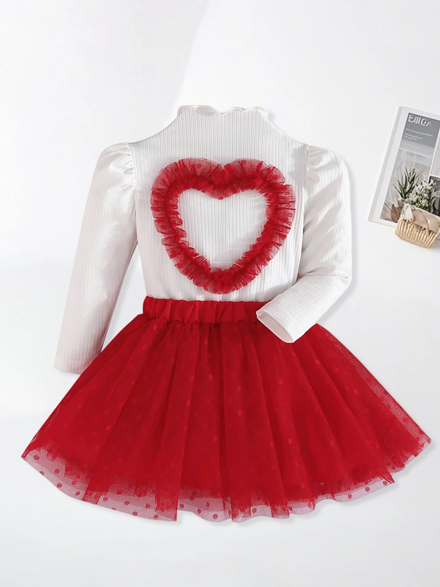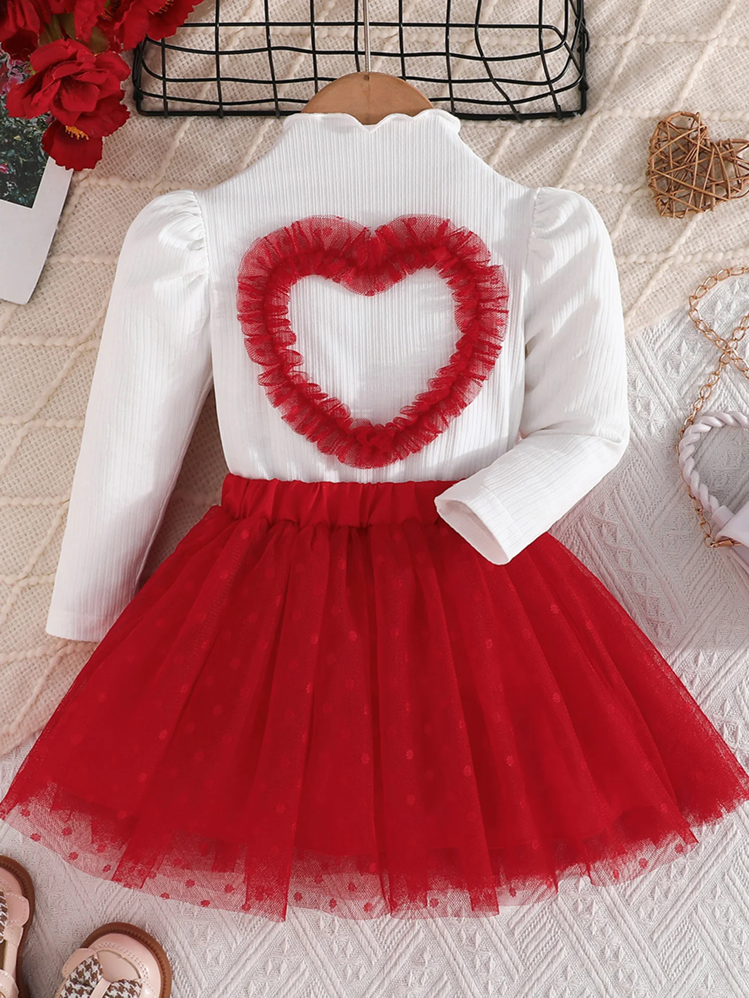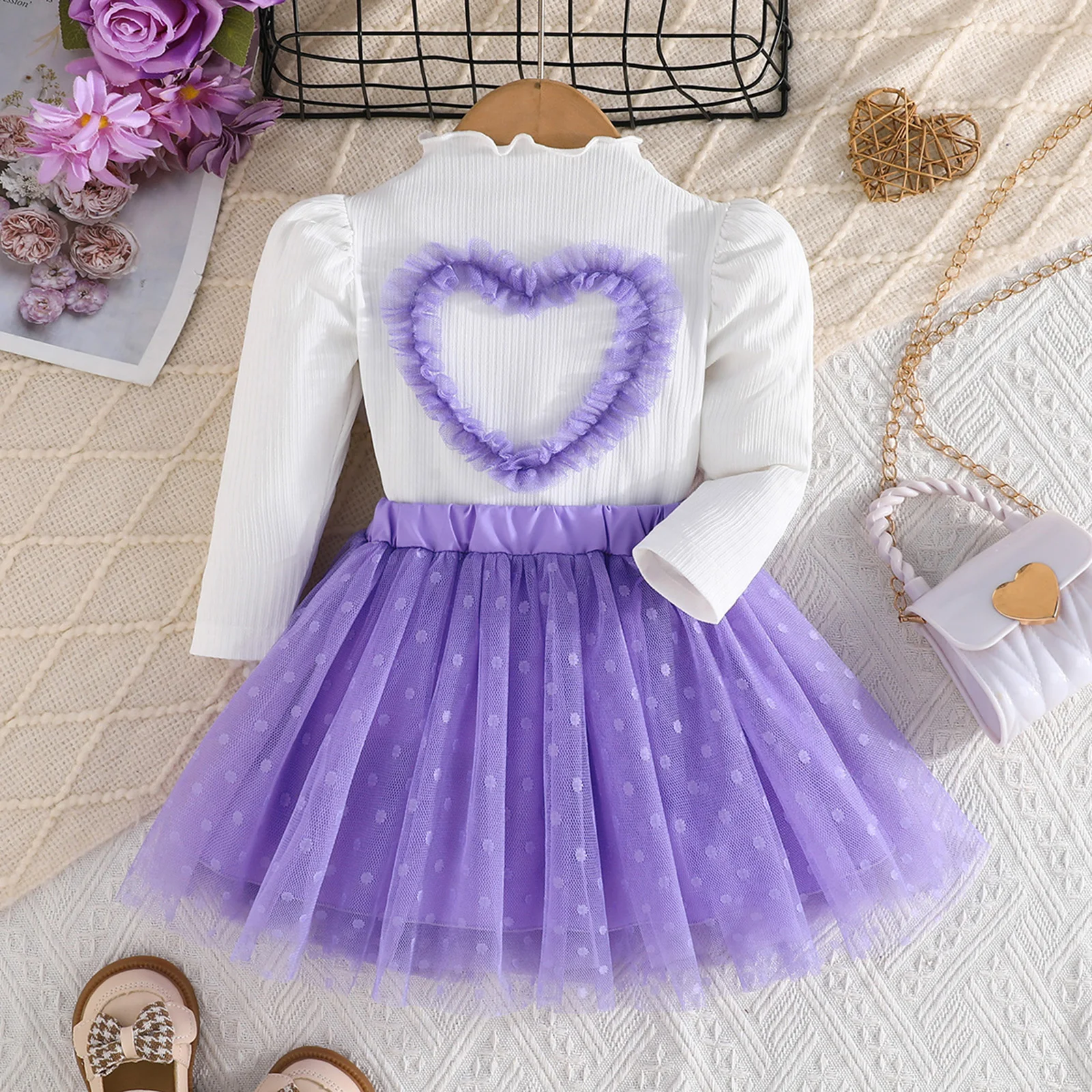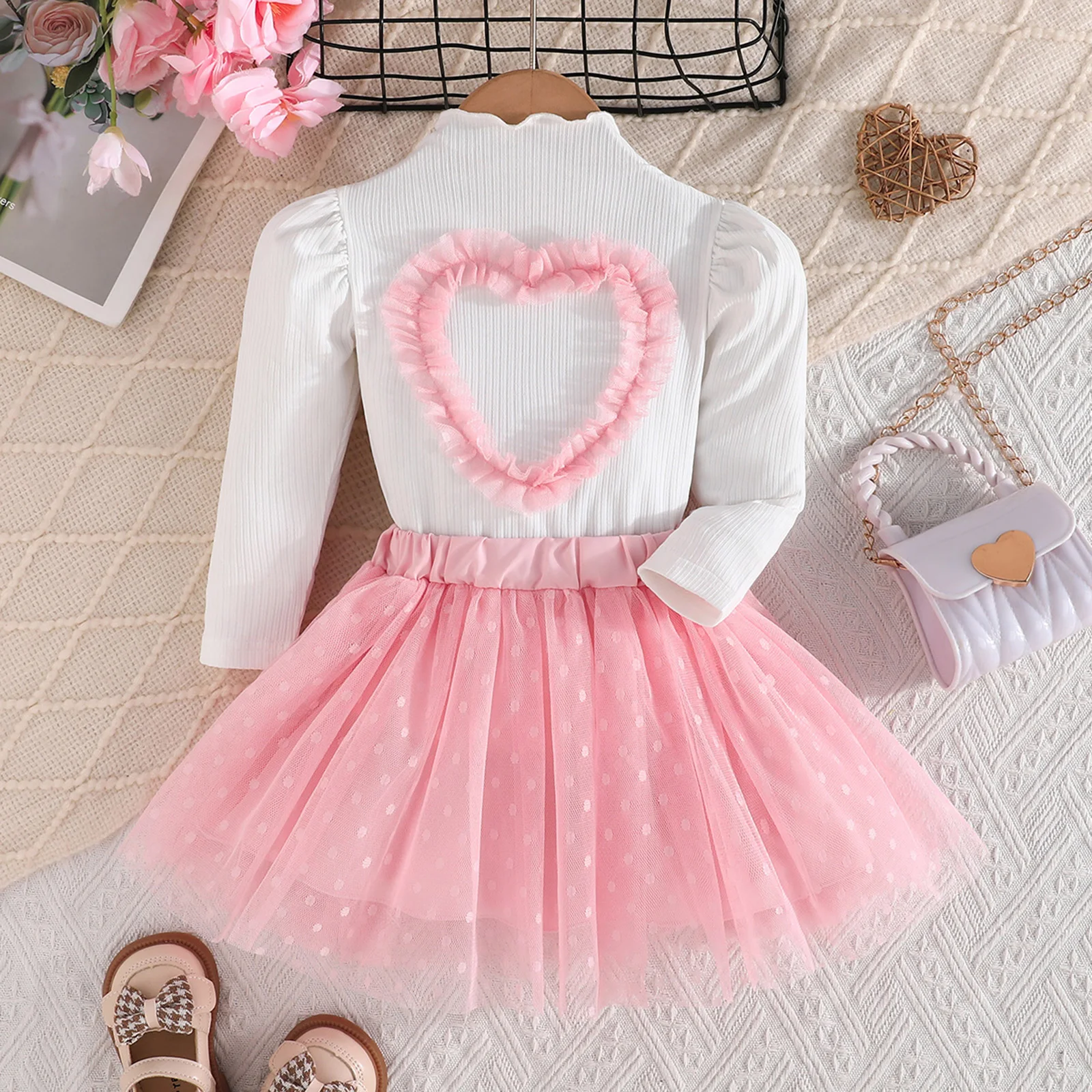 Conjunto de ropa para niñas pequeñas, jersey de manga larga con forma de corazón y falda de tul con puntos, traje de 2 uds.