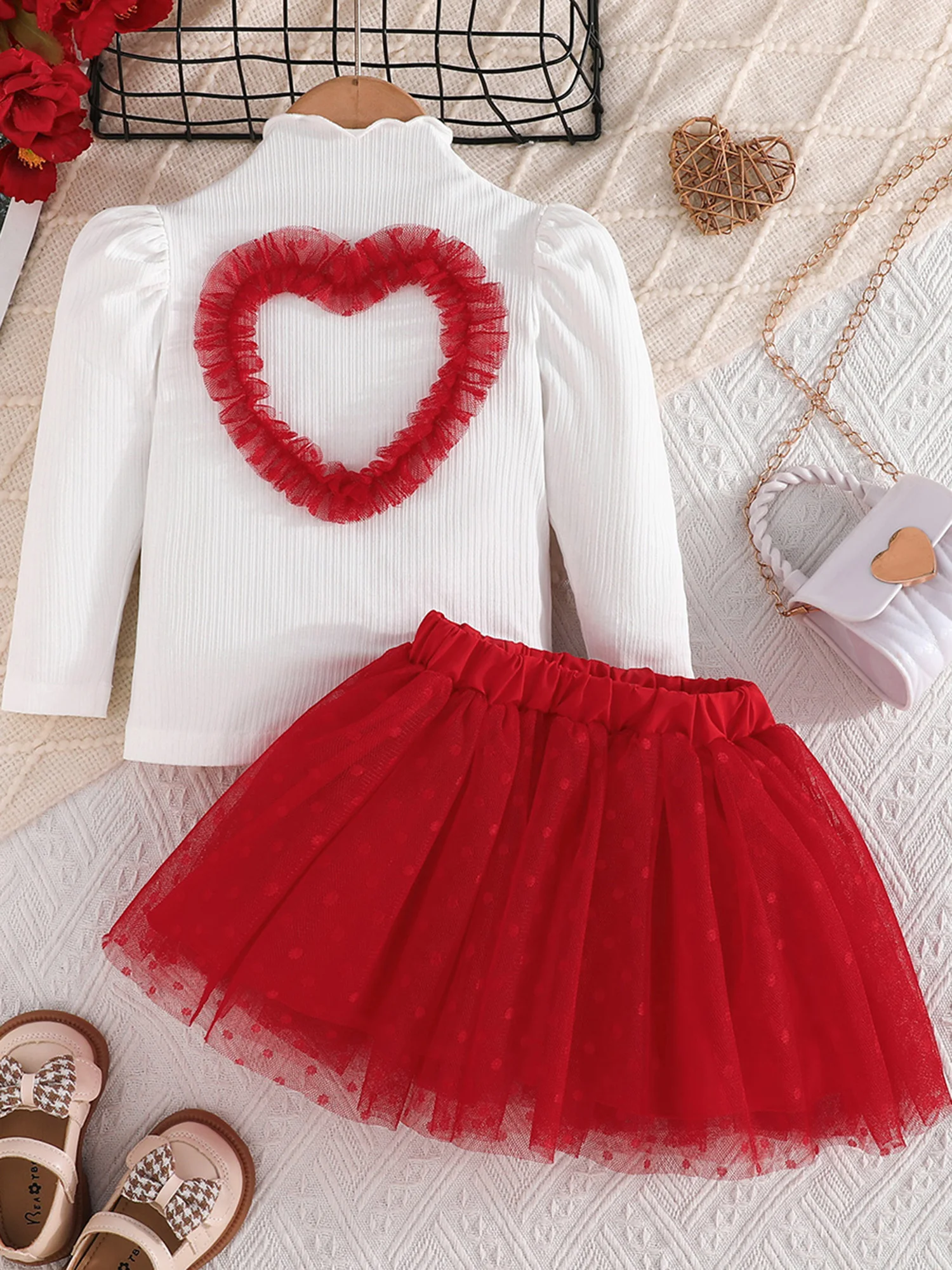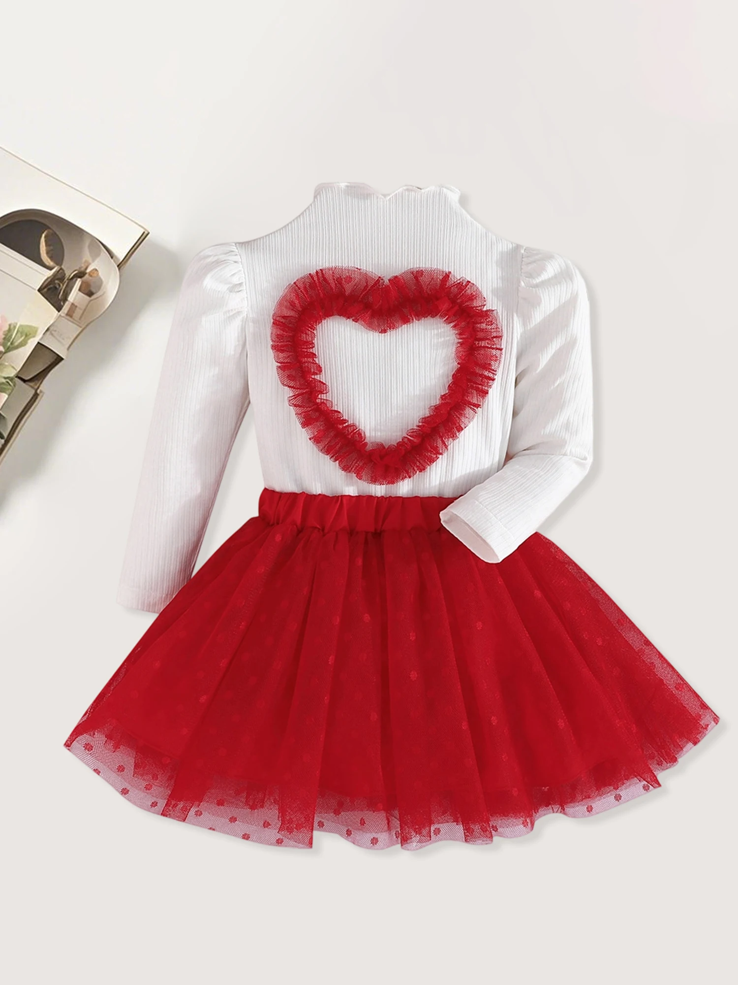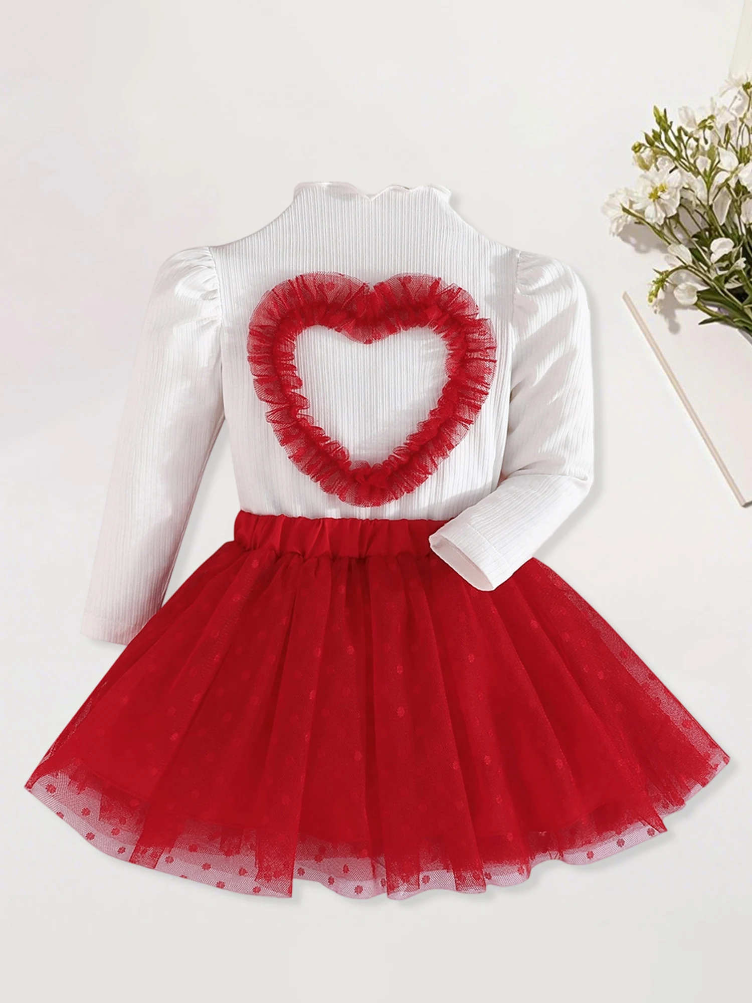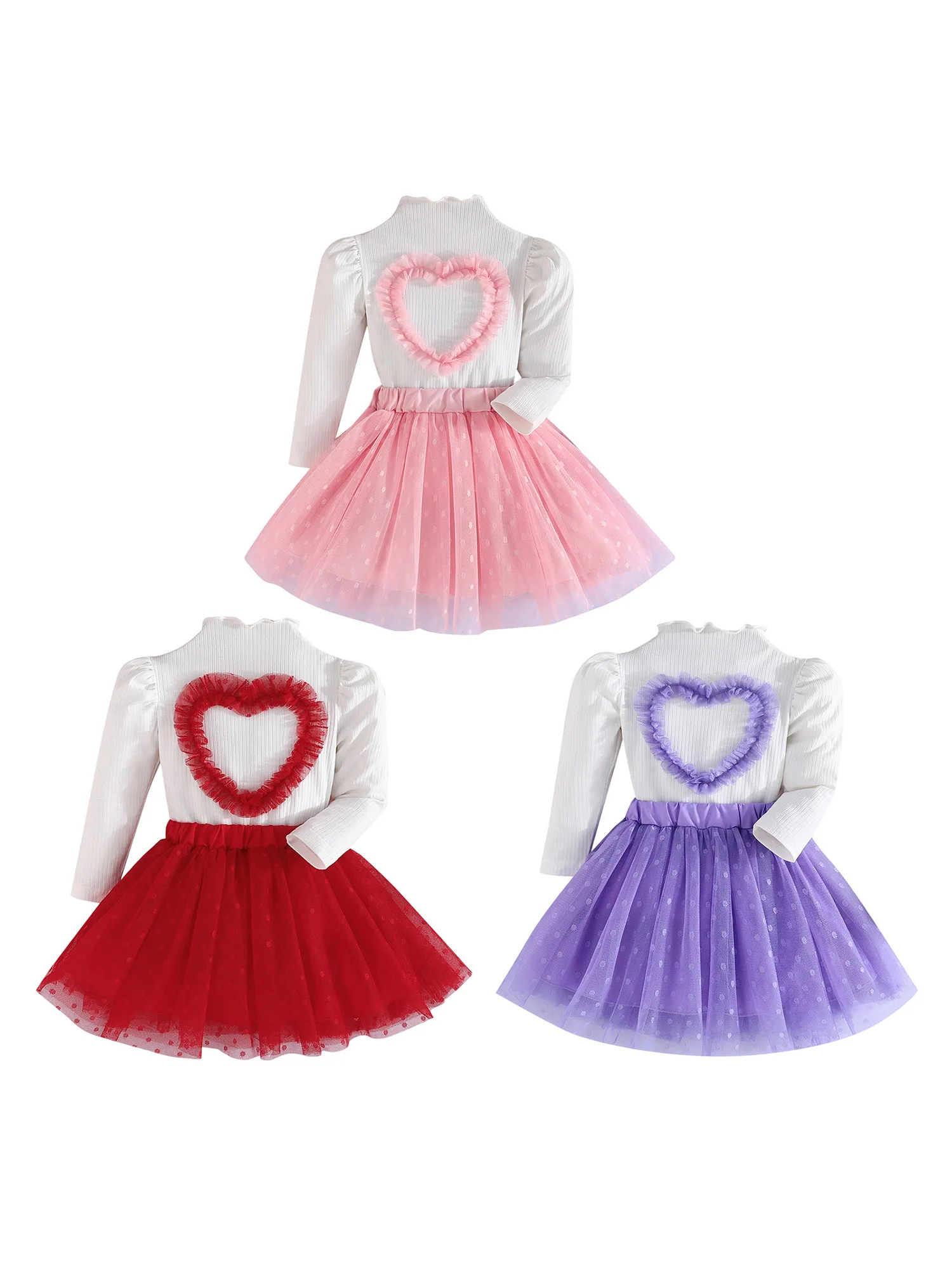 Conjunto de ropa para niñas pequeñas, jersey de manga larga con forma de corazón y falda de tul con puntos, traje de 2 uds.