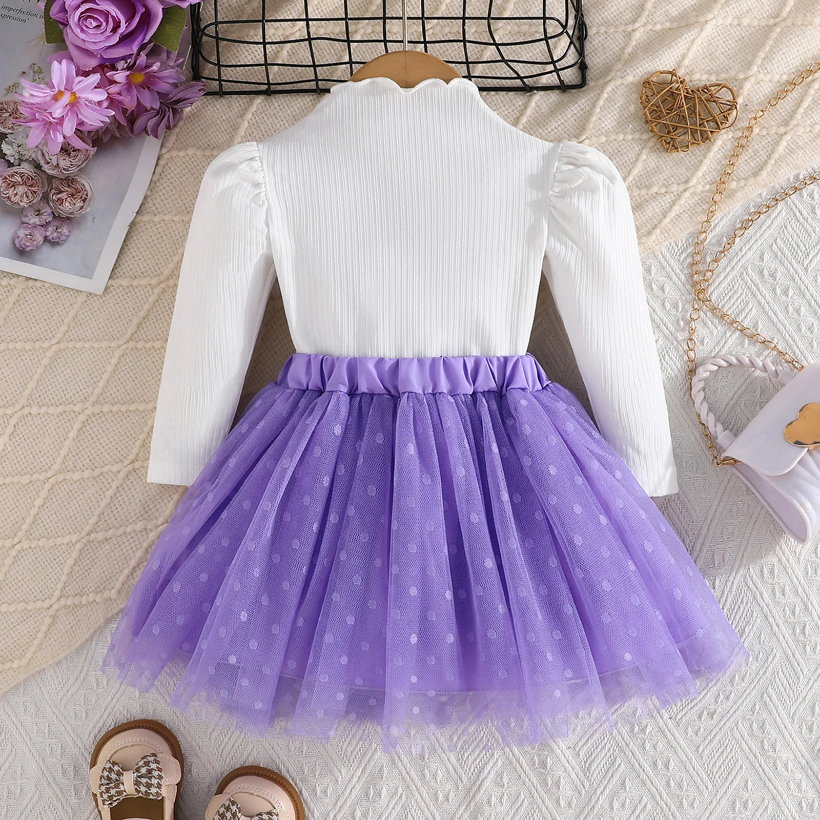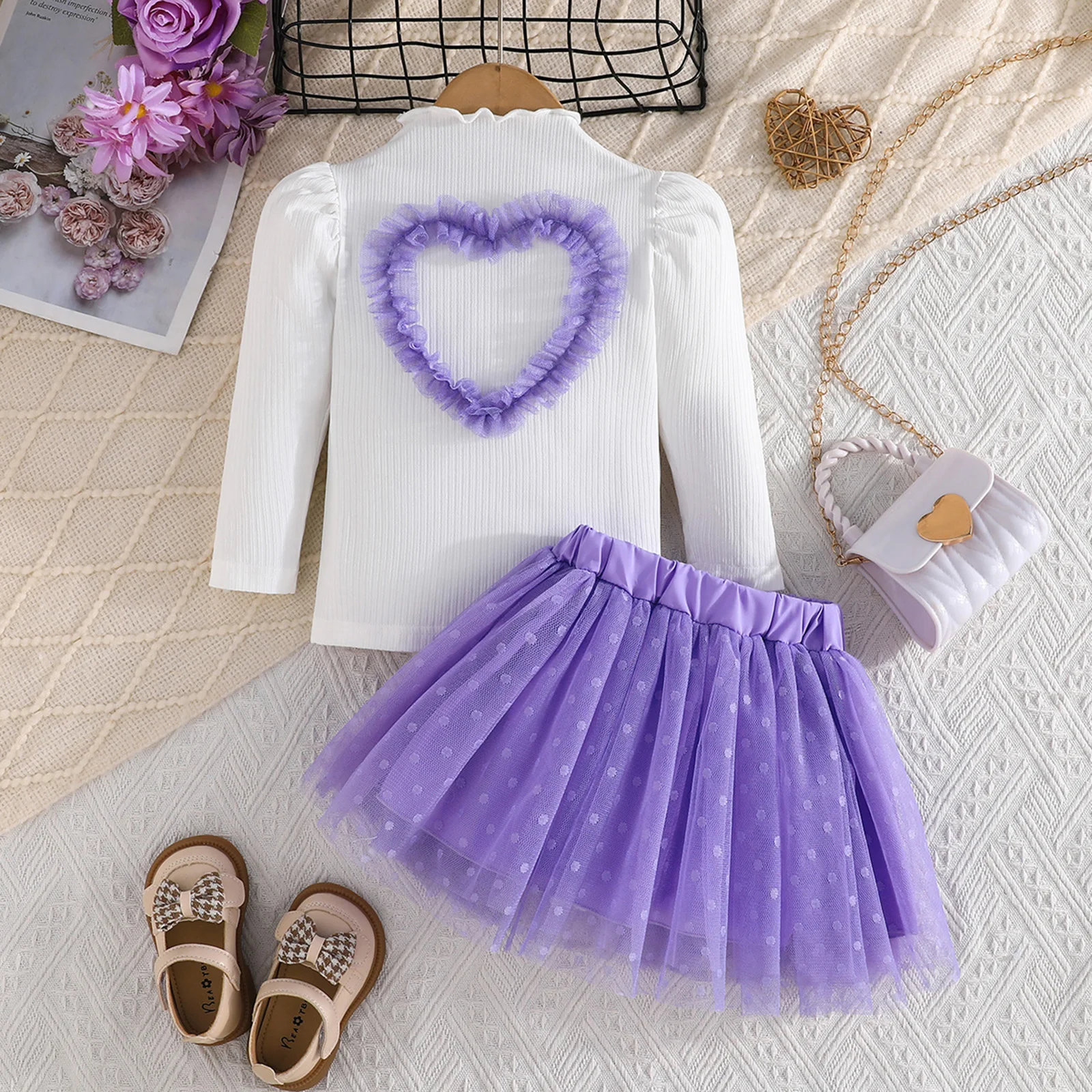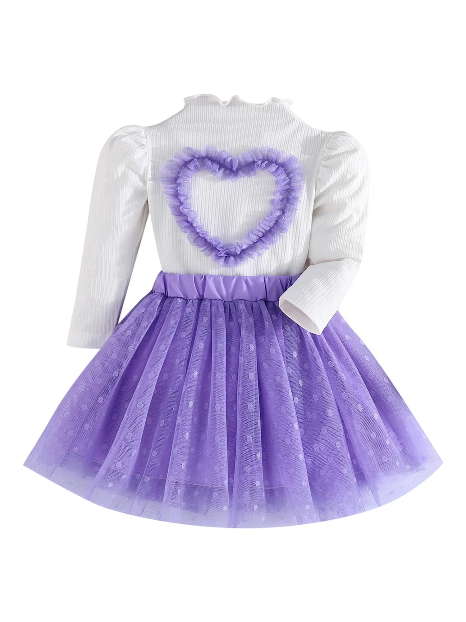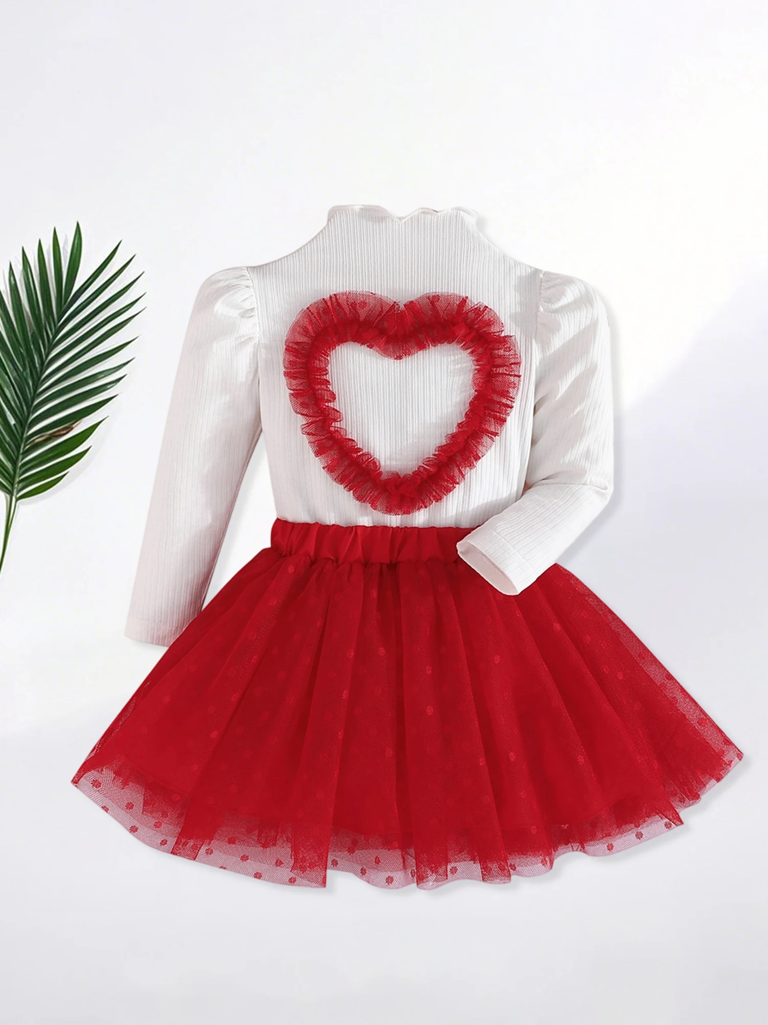Conjunto de ropa para niñas pequeñas, jersey de manga larga con forma de corazón y falda de tul con puntos, traje de 2 uds.