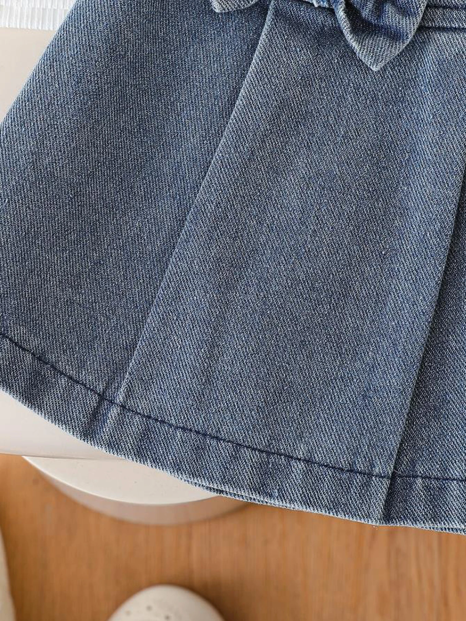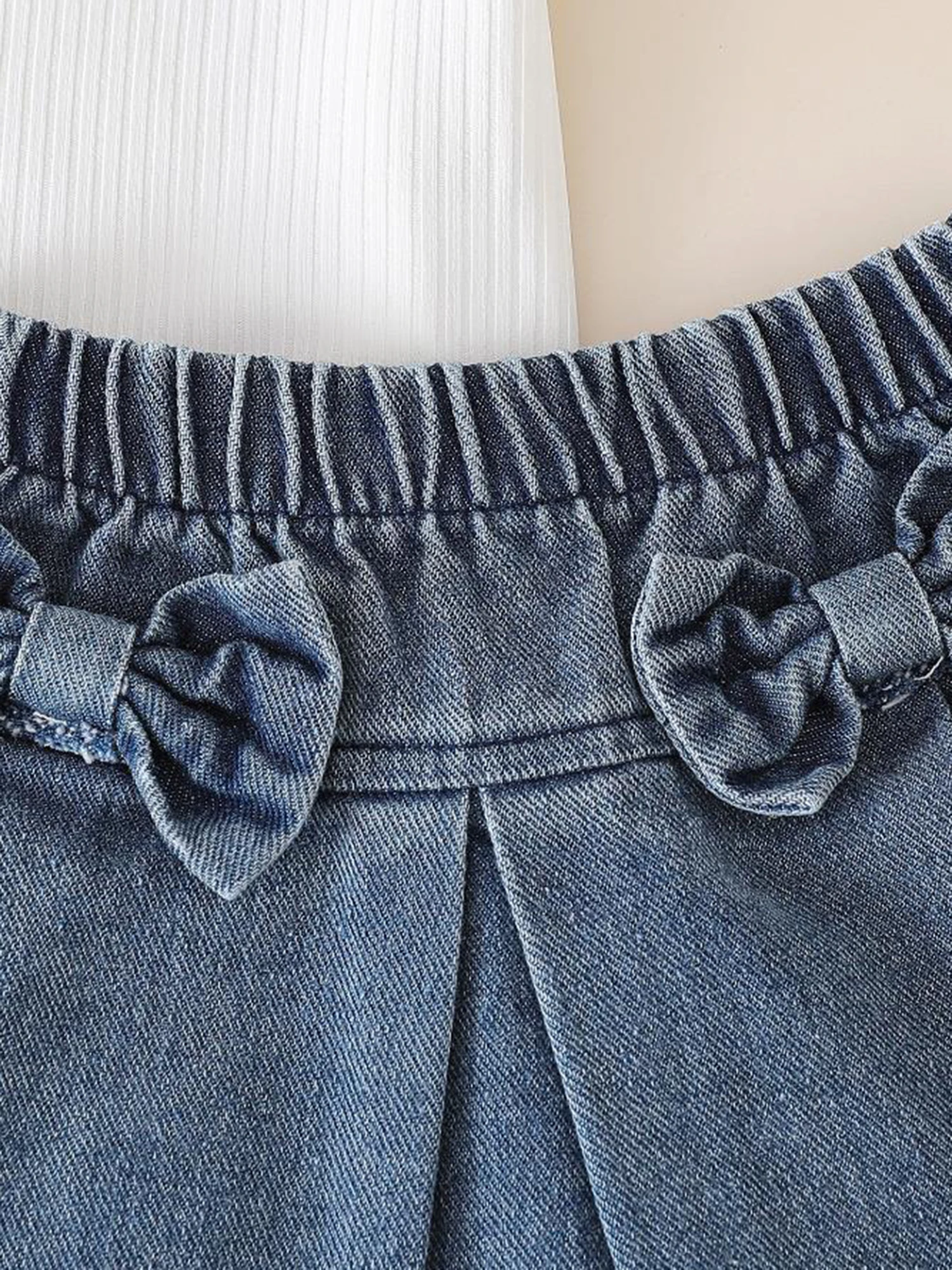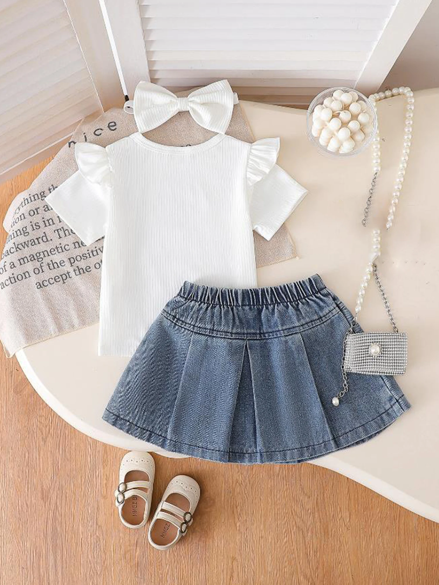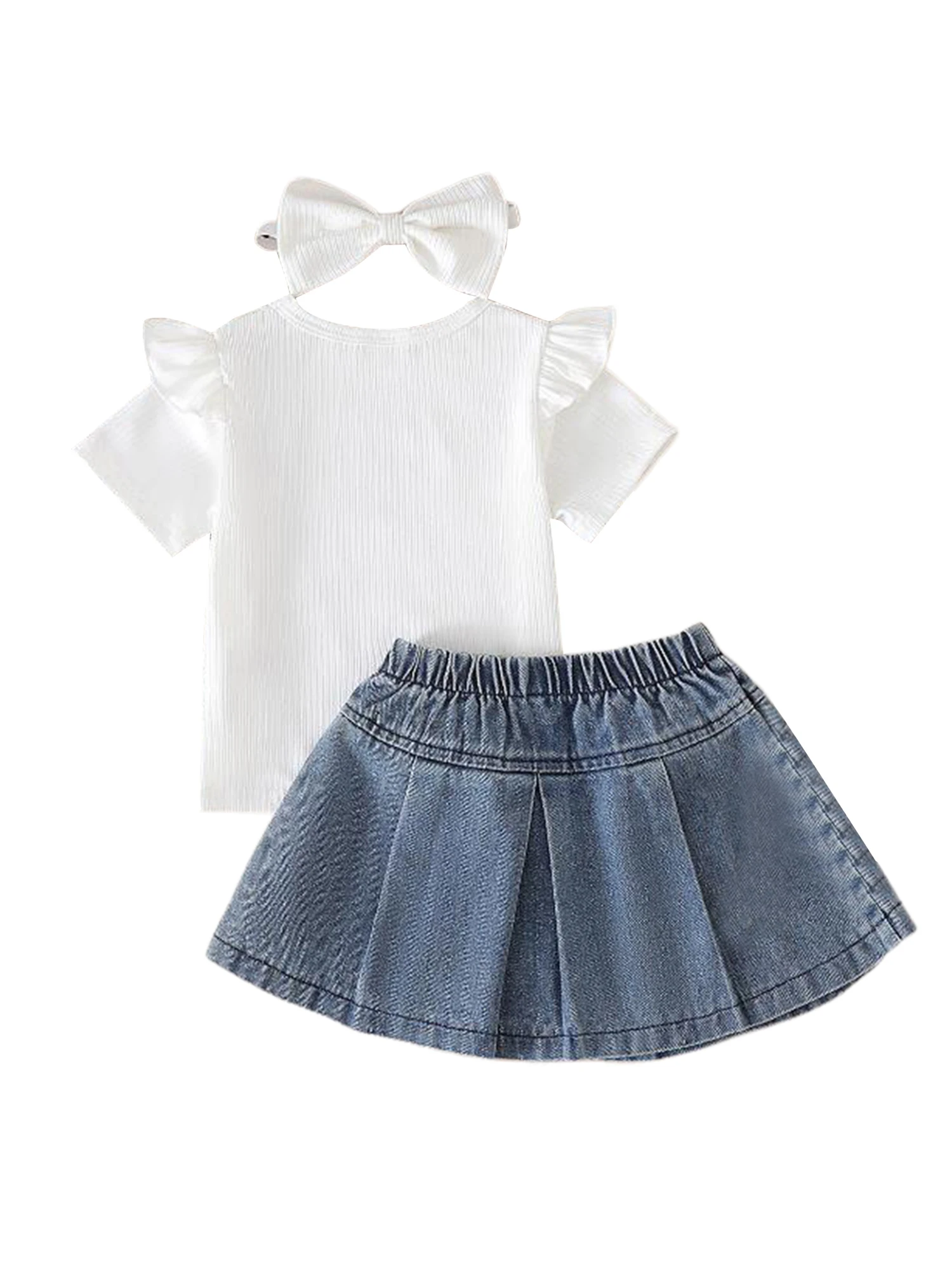 Conjunto de verano para niña, camiseta de manga corta con volantes de Color sólido y falda vaquera con lazo, conjunto de diadema, ropa linda informal