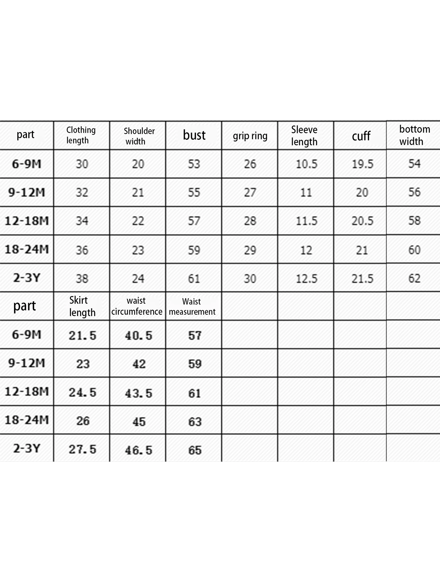 Tamaño (cm) 6-9M Longitud de la camiseta: 30 Busto: 53 Manga: 10,5 Hombro: 20 Longitud de la falda: 21,5 Cintura: 40,5 Edad recomendada: 6-9 meses 9-12M Longitud de la camiseta: 32 Busto: 55 Manga: 11 Hombro: 21 Longitud de la falda: 23 Cintura: 42 Edad recomendada: 9-12 meses 12-18M Longitud de la camiseta: 34 Busto: 57 Manga: 11,5 Hombro: 22 Longitud de la falda: 24,5 Cintura: 43,5 Edad recomendada: 12-18 meses 18-24M Longitud de la camiseta: 36 Busto: 59 Manga: 12 Hombro: 23 Longitud de la falda: 26 Cintura: 45 Edad recomendada: 18-24 meses 2-3Y Longitud de la camiseta: 38 Busto: 61 Manga: 12,5 Hombro: 24 Longitud de la falda: 27,5 Cintura: 46,5 Edad recomendada: 2-3 años