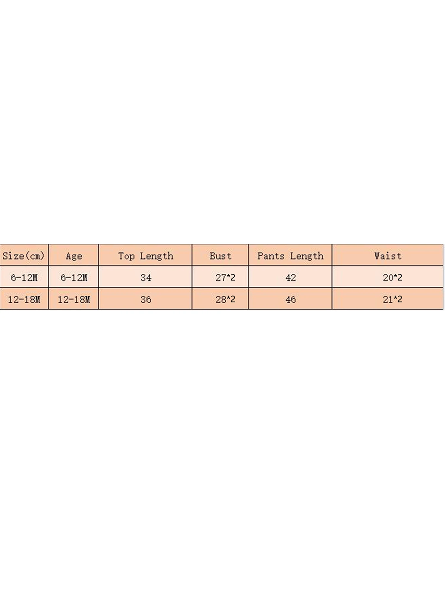 Tamaño (cm) 6-12M Longitud de la camiseta: 34 Busto: 54 Longitud de los pantalones: 54 Cintura: 40 Edad recomendada: 6-12 meses 12-18M Longitud de la camiseta: 36 Busto: 56 Longitud de los pantalones: 46 Cintura: 42 Edad recomendada: 12-18 meses