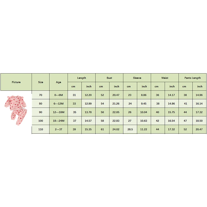 Conjunto de 2 piezas de otoño para niñas pequeñas, manga larga, cuello redondo, lazo, estampado de corazones, conjunto de pantalones con cordónTamaño (cm)70 Longitud de la camiseta: 31 Busto: 52 Manga: 22,5 Longitud de pantalones: 38 Cintura: 36 Cadera: 54 Edad recomendada: 0-6 meses80 Longitud de la camiseta: 33 Busto: 54 Manga: 24 Longitud de los pantalones: 41 Cintura: 38 Cadera: 56 Edad recomendada: 6-12 meses90 Longitud de la camiseta: 35 Busto: 56 Manga: 25,5 Longitud de pantalones: 44 Cintura: 40 Cadera: 58 Edad recomendada: 12-18 meses100 Longitud de la camiseta: 37 Busto: 58 Manga: 27 Longitud de pantalones: 47 Cintura: 42 Cadera: 60 Edad recomendada: 18-24 meses110 Longitud de la camiseta: 39 Busto: 61 Manga: 28,5 Longitud de pantalones: 51 Cintura: 44 Cadera: 63 Edad recomendada: 2-3 añosTamaño (pulgadas)70 Longitud de la camiseta: 12,2 Busto: 20.47 Manga: 8,86 Longitud de los pantalones: 14,96 Cintura: 14,17 Cadera: 21.26 Edad recomendada: 0-6 meses80 Longitud de la camiseta: 12,99 Busto: 21,26 Manga: 9,45 Largo de pantalones: 16,14 Cintura: 14,96 Cadera: 22,05 Edad recomendada: 6-12 meses90 Longitud de la camiseta: 13,78 Busto: 22,05 Manga: 104,04 Longitud de los pantalones: 17,32 Cintura: 15,75 Cadera: 22,83 Edad recomendada: 12-18 meses100 Longitud de la camiseta: 14,57 Busto: 22,83 Manga: 10,63 Longitud de los pantalones: 18,5 Cintura: 16,54 Cadera: 23,62 Edad recomendada: 18-24 meses110 Longitud de la camiseta: 15,35 Busto: 24.02 Manga: 11.22 Longitud de los pantalones: 20,08 Cintura: 17,32 Cadera: 24,8 Edad recomendada: 2-3 añosEspecificación:Material: 70% algodón, 30% poliésterLongitud de la manga: largaTipo de patrón: Corazón con lazoGénero: NiñaTipo de artículo: conjuntosPaquete incluido:1 camiseta + 1 pantalón.Consejos amigables:1.Por favor permita una diferencia del 2-3% según la medición manual.2.Consulte cuidadosamente la tabla de medidas antes de comprar el artículo.(1 pulgada=2,54 cm)3.Tenga en cuenta que debe aceptarse una ligera diferencia de color debido a la luz y la pantalla.Gracias.Promesa:Si el producto tiene algún problema de calidad, háganoslo saber, lo ayudaremos a resolver el problema lo más rápido posible.