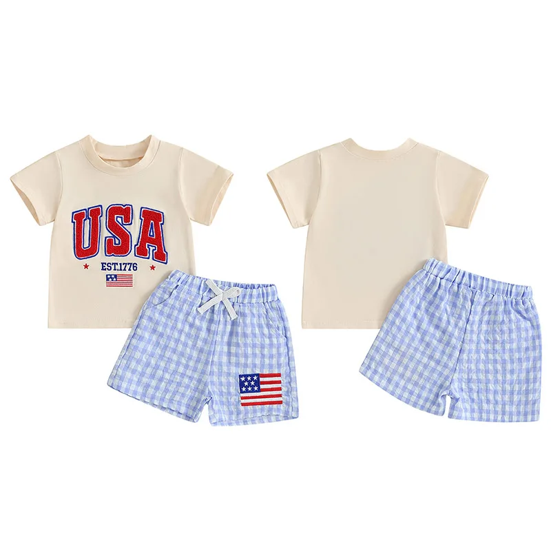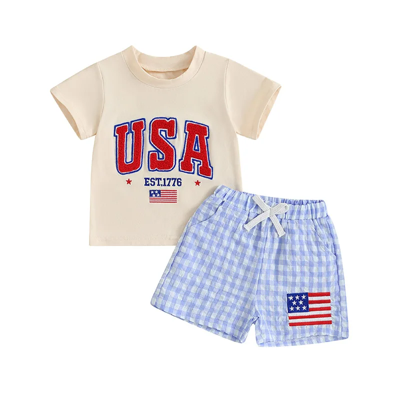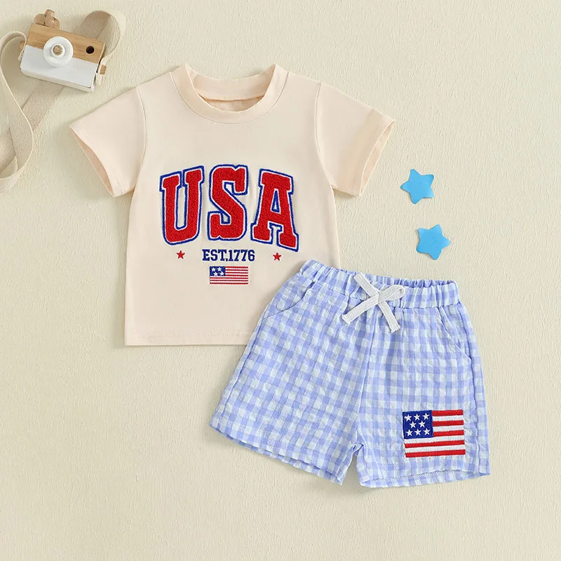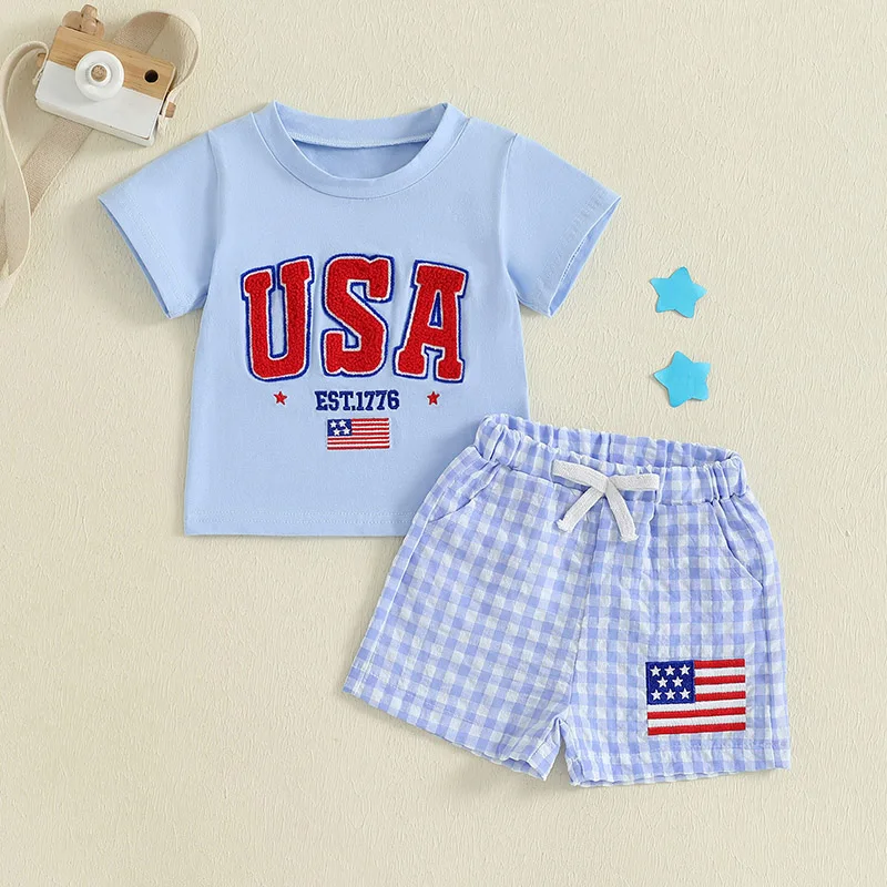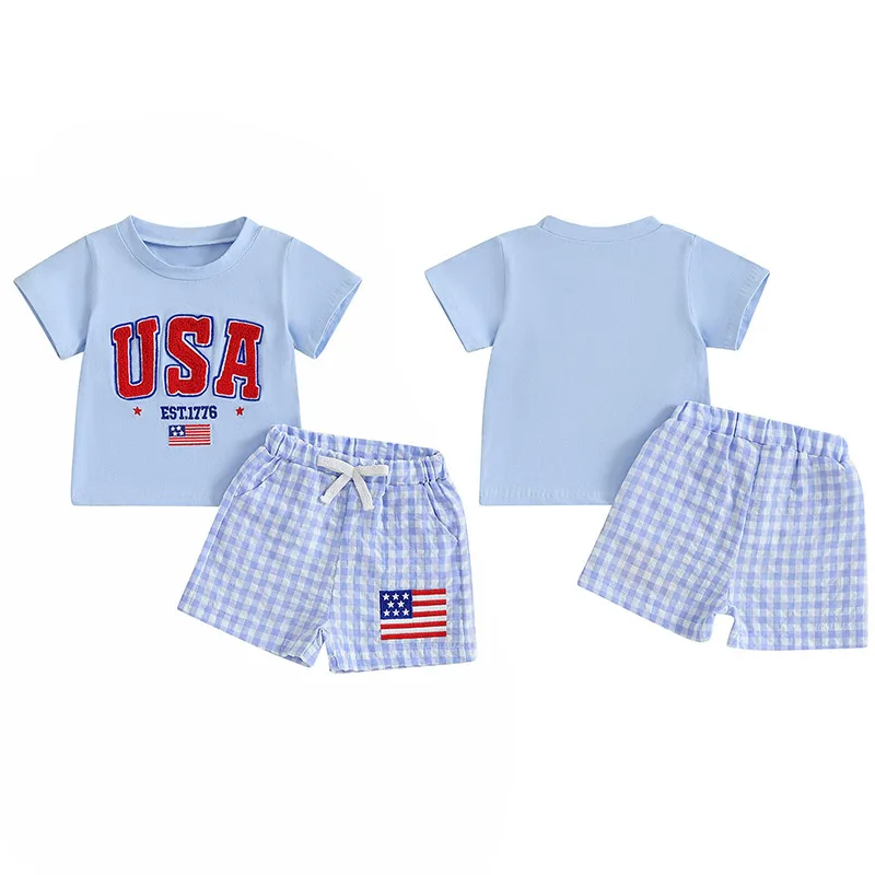 Comprar SUNSIOM Conjuntos patrióticos para bebés de 0 a 4 años, camiseta de manga corta con estampado de letras y pantalones cortos elásticos a cuadros, conjunto de ropa de 2 piezas