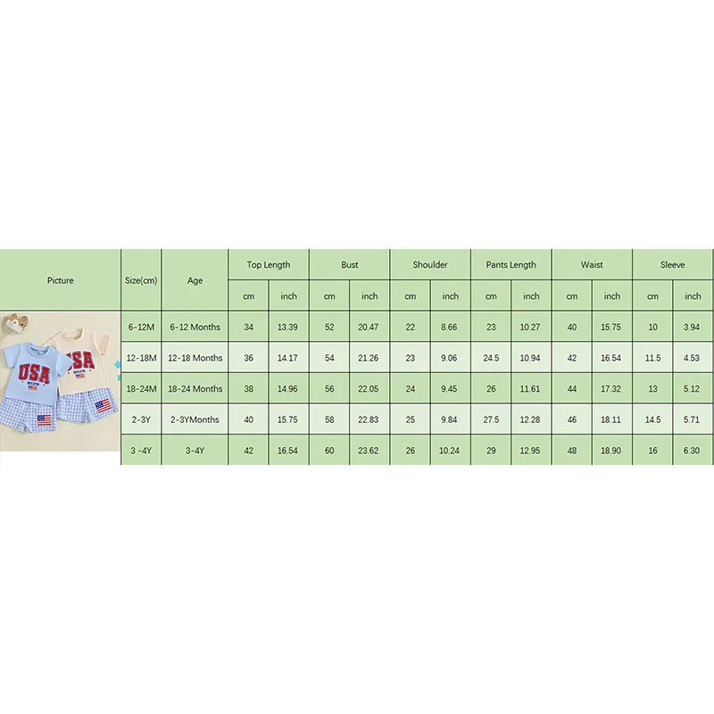 Conjunto patriótico para bebés y niños, camiseta de manga corta con estampado de letras y pantalones cortos elásticos a cuadros, conjunto de ropa de 2 piezasCaracterísticasRopa patriótica de bebé; Linda ropa de bebé niño; Camiseta bebé niño con estampado de letras, cuello redondo, manga corta; Pantalón corto bebé niño con estampado a cuadros y diseño de cintura elástica para garantizar comodidad y ajuste.Adecuado para uso diario, informal, fiesta, hogar, actividades al aire libre, ropa deportiva, ropa de camping de verano.Tamaño (cm)6-12M Longitud de la parte superior: 34 Busto: 52 Manga: 10 Longitud de los pantalones: 23 Cintura: 40 Cadera 60 Hombro: 22 Edad recomendada: 6-12 meses12-18M Longitud de la parte superior: 36 Busto: 54 Manga: 11,5 Longitud de los pantalones: 24,5 Cintura: 42 Cadera 62 Hombro: 23 Edad recomendada: 12-18 meses18-24M Longitud de la parte superior: 38 Busto: 56 Manga: 13 Longitud de los pantalones: 26 Cintura: 44 Cadera 64 Hombro: 24 Edad recomendada: 18-24 meses2-3Y Longitud de la parte superior: 40 Busto: 58 Manga: 14,5 Longitud de los pantalones: 27,5 Cintura: 46 Cadera 66 Hombro: 25 Edad recomendada: 2-3 años3-4Y Longitud de la parte superior: 42 Busto: 60 Manga: 16 Longitud de pantalones: 29 Cintura: 48 Cadera 68 Hombro: 26 Edad recomendada: 3-4 añosTamaño (pulgadas)6-12M Longitud de la parte superior: 13,39 Busto: 20,47 Manga: 3,94 Longitud de los pantalones: 9,06 Cintura: 15,75 Cadera 23,62 Hombro: 8,66 Edad recomendada: 6-12 meses12-18M Longitud de la parte superior: 14,17 Busto: 21.26 Manga: 4,53 Longitud de los pantalones: 9.65 Cintura: 16,54 Cadera 24.41 Hombro: 9,06 Edad recomendada: 12-18 meses18-24M Longitud de la parte superior: 14,96 Busto: 22,05 Manga: 5,12 Longitud de los pantalones: 10,24 Cintura: 17,32 Cadera 25,20 Hombro: 9,45 Edad recomendada: 18-24 meses2-3Y Longitud de la parte superior: 15,75 Busto: 22,83 Manga: 5,71 Longitud de los pantalones: 10,83 Cintura: 18,11 Cadera 25,98 Hombro: 9,84 Edad recomendada: 2-3 años3-4Y Longitud de la parte superior: 16,54 Busto: 23.62 Manga: 6.30 Longitud de los pantalones: 11.42 Cintura: 18,90 Cadera 26.77 Hombro: 10.24 Edad recomendada: 3-4 añosEspecificaciónCondición: 100% nuevoMaterial: Parte superior: 95% Algodón 5% Elastano; Pantalón: 100% PoliésterEstilo: Moda frescaGénero: niñosTemporada: VeranoCantidad: 2 piezasManga: manga cortaPatrón: estampado de letras, estampado de cuadros.Ocasión: DiarioEl paquete incluye:1 * Tops1 * pantalones cortosNota:Puede haber una desviación de 1 a 2 cm en diferentes tamaños, ubicaciones y estiramiento de las telas.La tabla de tallas es solo como referencia; Puede haber una pequeña diferencia con lo que obtienes.El color puede ser más claro o más oscuro debido a las diferentes pantallas de PC.