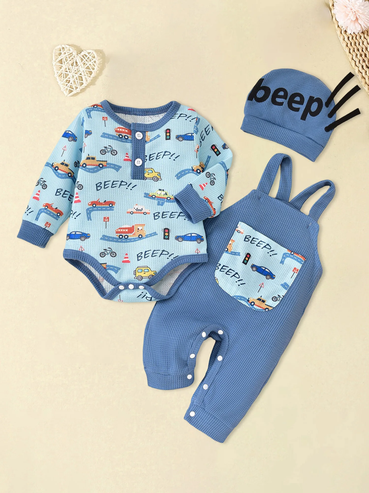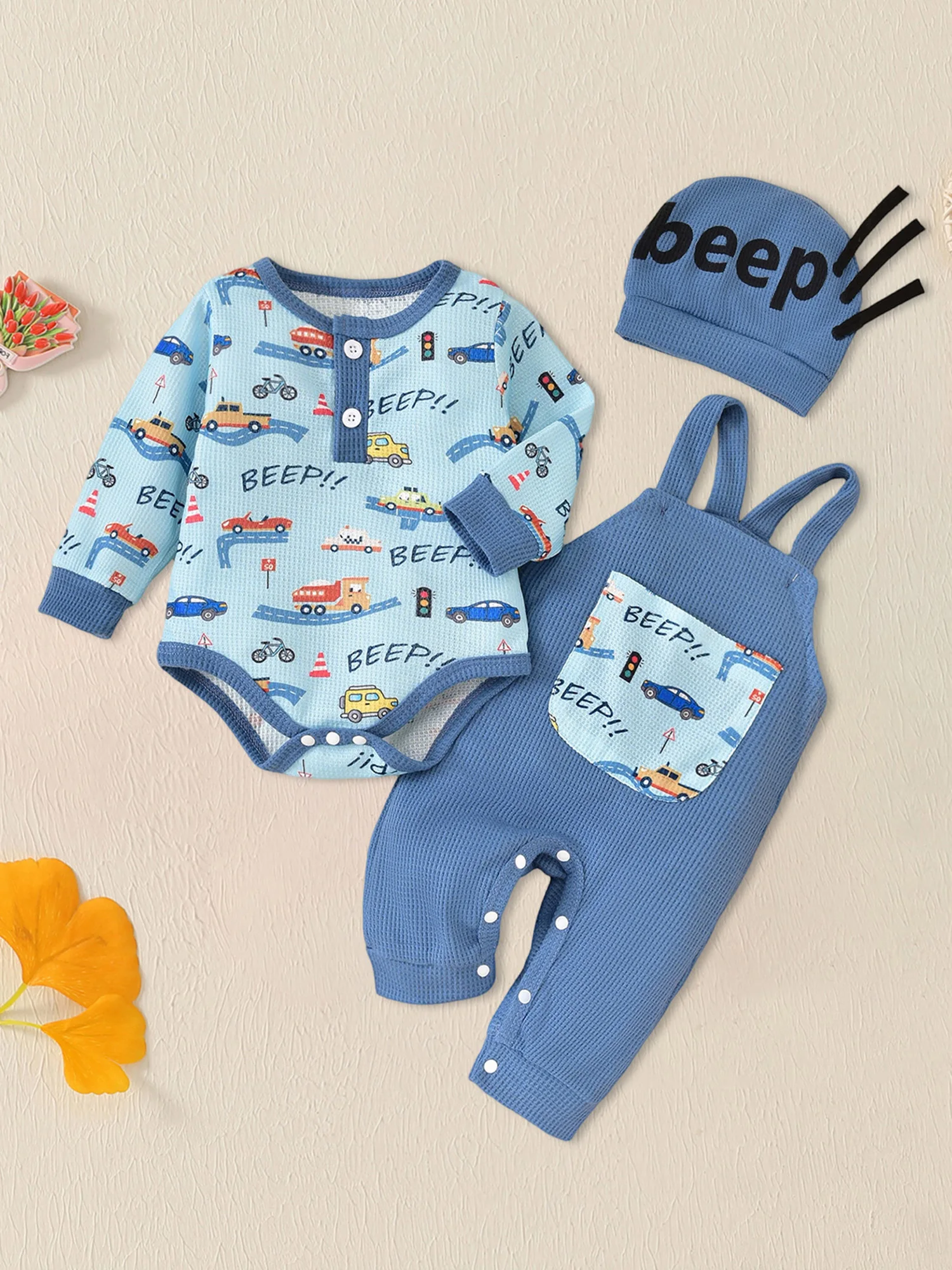 Conjuntos de ropa para bebé, mameluco estampado de coche/corona de manga larga a la moda con mono y sombrero, trajes de otoño de 3 uds.