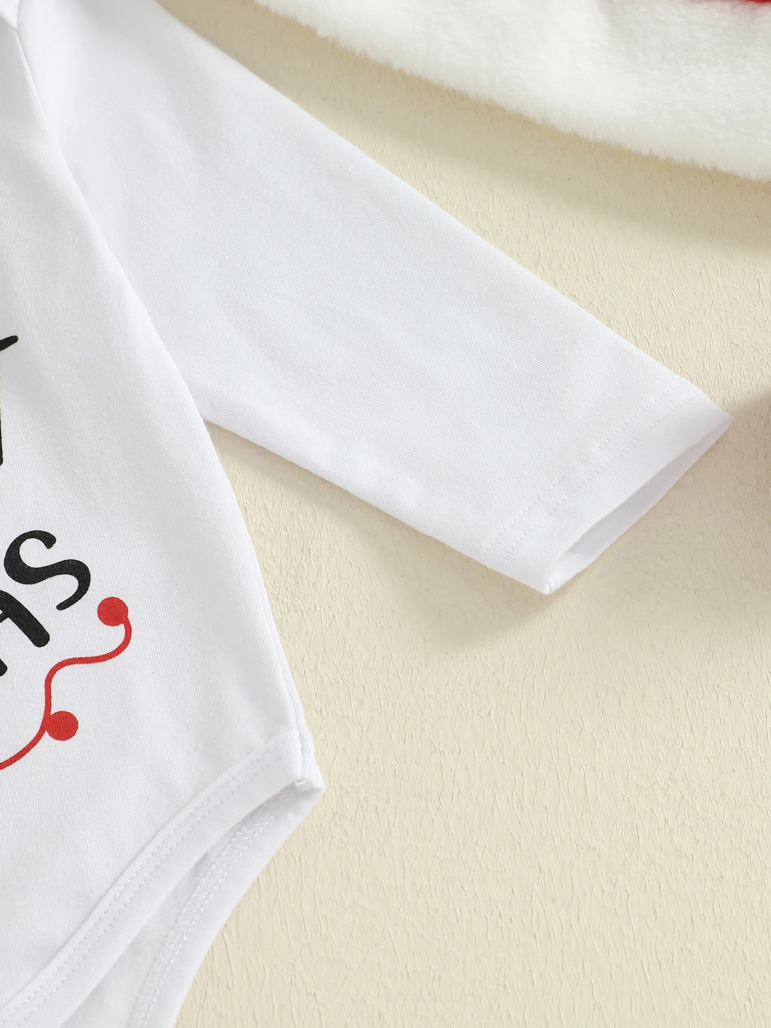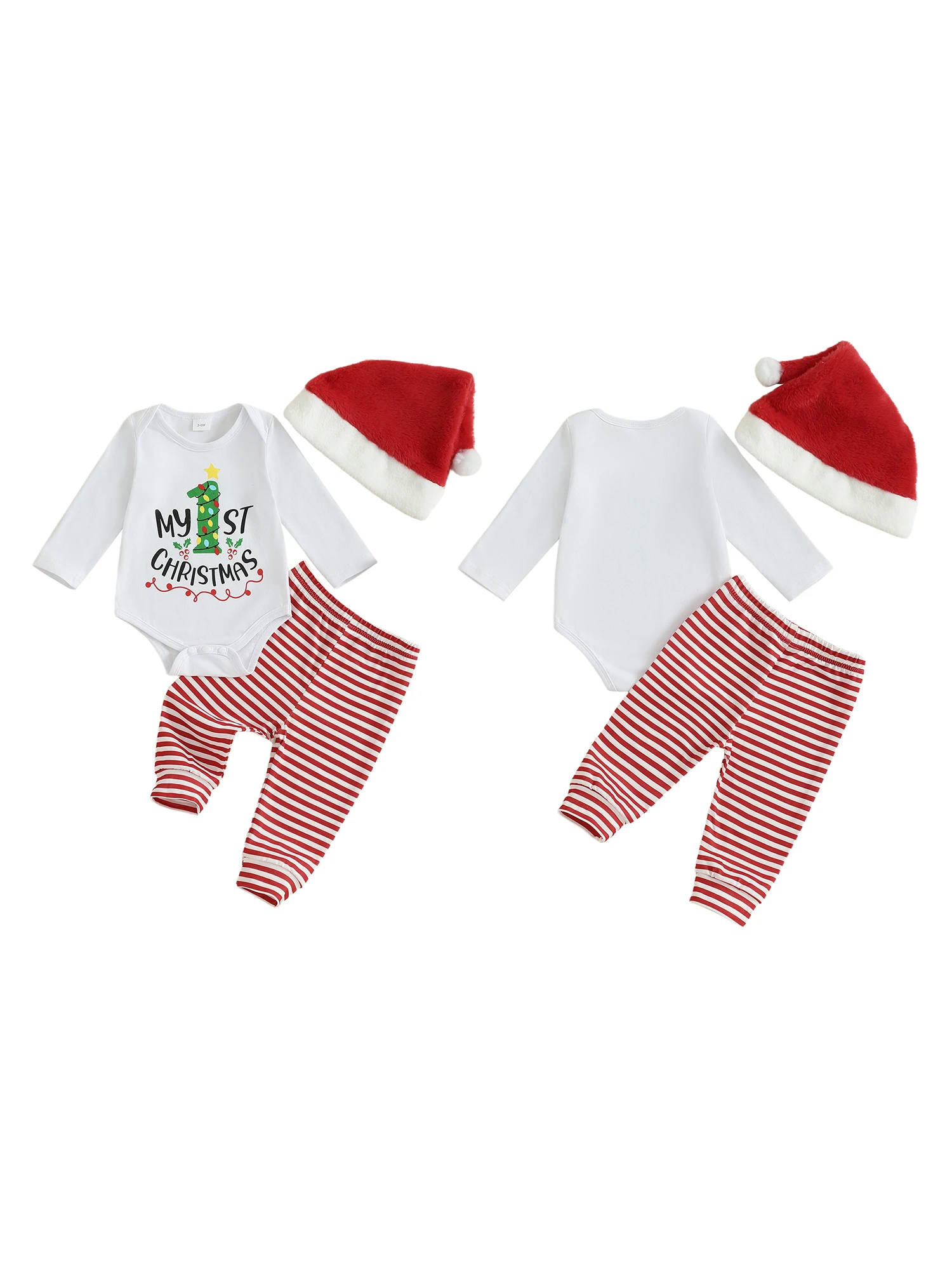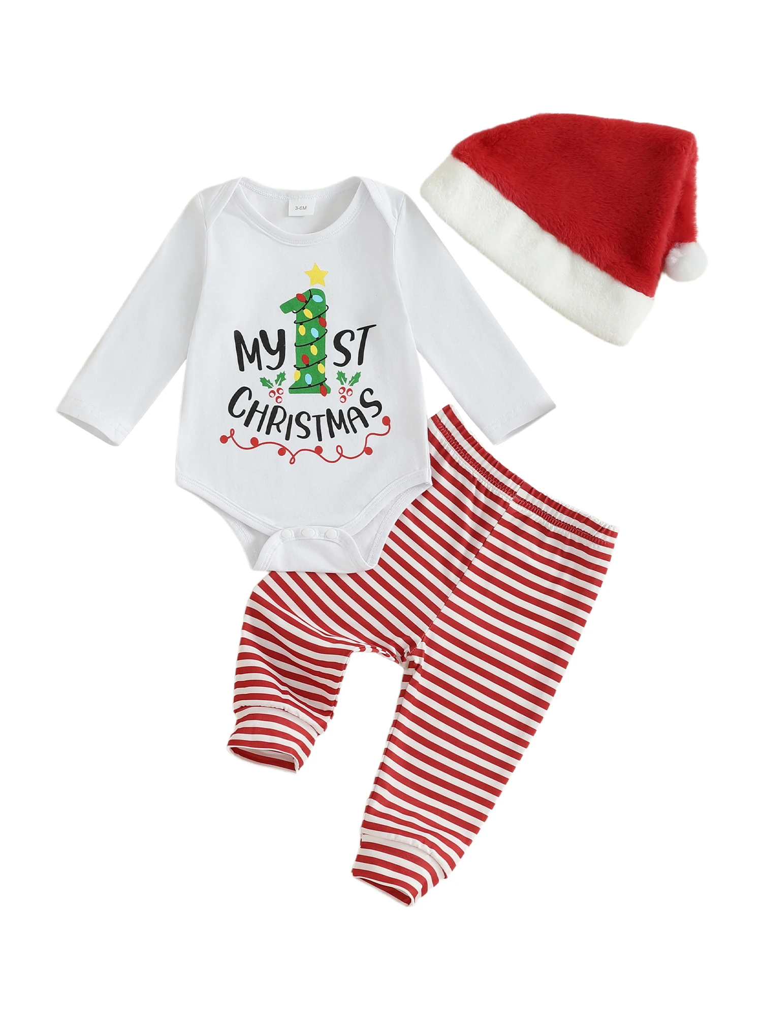 SUNSIOM Conjuntos de trajes navideños para bebés de 0 a 18 meses, mameluco con estampado de letras y cuello redondo de manga larga, pantalones a rayas, conjuntos de sombrero de Papá Noel
