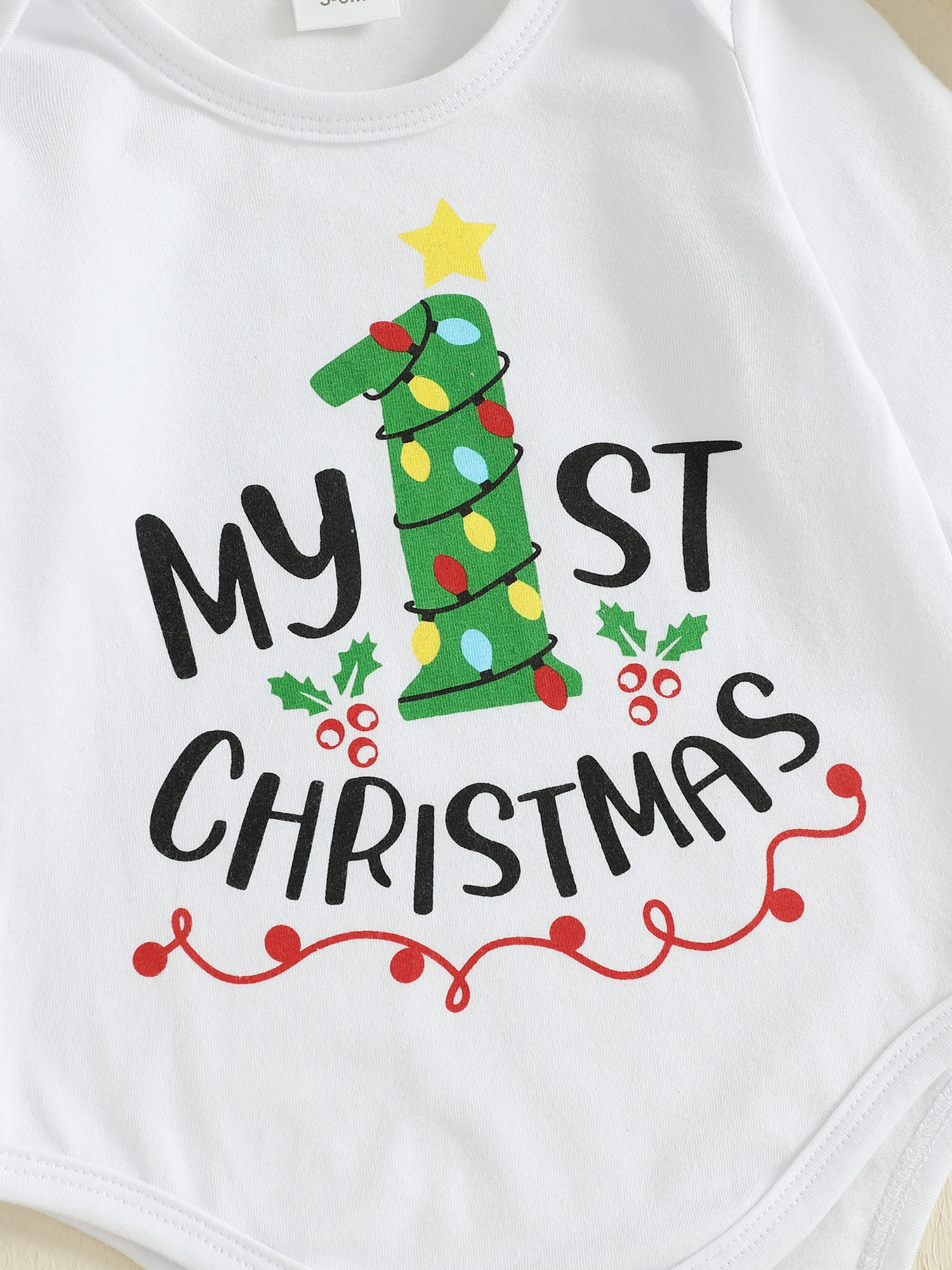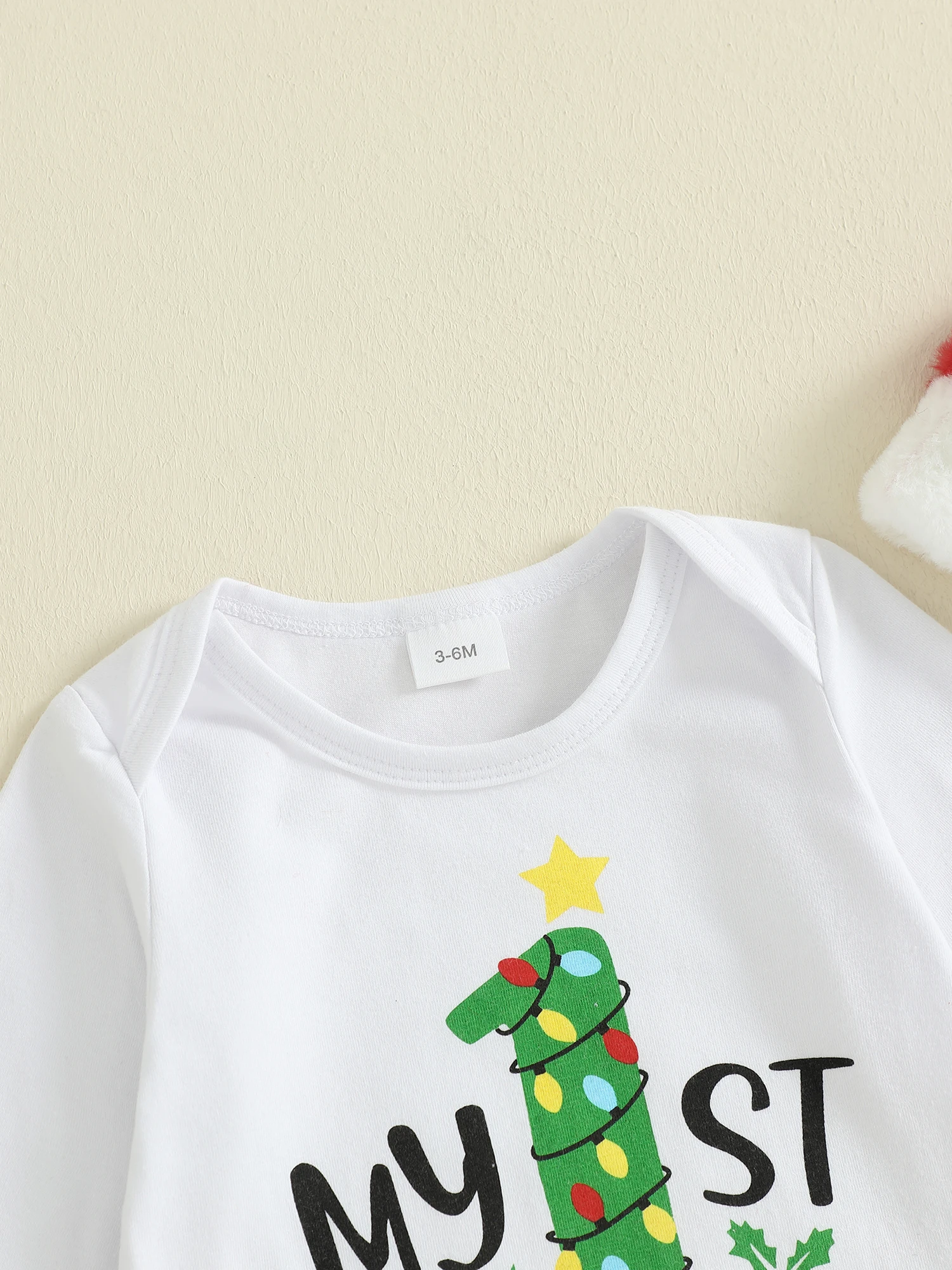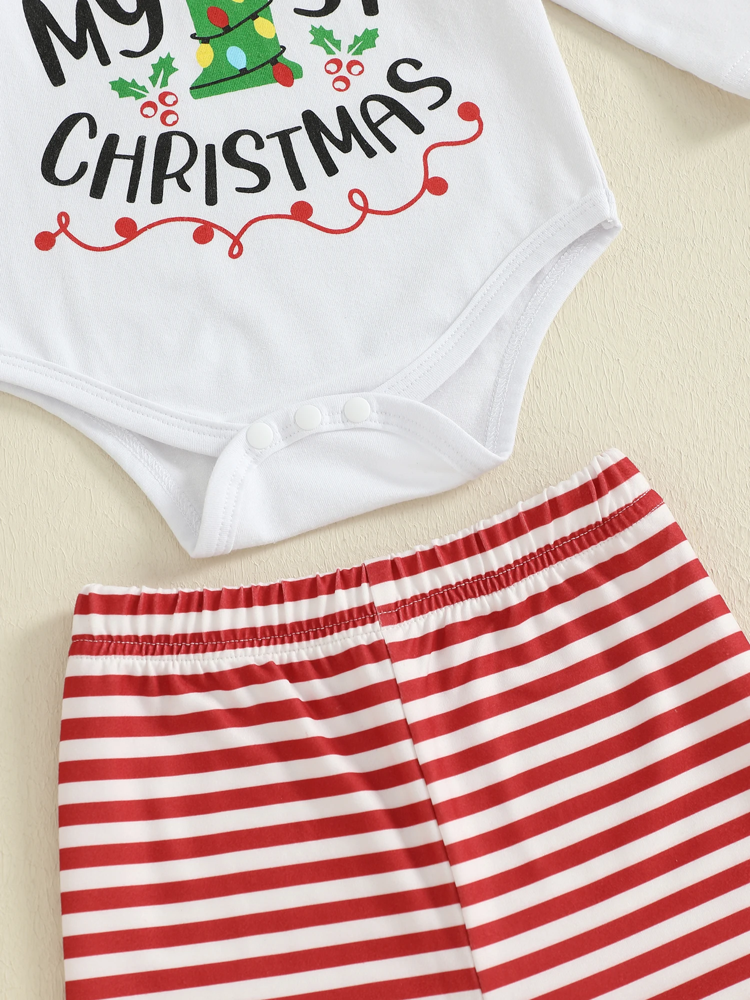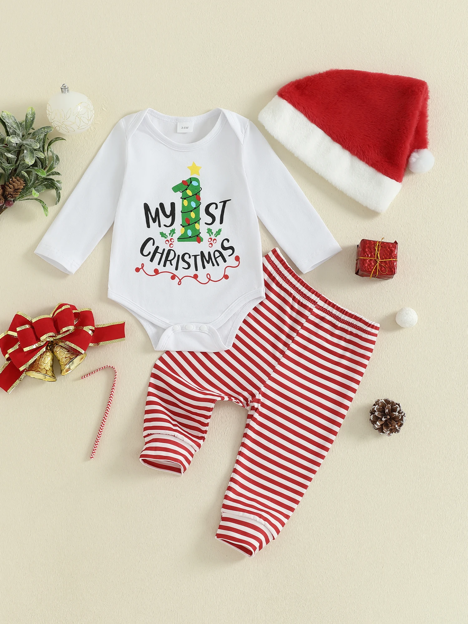 SUNSIOM Conjuntos de trajes navideños para bebés de 0 a 18 meses, mameluco con estampado de letras y cuello redondo de manga larga, pantalones a rayas, conjuntos de sombrero de Papá Noel