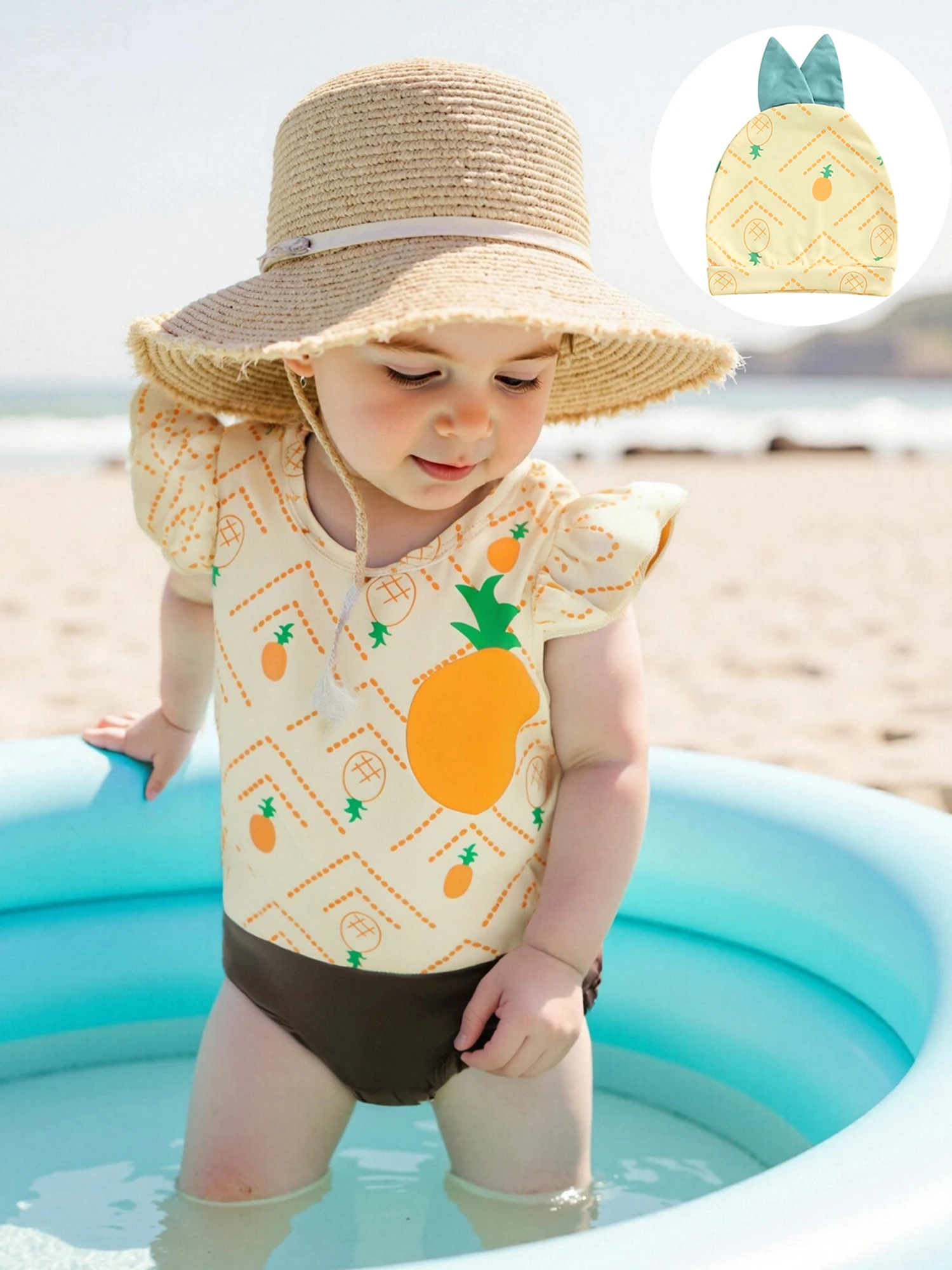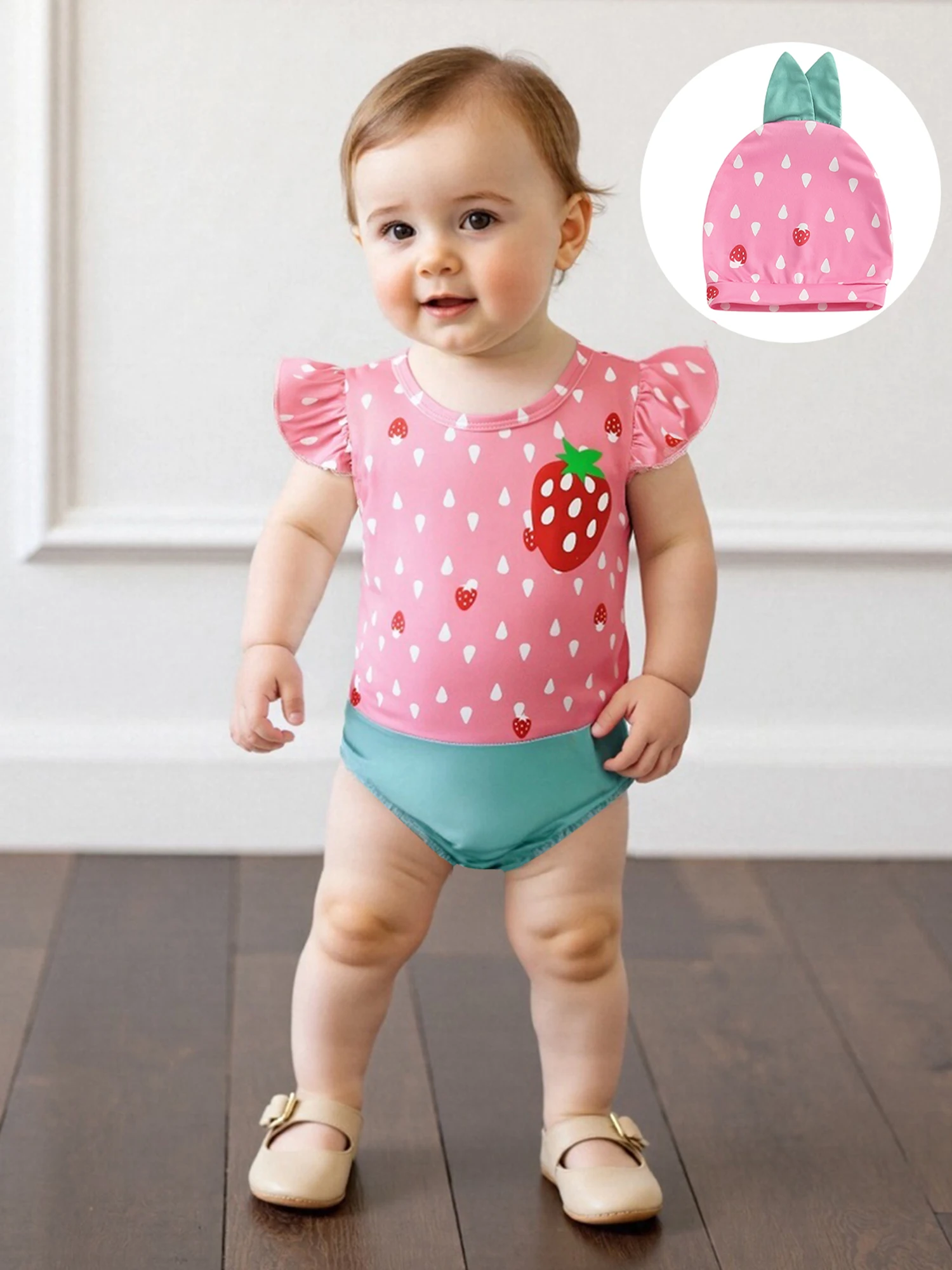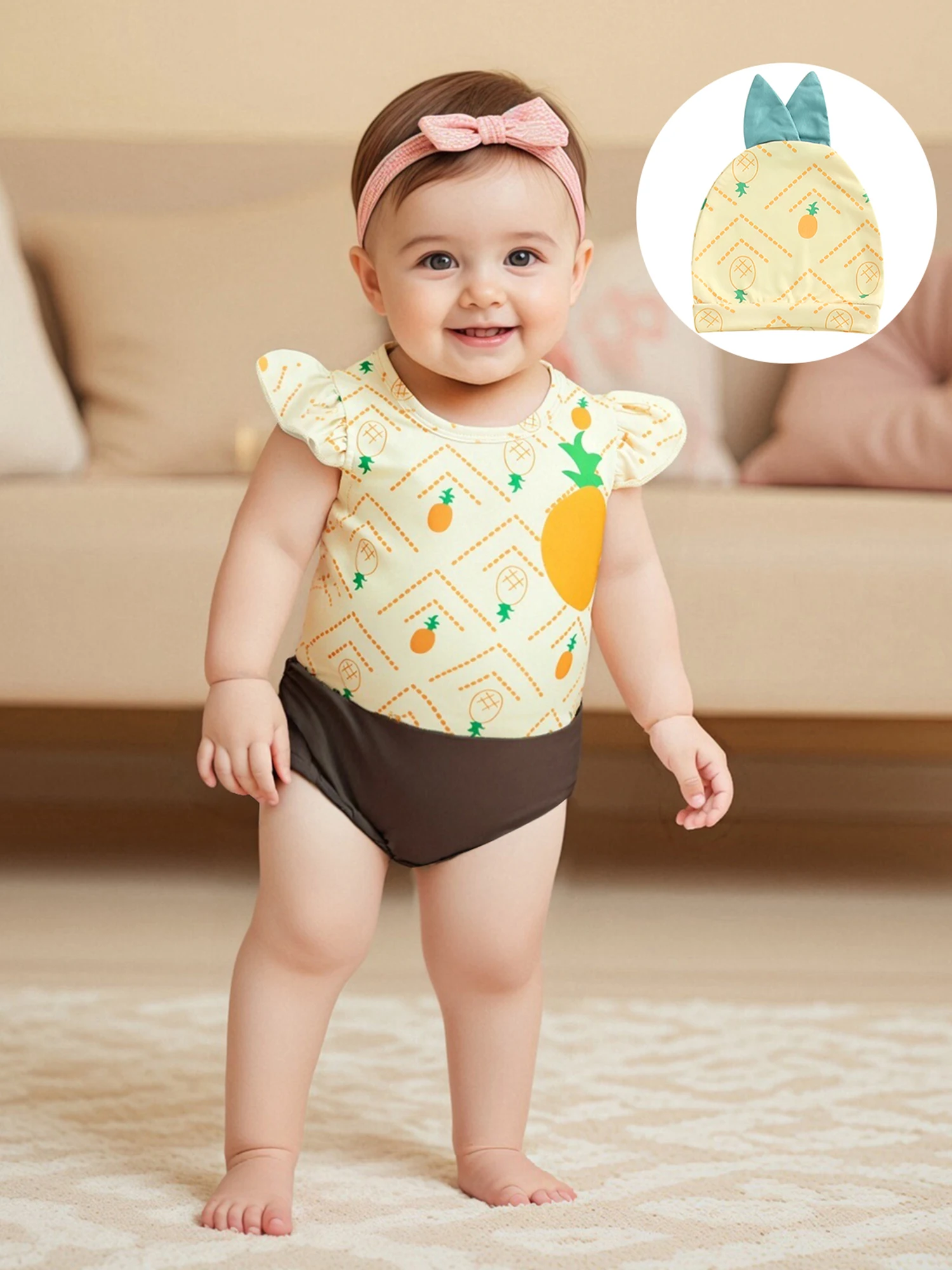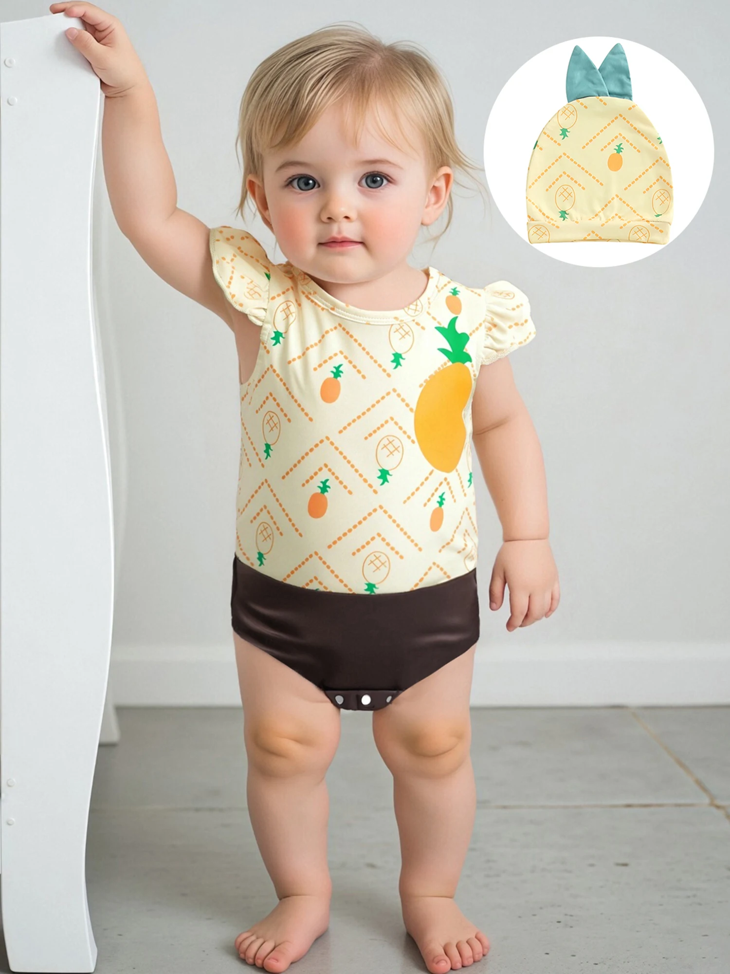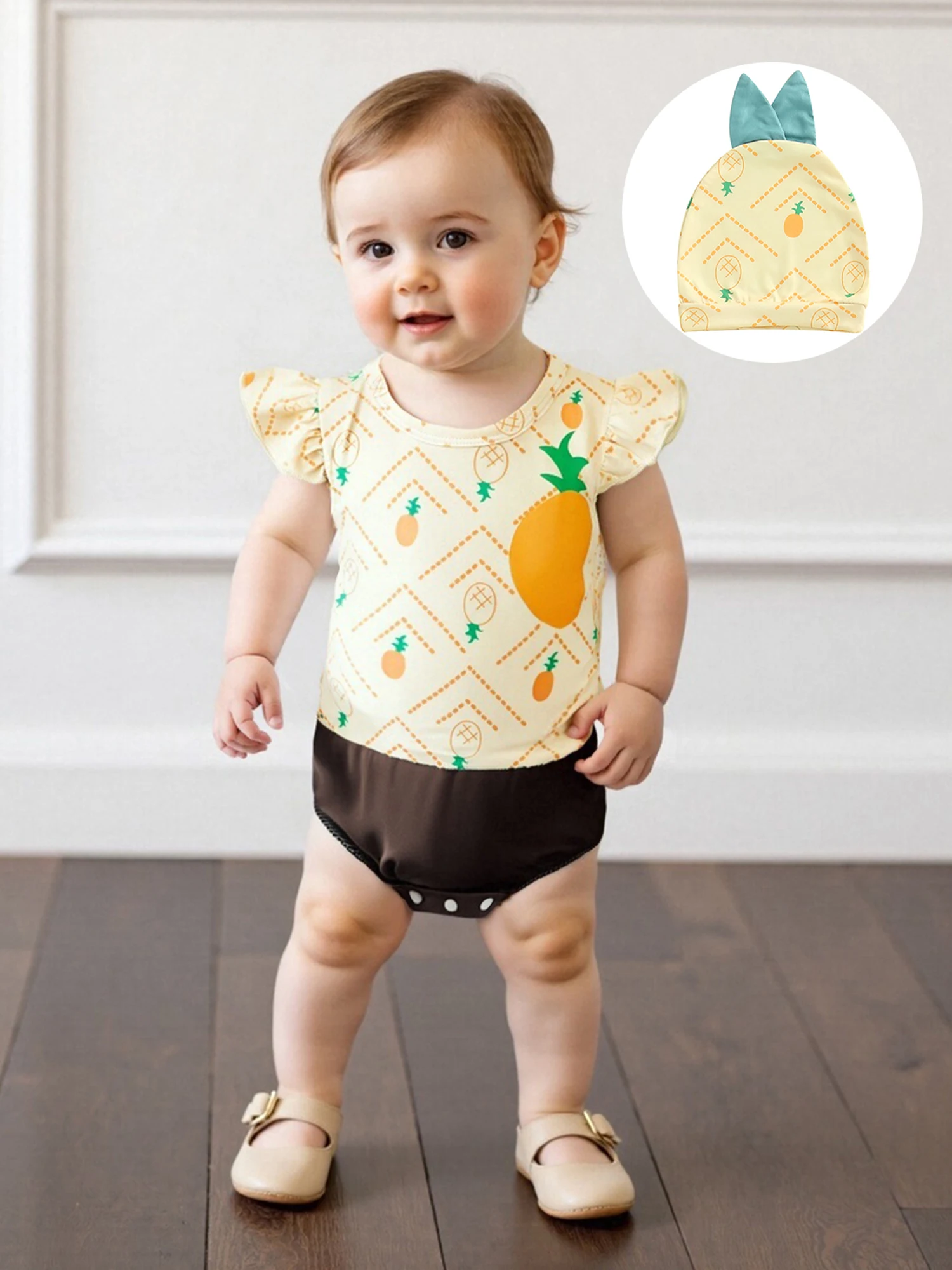 Conjunto de 2 uds de trajes de verano para niña, mameluco con cuello redondo y manga mosca con sombrero, disfraz infantil de fruta