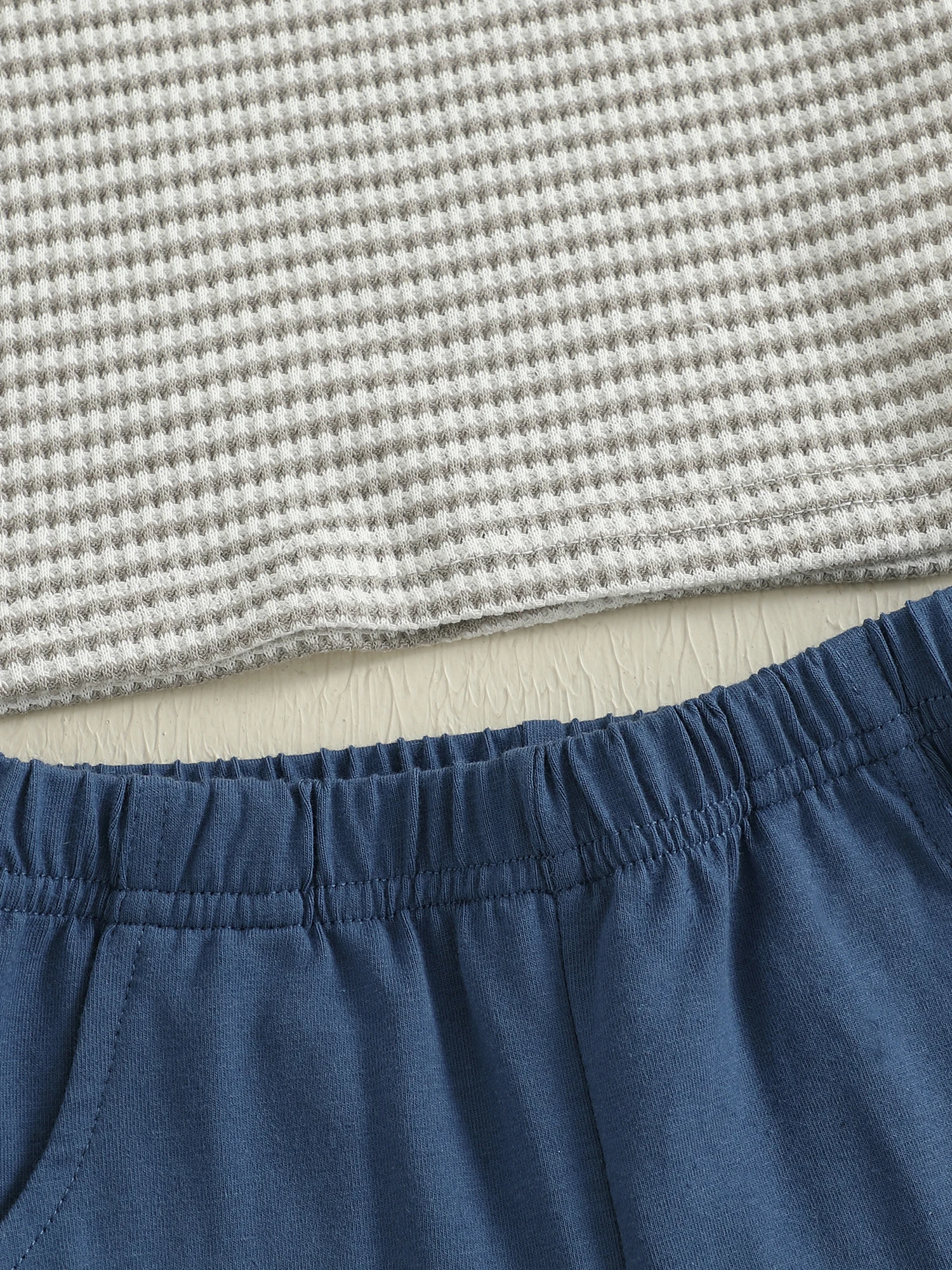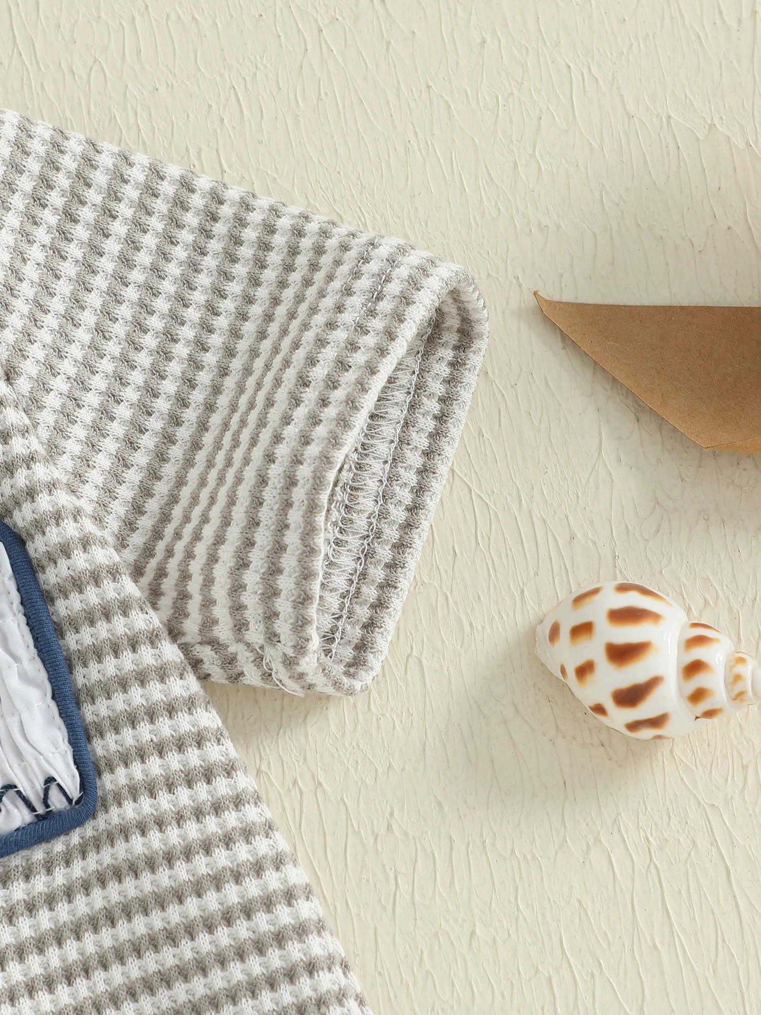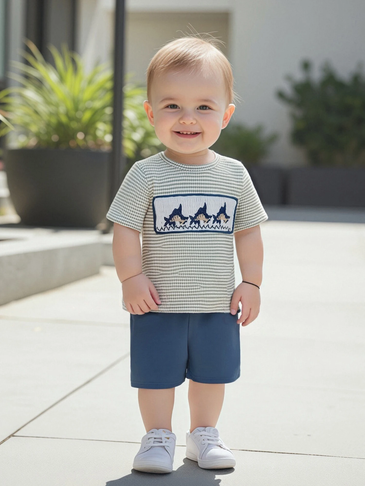 Conjunto de 2 piezas de trajes de verano para niño pequeño con bordado de peces de gofres, camisetas de manga corta con cuello redondo y pantalones cortos sólidos
