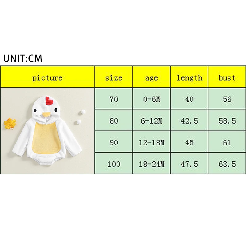 Disfraz de gallo para bebé, mameluco con capucha de manga larga, disfraz de pollo infantil, ropa para recién nacidoCaracterísticas:-La tela súper suave hace que su bebé se sienta súper cómodo.-Perfecto mameluco de primavera para bebés y niños.-- Lavar a máquina/agua fría/colgar seco.Tamaño (cm)70 Longitud: 40 Busto: 56 Edad recomendada: 0-6 meses80 Longitud: 42,5 Busto: 56,5 Edad recomendada: 6-12 meses90 Longitud: 45 Busto: 61 Edad recomendada: 12-18 meses100 Longitud: 47,5 Busto: 63,5 Edad recomendada: 18-24 mesesTamaño (pulgadas)70 Longitud: 15,75 Busto: 22,05 Edad recomendada: 0-6 meses80 Longitud: 16,73 Busto: 22,24 Edad recomendada: 6-12 meses90 Longitud: 17,72 Busto: 24,02 Edad recomendada: 12-18 meses100 Longitud: 18,7 Busto: 25 Edad recomendada: 18-24 mesesEspecificación:Material: 100% poliésterColor: BlancoEstilo: Casual, dulceGénero aplicable: Niños, NiñasTemporadas adecuadas: otoño, primavera, InviernoPaquete incluido1 mamelucoPromesaSi el producto tiene algún problema de calidad, no dude en contactarnos, le ayudaremos a resolver el problema lo más rápido posible.