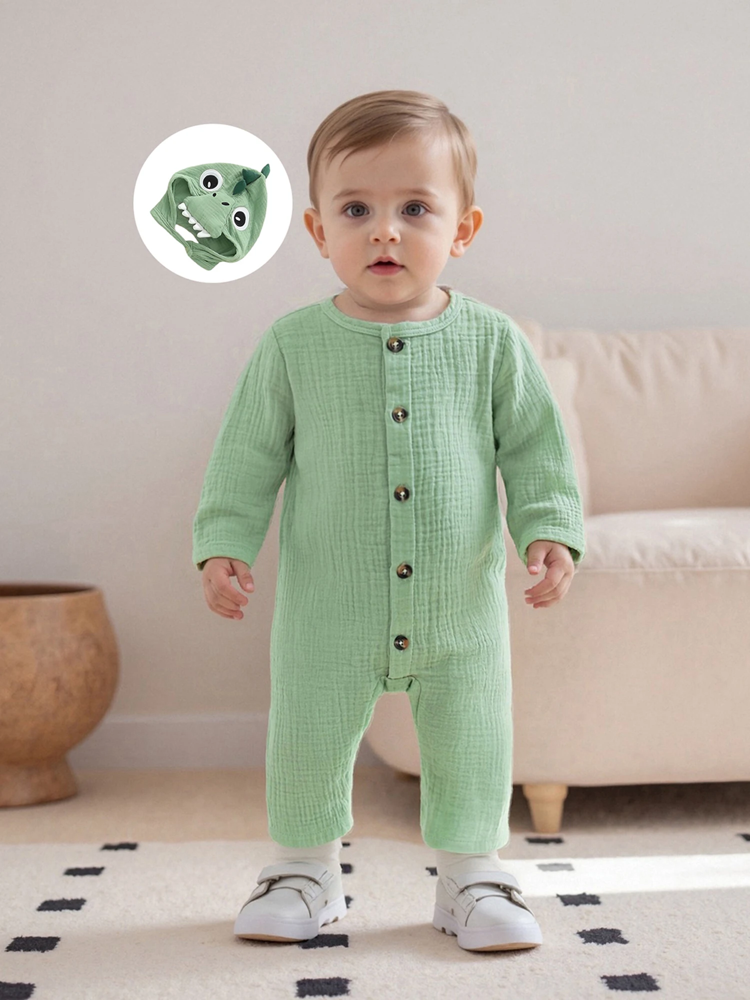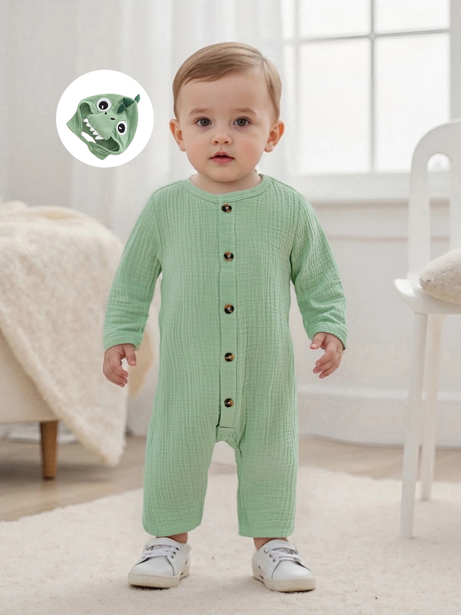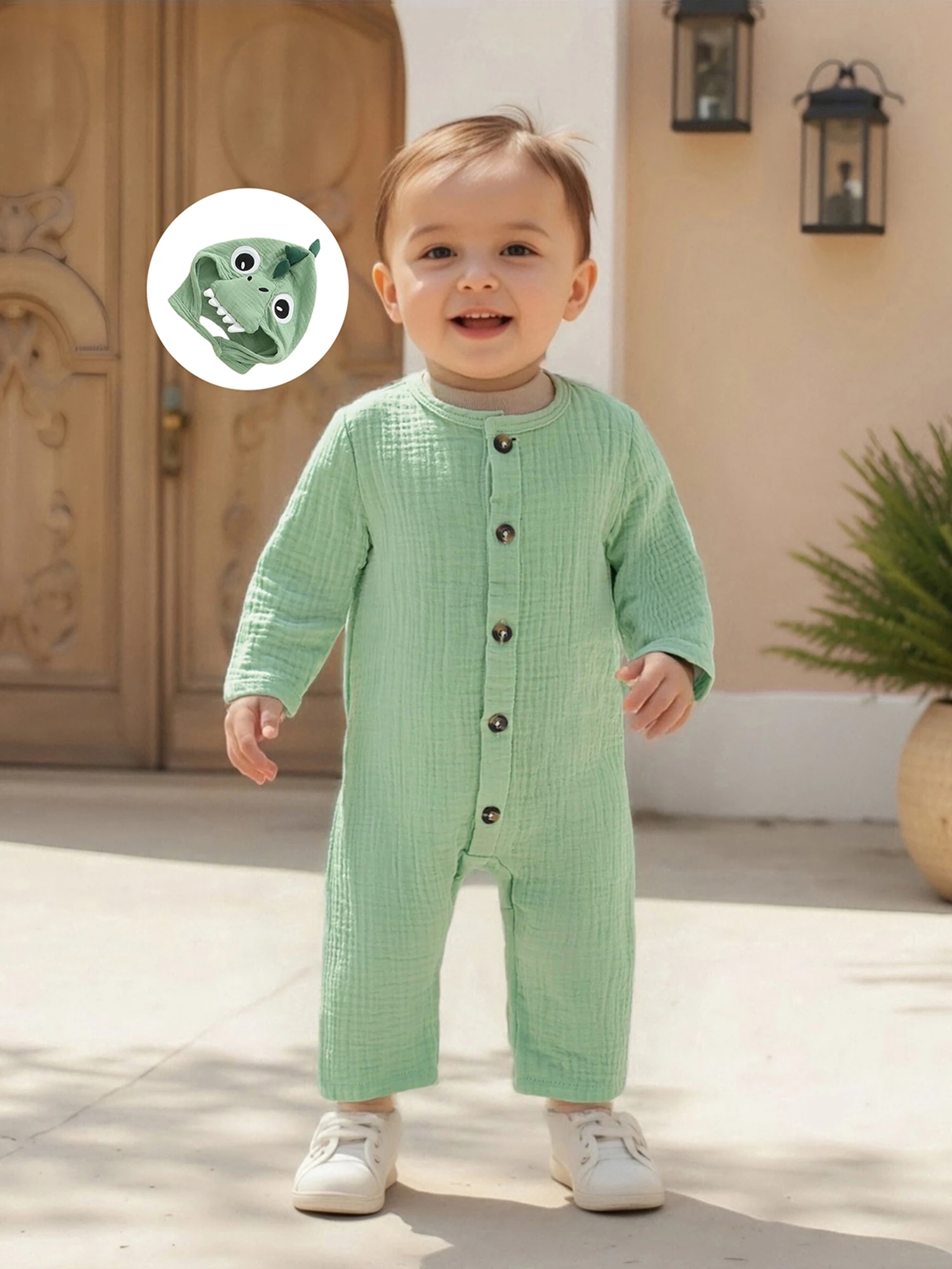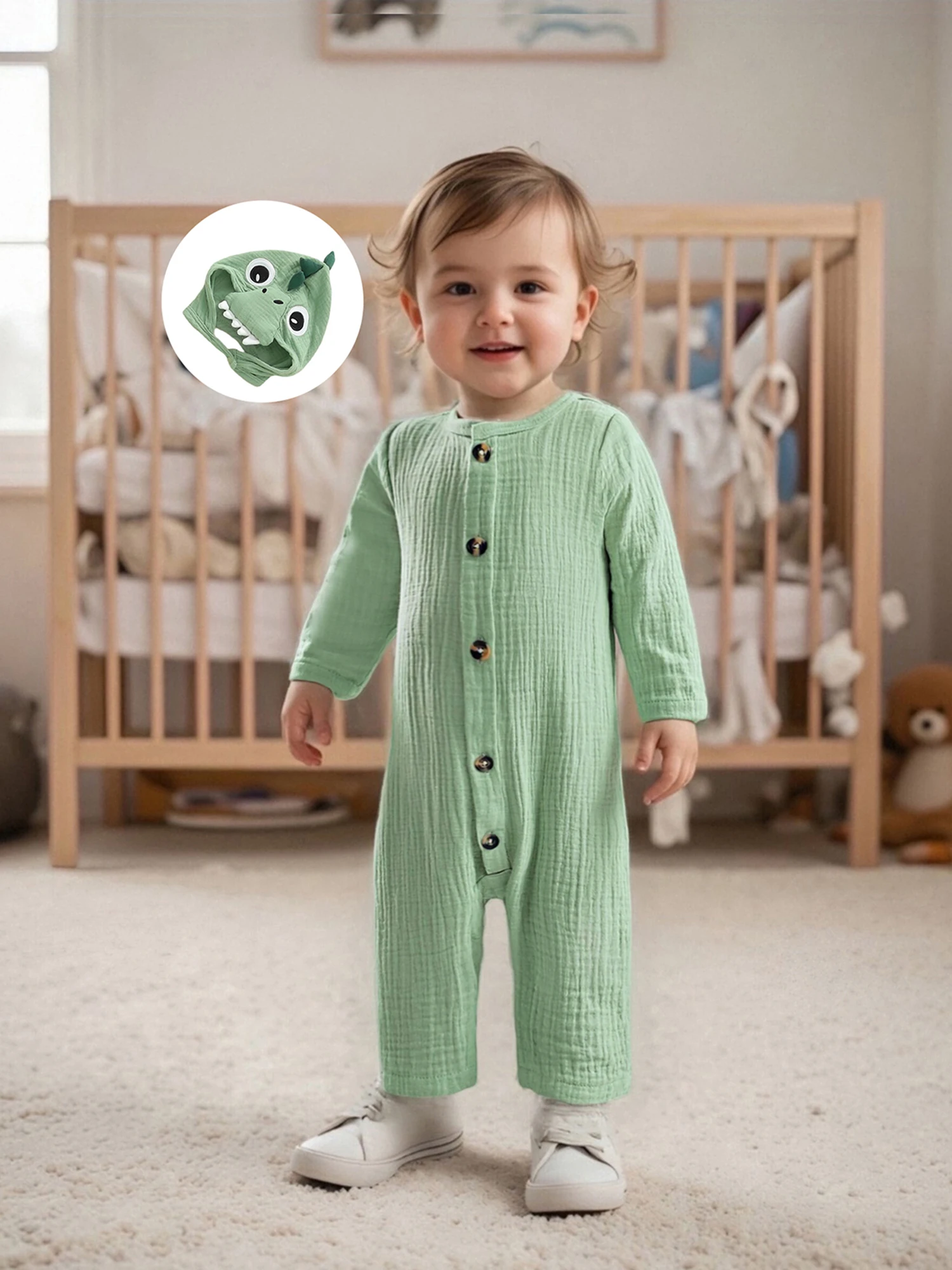 Bebé recién nacido niño niña mameluco dinosaurio temático cuello redondo manga larga abotonado mono de longitud completa con sombrero