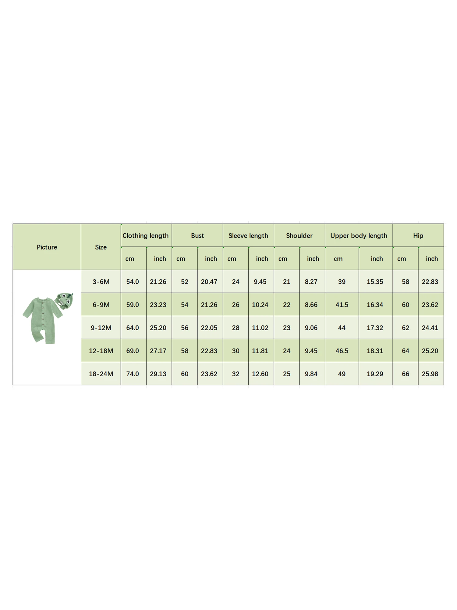 Tamaño (cm) 3-6M Longitud de la ropa: 54 Busto: 52 Manga: 24 Hombro: 21 Longitud de la parte superior del cuerpo: 39 Cadera: 58 Edad recomendada: 3-6 meses 6-9M Longitud de la ropa: 59 Busto: 54 Manga: 26 Hombro: 22 Longitud de la parte superior del cuerpo: 41,5 Cadera: 60 Edad recomendada: 6-9 meses 9-12M Longitud de la ropa: 64 Busto: 56 Manga: 28 Hombro: 23 Longitud de la parte superior del cuerpo: 44 Cadera: 62 Edad recomendada: 9-12 meses 12-18M Longitud de la ropa: 69 Busto: 58 Manga: 30 Hombro: 24 Longitud de la parte superior del cuerpo: 46,5 Cadera: 64 Edad recomendada: 12-18 meses 18-24M Longitud de la ropa: 74 Busto: 60 Manga: 32 Hombro: 25 Longitud de la parte superior del cuerpo: 49 Cadera: 66 Edad recomendada: 18-24 meses Tamaño (pulgadas) 3-6M Longitud de la ropa: 21.26 Busto: 20,47 Manga: 9,45 Hombro: 8,27 Longitud de la parte superior del cuerpo: 15,35 Cadera: 22,83 Edad recomendada: 3-6 meses 6-9M Longitud de la ropa: 23,23 Busto: 21.26 Manga: 10,24 Hombro: 8,66 Longitud de la parte superior del cuerpo: 16.34 Cadera: 23,62 Edad recomendada: 6-9 meses 9-12M Longitud de la ropa: 25,20 Busto: 22,05 Manga: 11,02 Hombro: 9,06 Longitud de la parte superior del cuerpo: 17,32 Cadera: 24,41 Edad recomendada: 9-12 meses 12-18M Longitud de la ropa: 27,17 Busto: 22,83 Manga: 11,81 Hombro: 9,45 Longitud de la parte superior del cuerpo: 18,31 Cadera: 25,20 Edad recomendada: 12-18 meses 18-24M Longitud de la ropa: 29.13 Busto: 23.62 Manga: 12.60 Hombro: 9,84 Longitud de la parte superior del cuerpo: 19.29 Cadera: 25,98 Edad recomendada: 18-24 meses