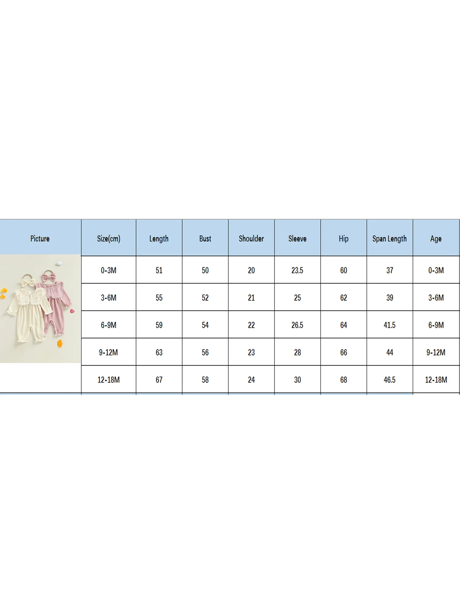 Tamaño (cm) 0-3M Longitud: 51 Busto: 50 Hombro: 20 Manga: 23,5 Longitud de la extensión: 37 Cadera: 60 Edad recomendada: 0-3 meses 3-6M Longitud: 55 Busto: 52 Hombro: 21 Manga: 25 Longitud de la extensión: 39 Cadera: 62 Edad recomendada: 3-6 meses 6-9M Longitud: 59 Busto: 54 Hombro: 22 Manga: 26,5 Longitud de la extensión: 41,5 Cadera: 64 Edad recomendada: 6-9 meses 9-12M Longitud: 63 Busto: 56 Hombro: 23 Manga: 28 Longitud de la extensión: 44 Cadera: 66 Edad recomendada: 9-12 meses 12-18M Longitud: 67 Busto: 58 Hombro: 24 Manga: 30 Longitud de la extensión: 46.5 Cadera: 68 Edad recomendada: 12-18 meses