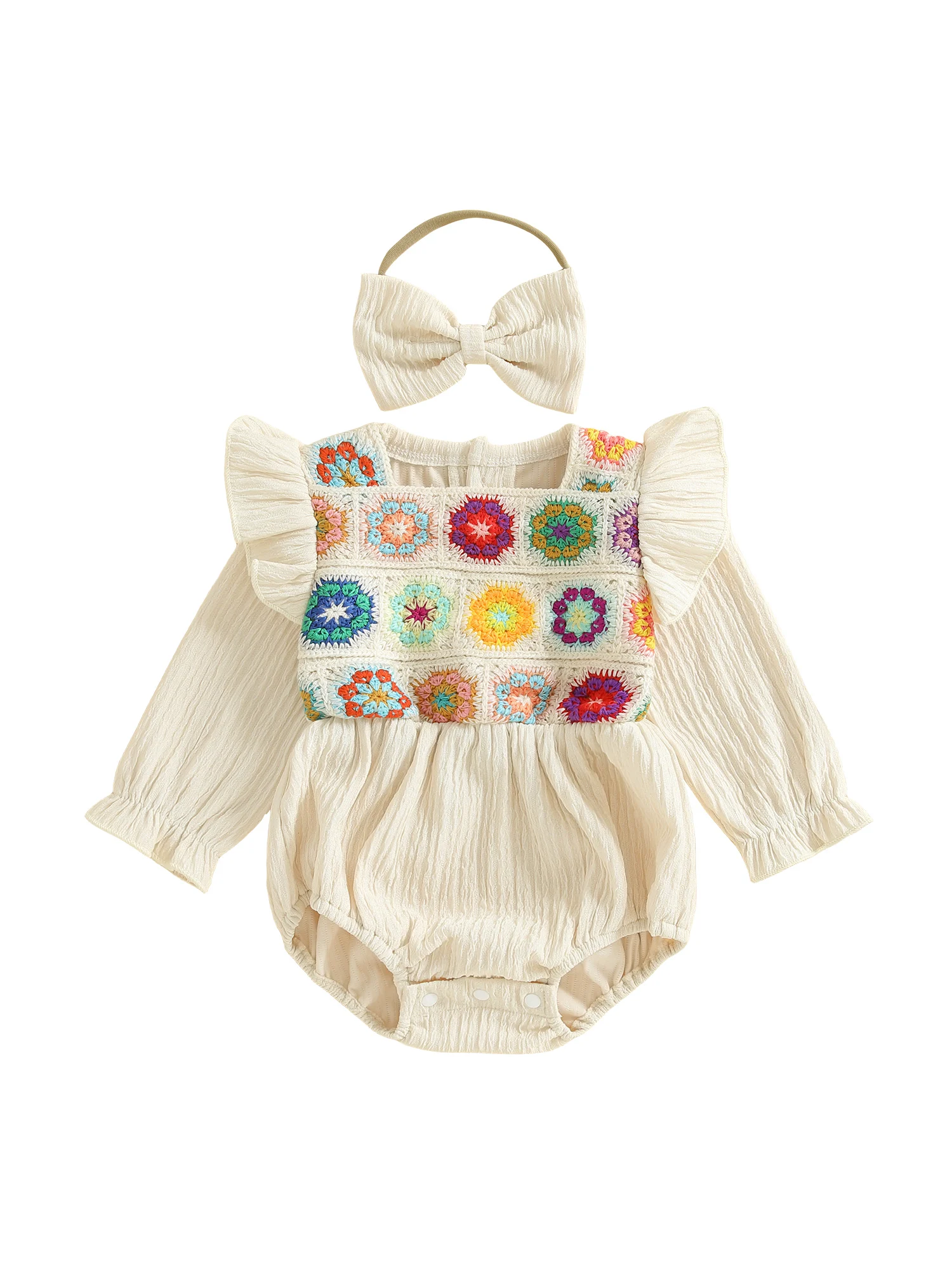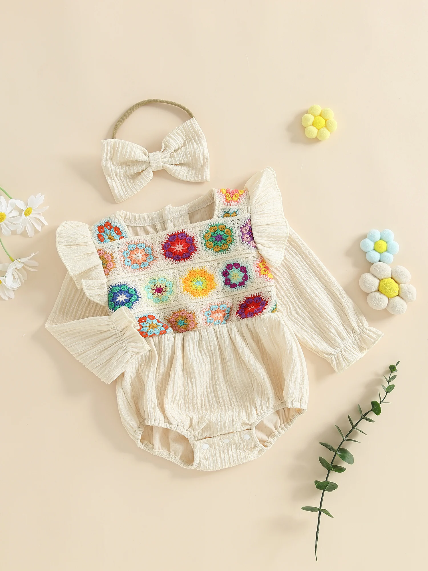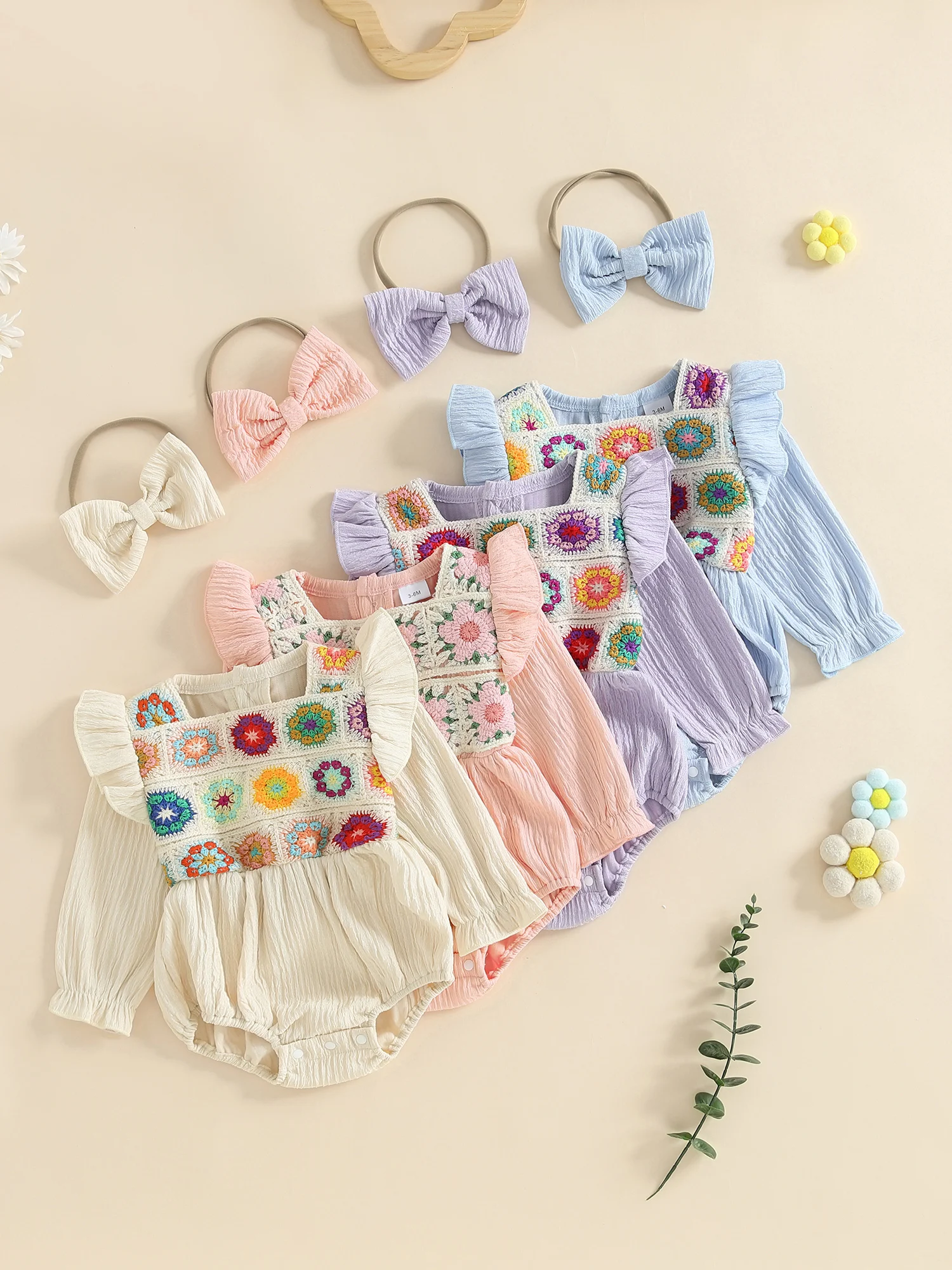 Mameluco floral de ganchillo para niñas, monos de manga larga con volantes y linda diadema para trajes infantiles