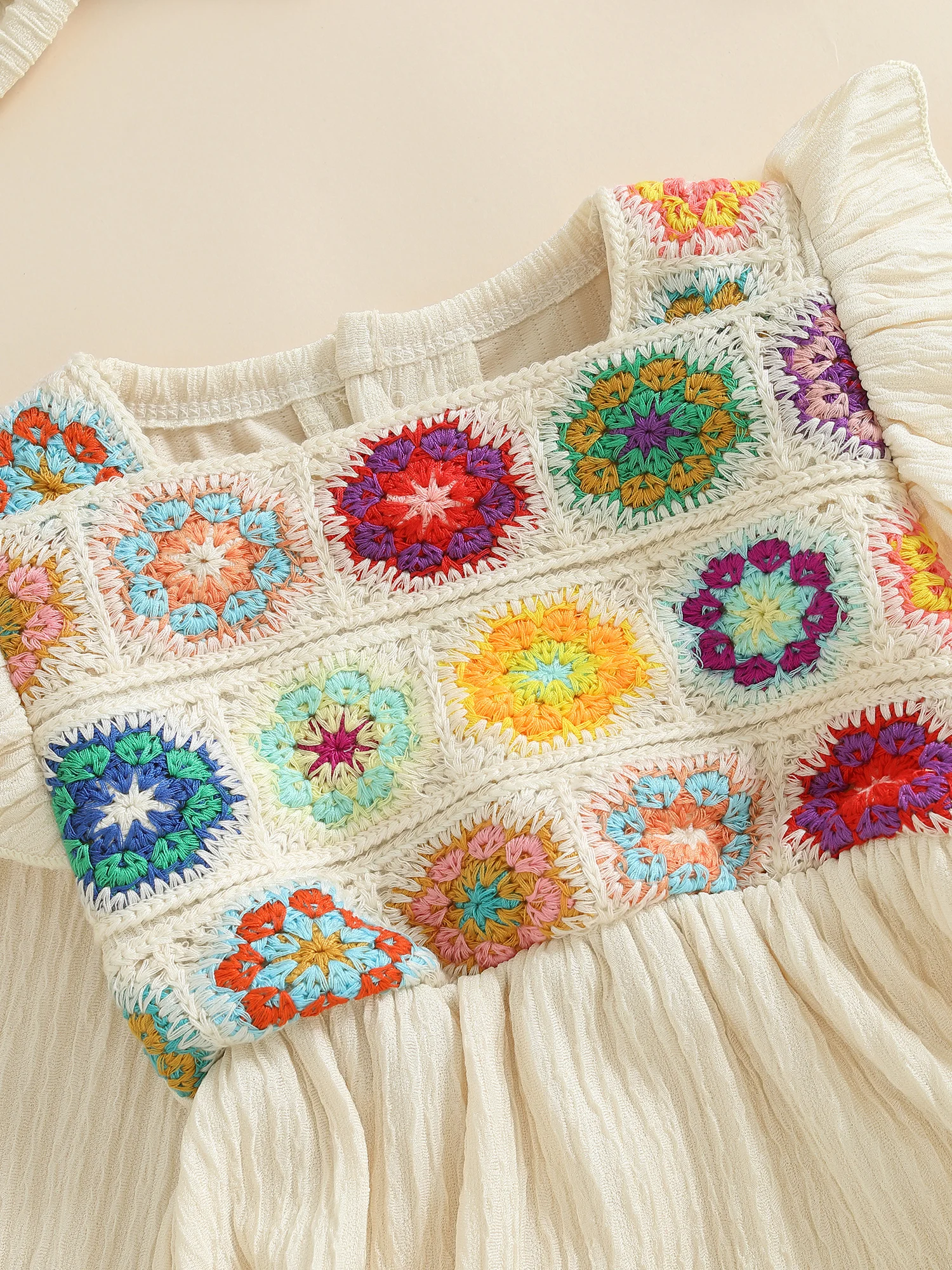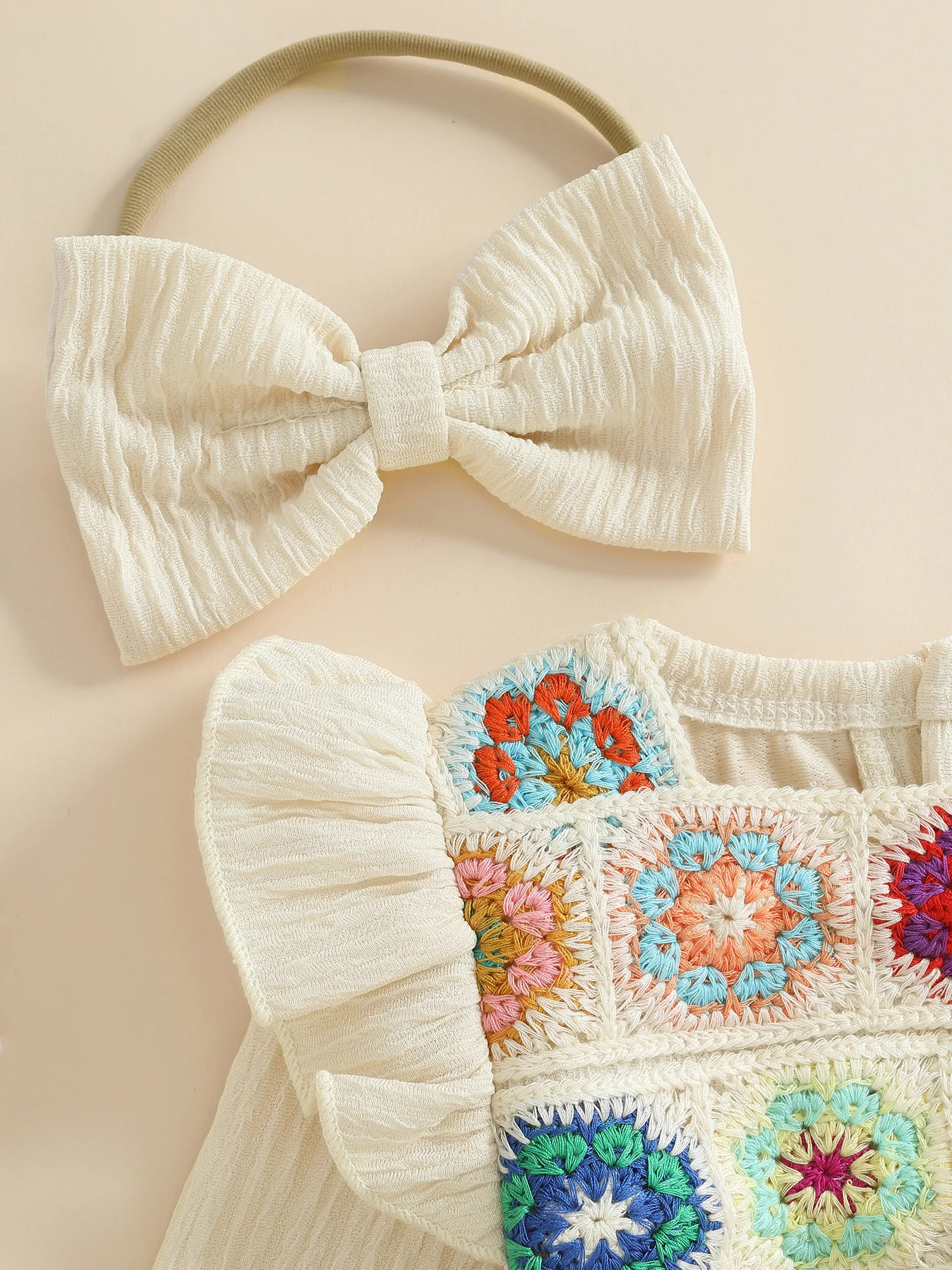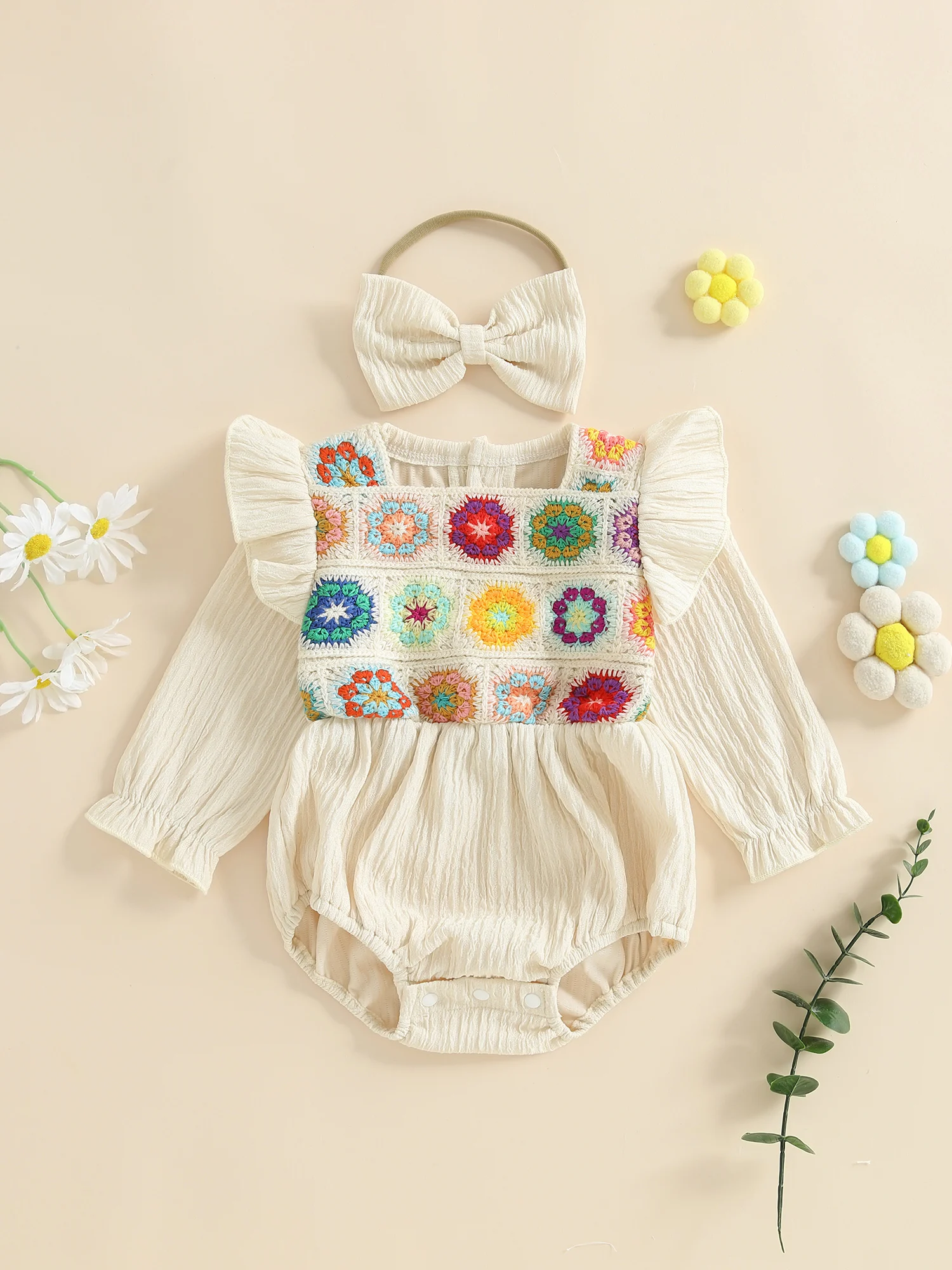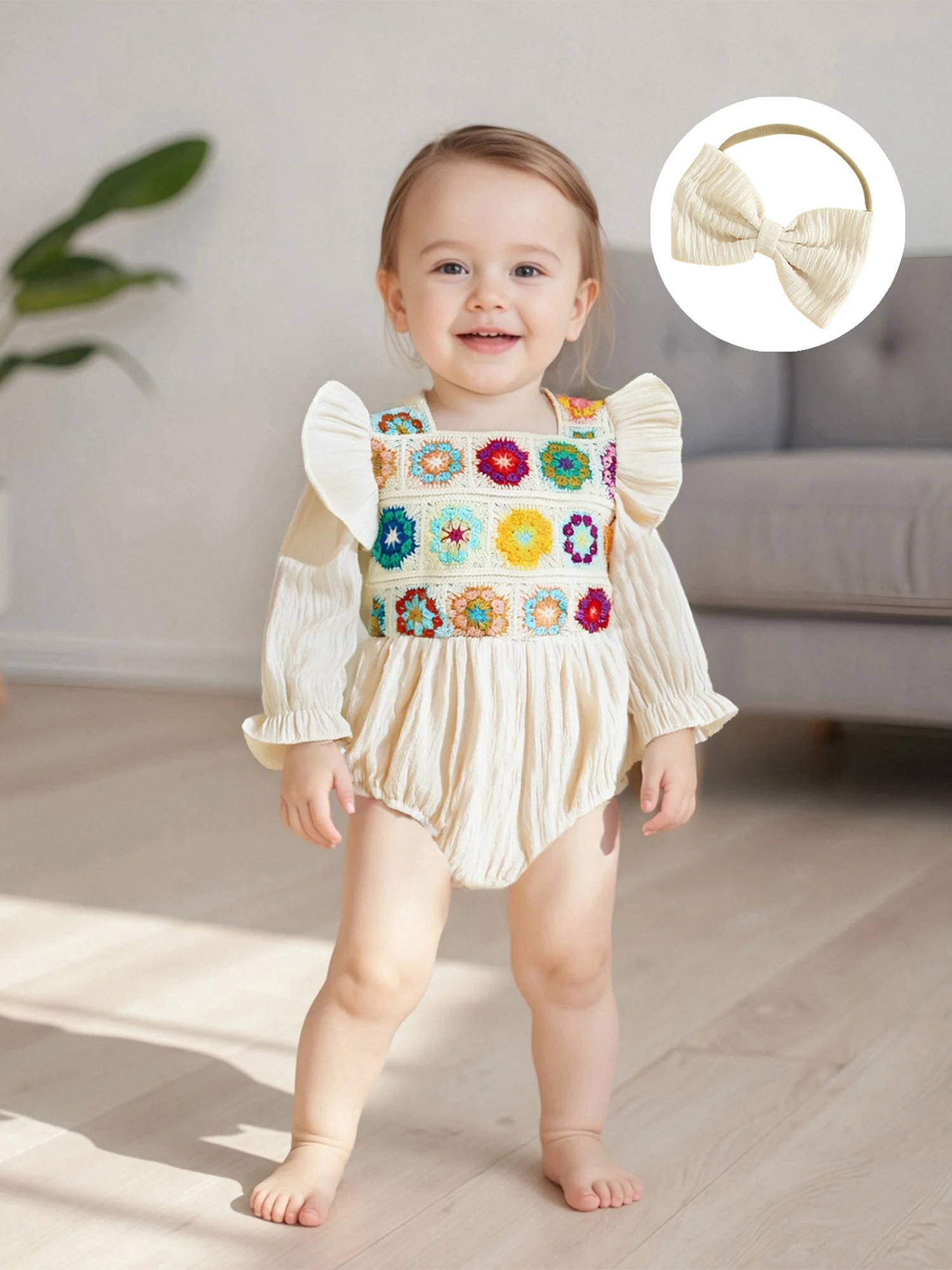 Mameluco floral de ganchillo para niñas, monos de manga larga con volantes y linda diadema para trajes infantiles