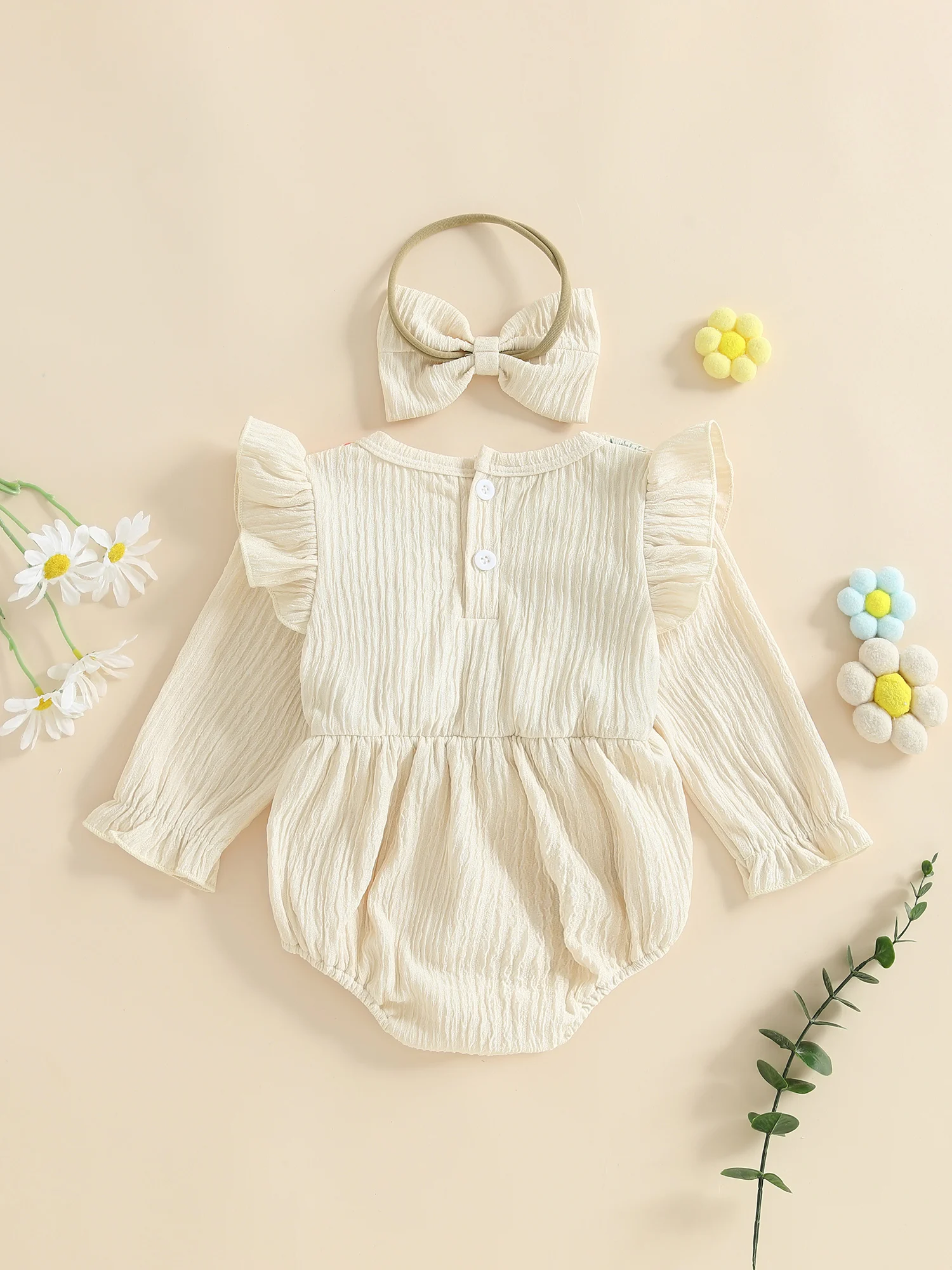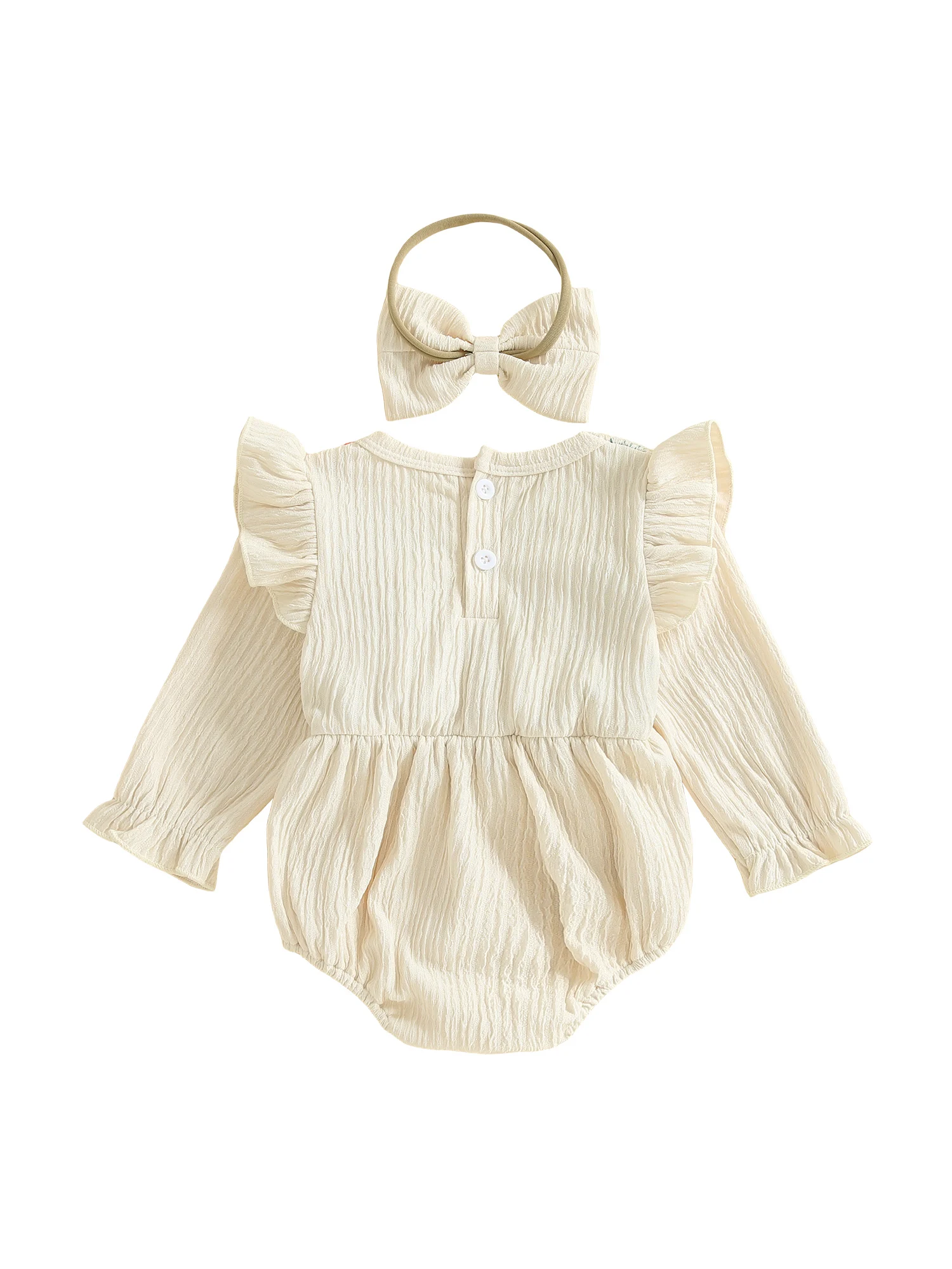Características Mameluco de manga larga para niños pequeños con estampado floral de crochet, escote cuadrado, mangas largas con volantes, cierre a presión en la entrepierna; Y lindo conjunto de diadema, simple pero a la moda, hace que tu bebé sea más adorable. Adecuado para uso diario casual, juegos al aire libre, bodas, vacaciones, fiestas de cumpleaños, reuniones familiares, fotografía.
