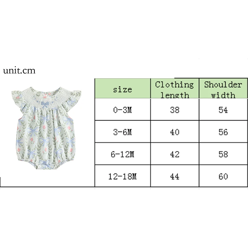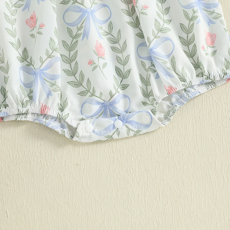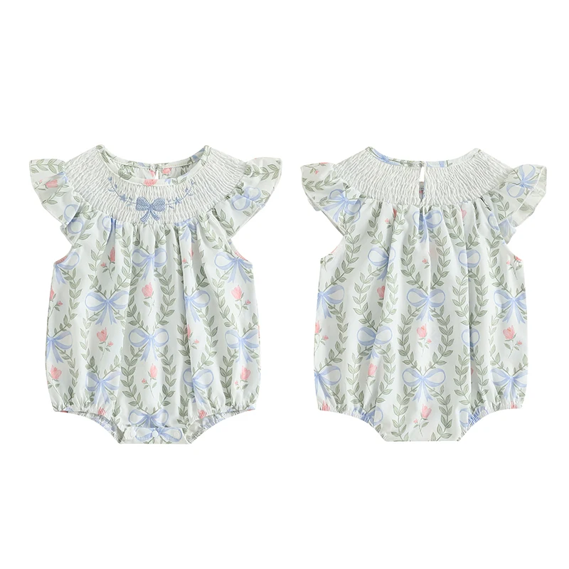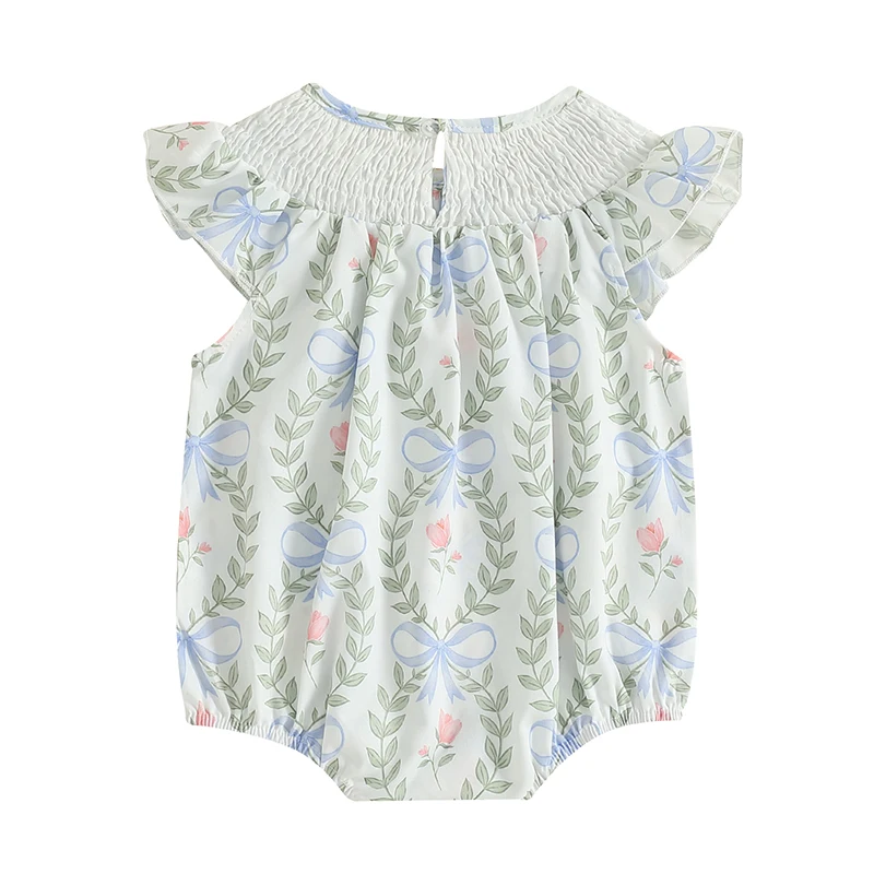 Mameluco para niñas, manga de mosca, cuello redondo, lazo, estampado de hojas, mono infantil, ropa de verano para uso diario informal