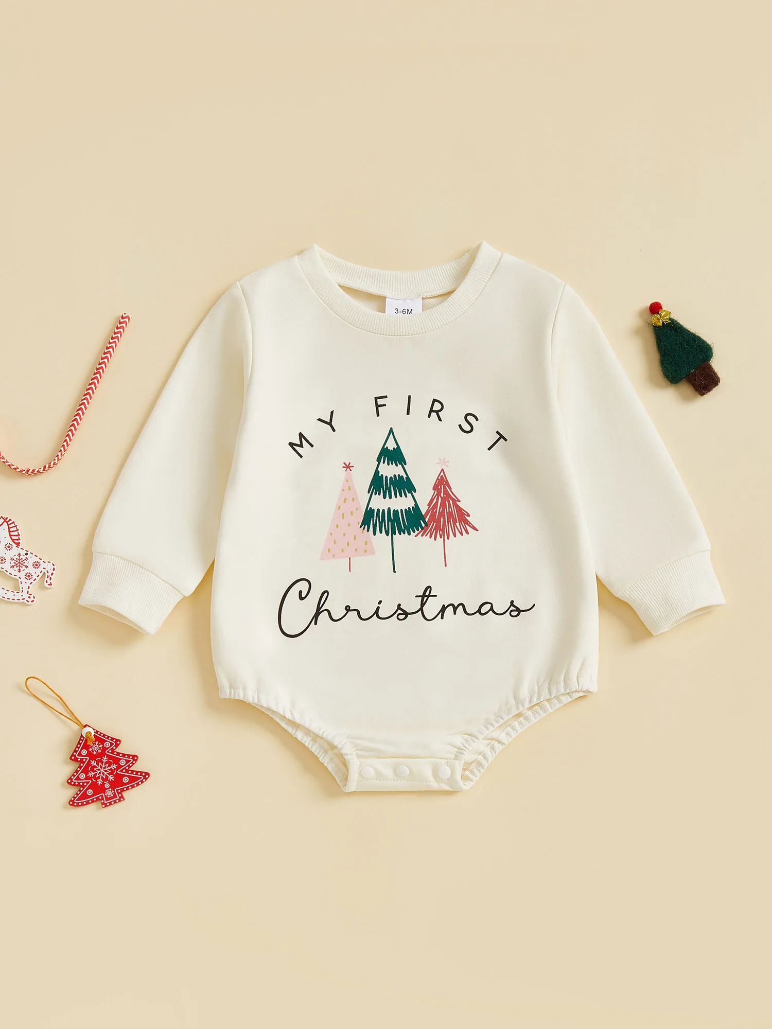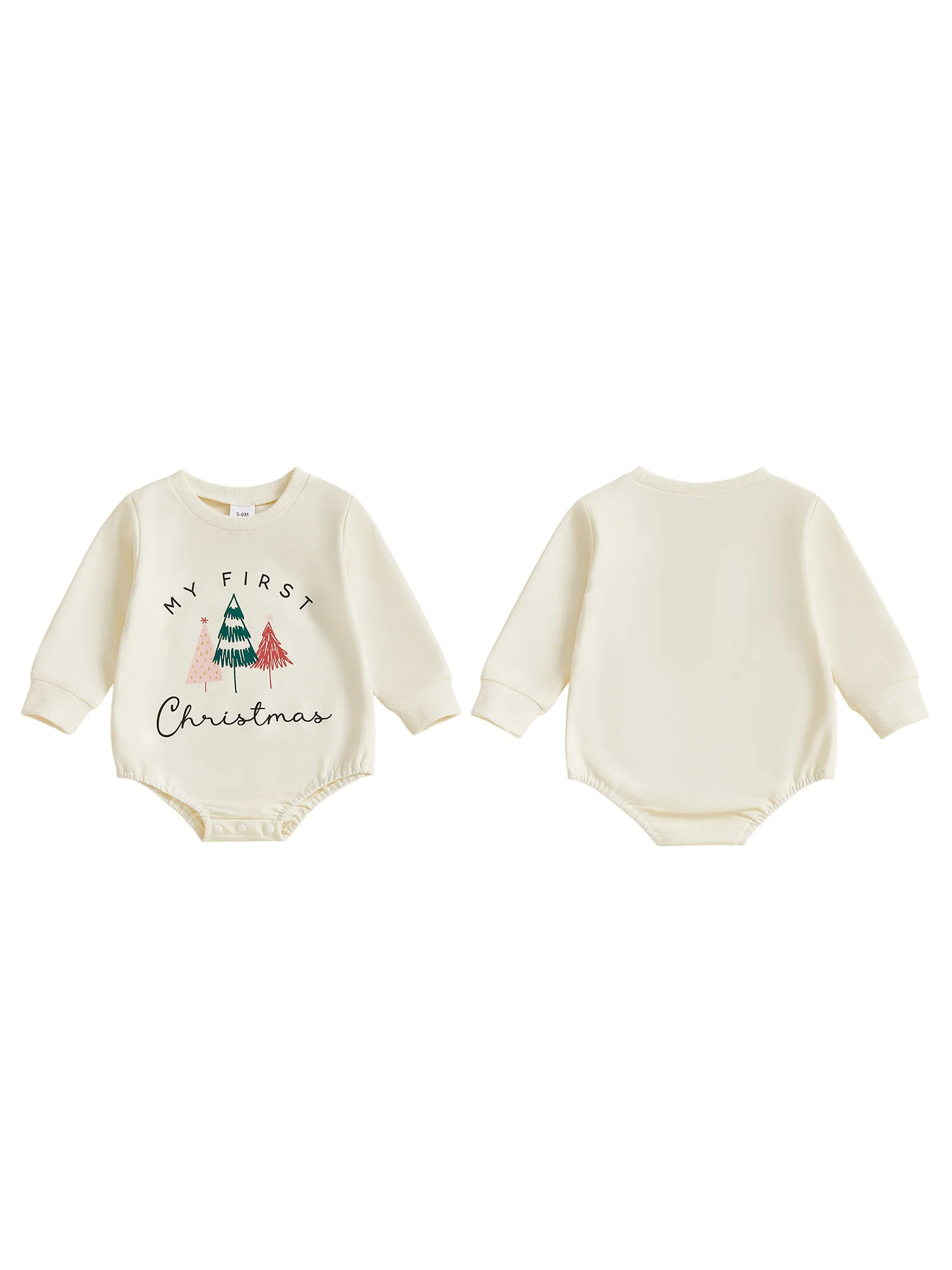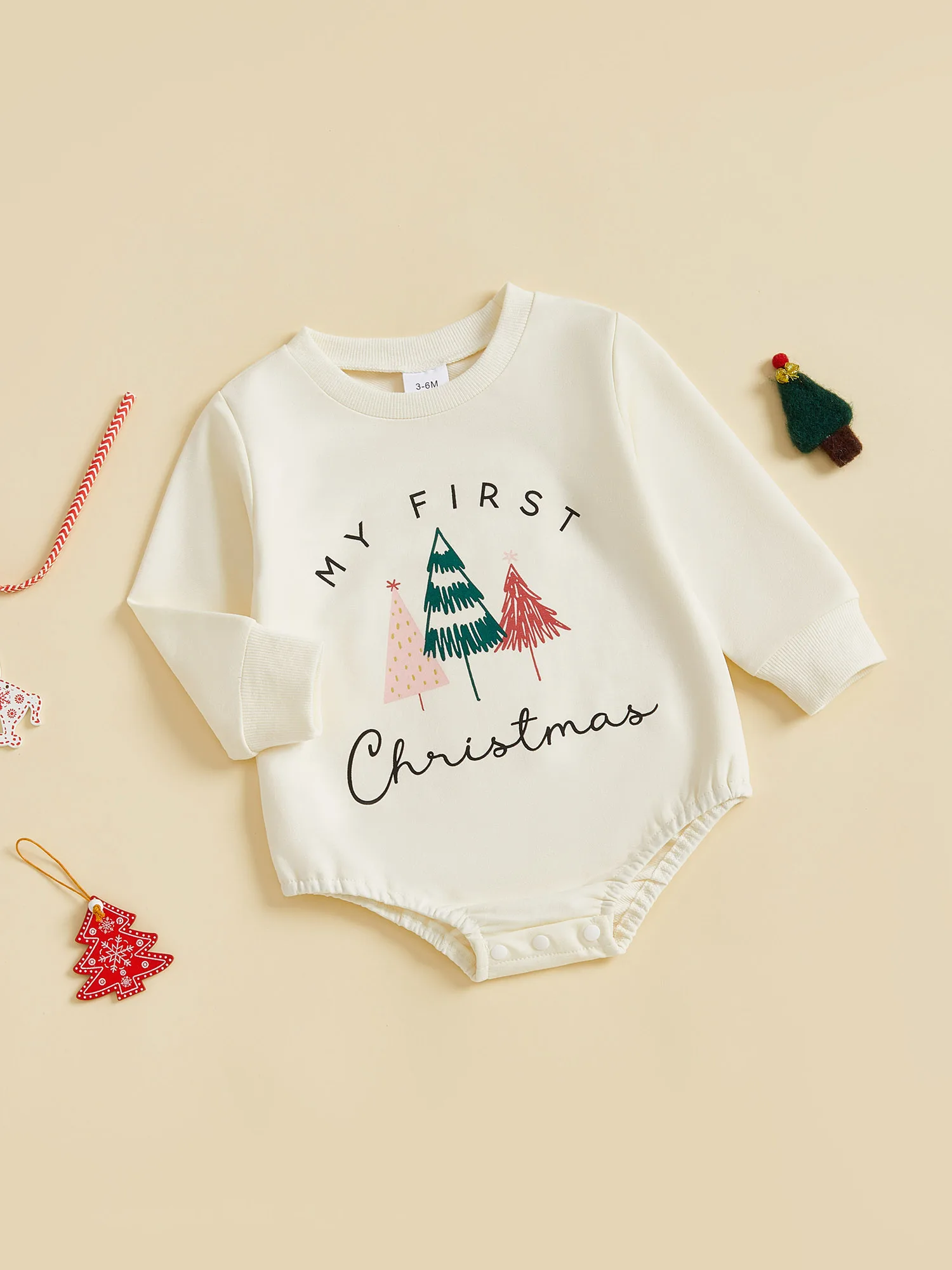 Mamelucos navideños para bebé, lindo mono de manga larga con cuello redondo y estampado de árbol con letras