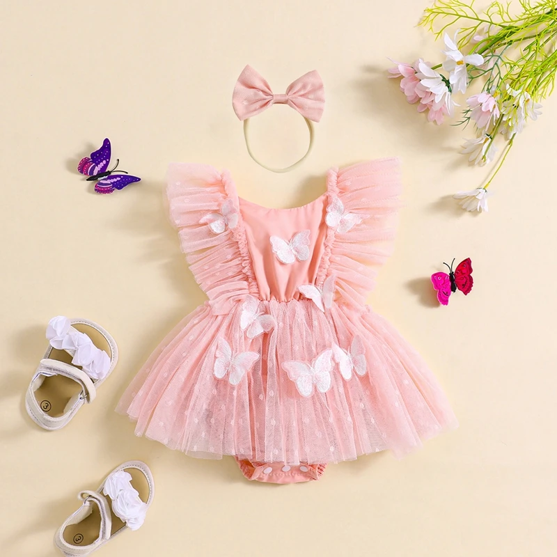 Comprar SUNSIOM-Mono de malla con manga de mariposa 3D para niña, Pelele con lazo, diadema, conjunto de verano para recién nacido, 2 piezas