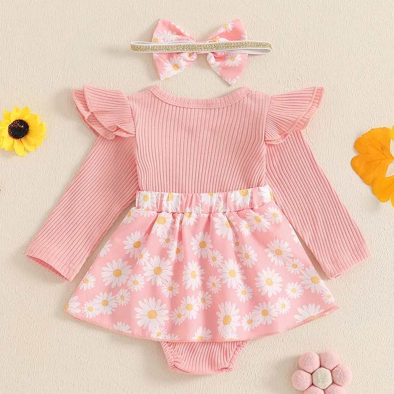 Comprar SUNSIOM-Pelele con diadema para niña, vestido de manga larga con cuello redondo, estampado de flores, trajes de primavera y otoño de 0 a 18 meses