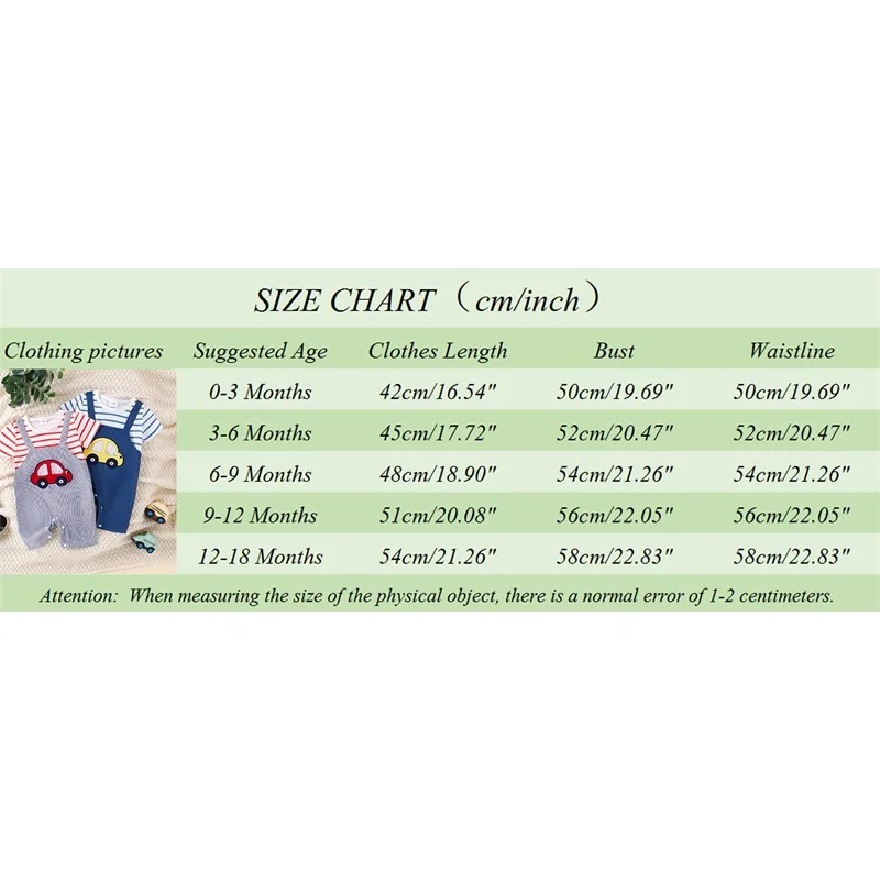 Pelele de manga corta para bebé, cuello redondo, Parche de coche a rayas, mono falso de dos piezas, ropa de verano para niño pequeñoTamaño (cm)0-3 M Longitud: 42 Busto: 50 Cintura: 50 Edad recomendada: 0-3 meses3-6 M Largo: 45 Busto: 52 Cintura: 52 Edad recomendada: 3-6 meses6-9 M Longitud: 48 Busto: 54 Cintura: 54 Edad recomendada: 6-9 meses9-12 M Longitud: 51 Busto: 56 Cintura: 56 Edad recomendada: 9-12 meses12-18 M Largo: 54 Busto: 58 Cintura: 58 Edad recomendada: 12-18 mesesTamaño (pulgadas)0-3 M Longitud: 16,54 Busto: 19,68 Cintura: 19,68 Edad recomendada: 0-3 meses3-6 M Longitud: 17,72 Busto: 20,47 Cintura: 20,47 Edad recomendada: 3-6 meses6-9 M Largo: 18,9 Busto: 21,26 Cintura: 21,26 Edad recomendada: 6-9 meses9-12 M Longitud: 20,08 Busto: 22,05 Cintura: 22,05 Edad recomendada: 9-12 meses12-18 M Longitud: 21,26 Busto: 22,83 Cintura: 22,83 Edad recomendada: 12-18 mesesEspecificación:Materiales: poliéster 100%Patrón: rayas, apliques de parche para cocheColor: Azul/RojoTamaño: 0-3 meses, 3-6 meses, 6-9 meses, 9-12 meses, 12-18 mesesManga: manga cortaGénero: bebé niñoContenido del paquete1 * mamelucoNota:1. Por favor, comprenda que puede haber una desviación de 1-2 cm.2. a la iluminación y los monitores Debido, hay una ligera diferencia entre la imagen y el artículo real.Promesa:Si el producto tiene algún problema de calidad, no dude en contactarnos, le ayudaremos a resolver el problema lo más rápido posible.