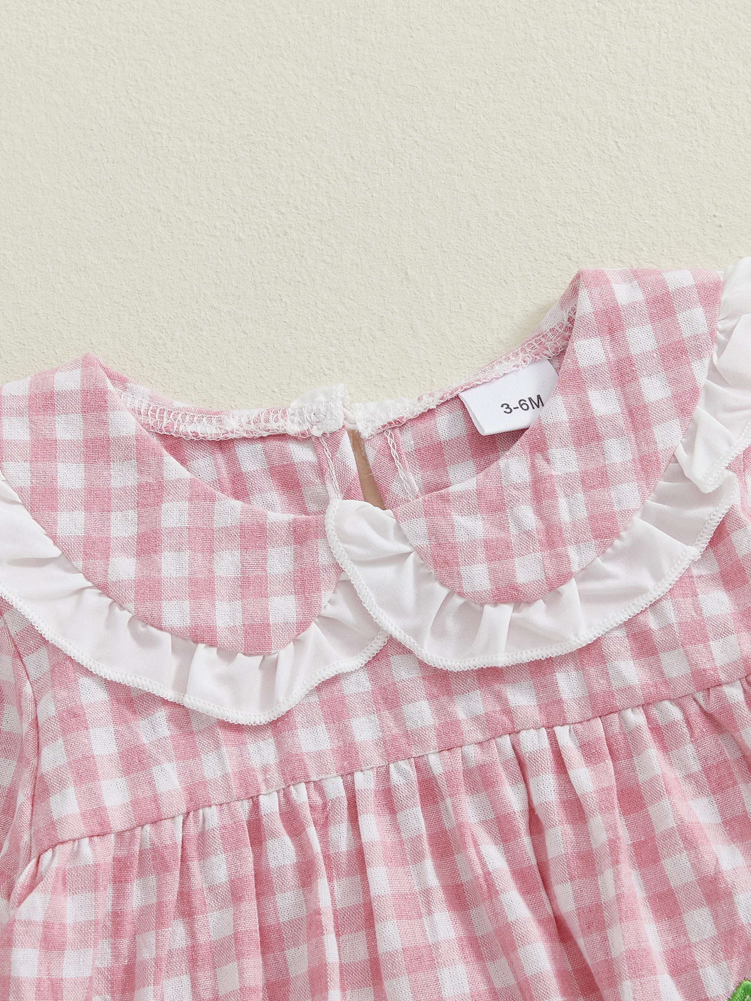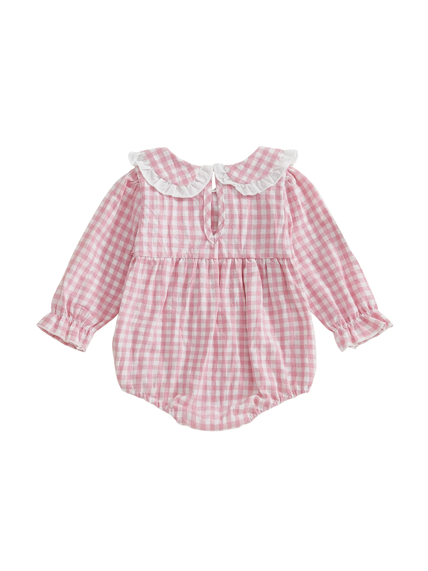 Especificación Nombre del artículo: mameluco para niñas Color rosa Tamaño: 0-3 meses, 3-6 meses, 6-12 meses, 12-18 meses Material: 65% algodón, 35% poliéster Patrón: Cuadros Collar: Collar de muñeca Manga: manga larga